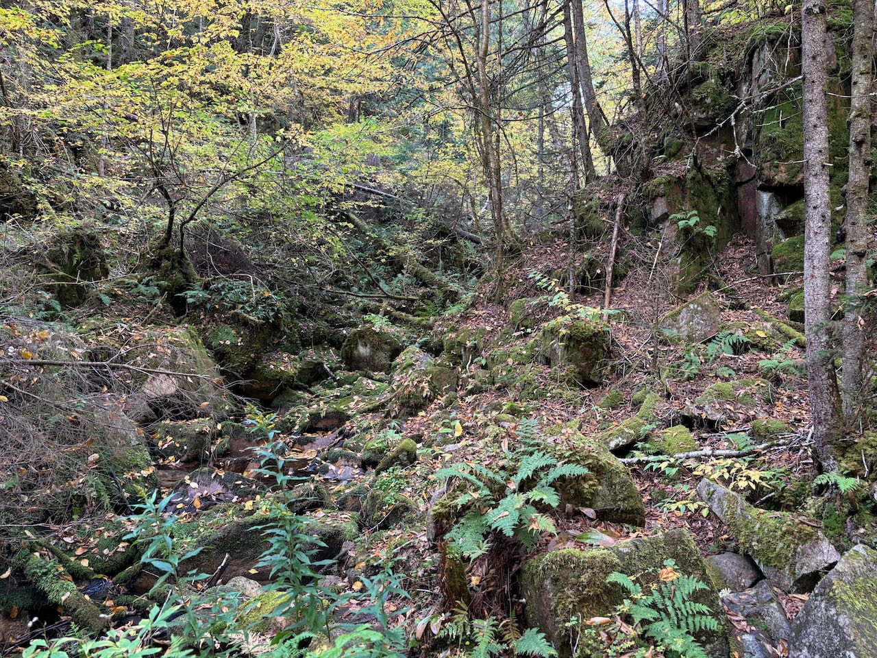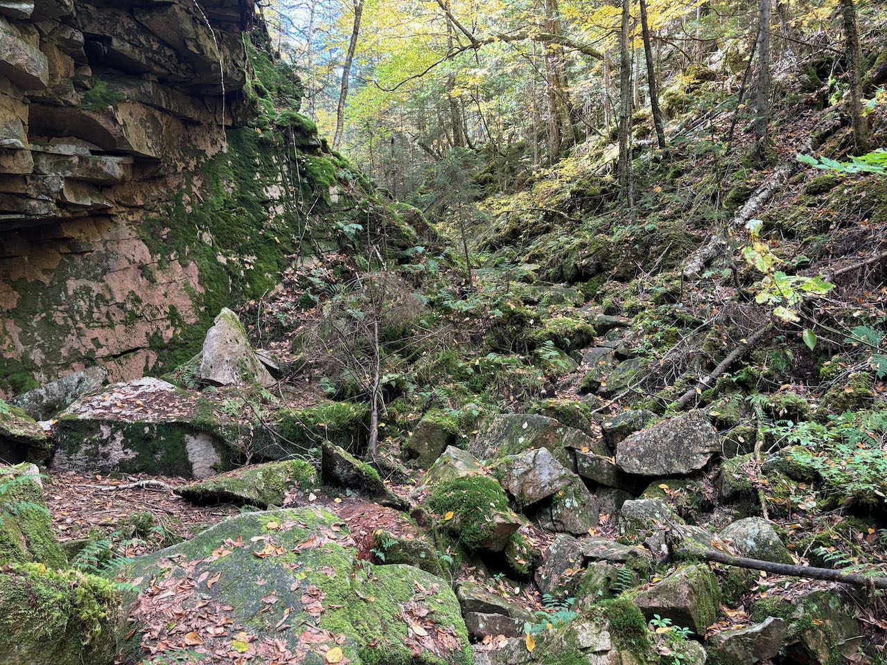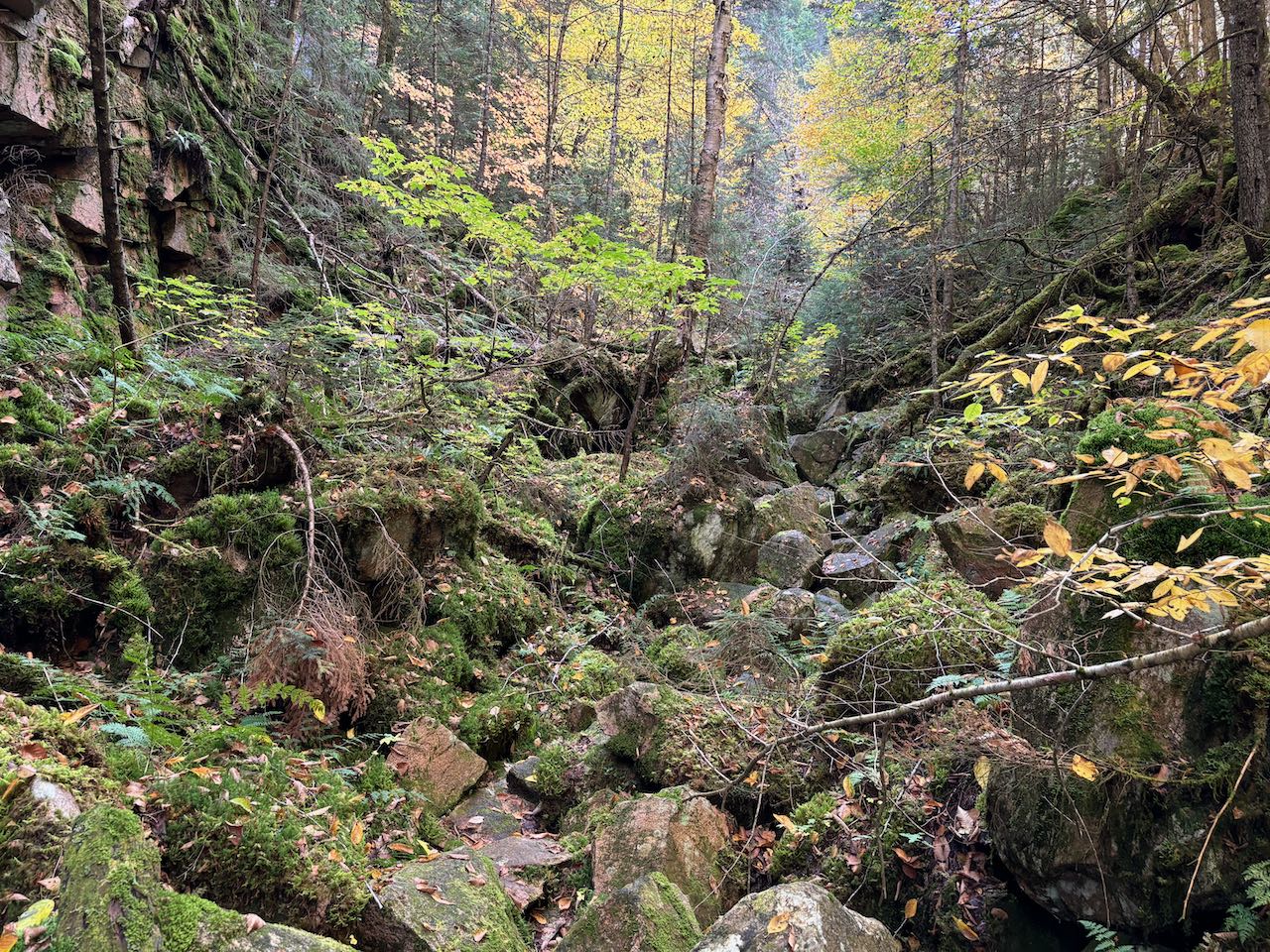 About the Hike: You can probably guess that something is trying be communicated by the name of this place - Devil's Hopyard ("playground"). It's a bizarre-looking, rather inaccessible canyon of sorts, and as typical in the White Mountains, found in an unexpected place where the terrain is otherwise gentle. The difficulty of hiking into Devil's Hopyard is hard to gauge, as it can be left to each visitor to choose their own adventure. Thus, we've ranked it as easy - all that's required to experience some of its unusually captivating environment is a simple walk through the woods. If you choose to venture all the way into the gorge, be warned - the trail clambers over mossy and slick boulders with deep holes between them. It's a hostile area for hiking, but if you make it to the end of the trail you'll find some wild delights in its towering cliffs and underground stream.