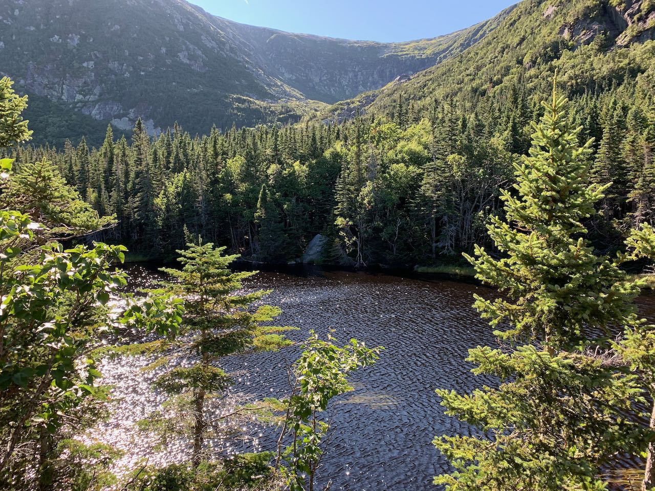 Less than 0.1 miles beyond this junction, you'll approach the main hub of the Hermit Lake shelters. Look for a trail taking off to the right which leads 200 feet up a small bank and along the shore of Hermit Lake. The waterbody itself is rather modest, including in size, but its beauty when taken with the views over the treetops of the rising ravine walls is unparalleled. Paths criss-cross this area toward various campsites, and a beaten path leads around the little lake, offering the opportunity for exploration. Continuing on the main trail, you'll quickly arrive in a clearing around the main building for the Hermit Lake shelters. Walk past it and follow the signs to continue on Tuckerman Ravine Trail (take care to bear left when returning back through this area, as another main thoroughfare leads downhill to more camps). Walk through a small patch of trees and come to a fence alongside an even tinier waterbody. From the grassy shoreline, enjoy even more open views ahead to the magnificent headwall of the ravine. Look closely to see the waterfalls careening over the many cliffs and ledges, sometimes called the Fall of a Thousand Streams.