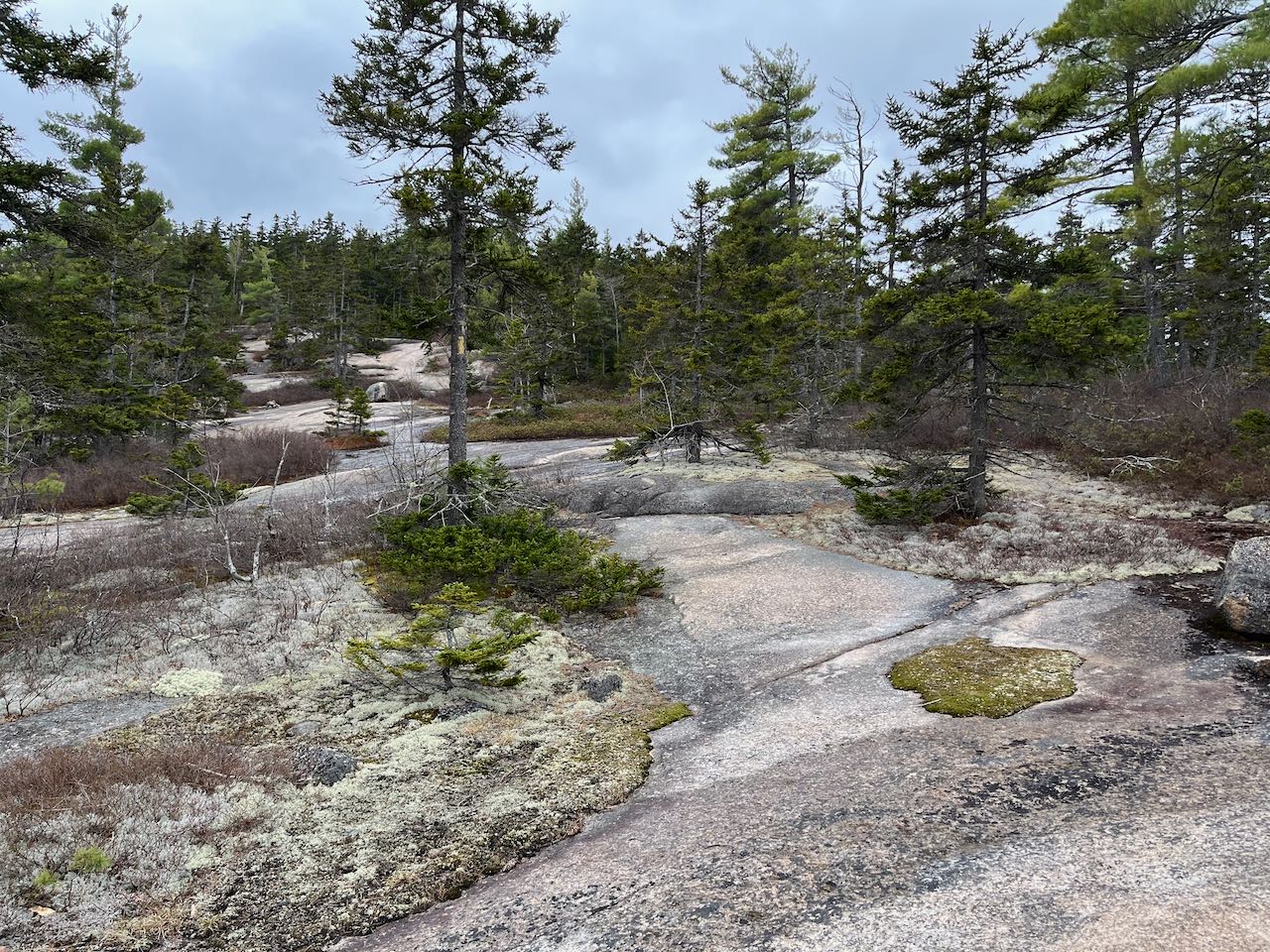 As the trail rounds the top of the mountain, it ducks back into the trees, and runs across the flat top. Look on the left as you go through the wooded section for a ledge opening with a very faint path leading out to it. This ledge provides the most open view on the mountain, facing to the southeast. Pleasant Mountain in Maine is seen from here, along with the low range around Cragged Mountain in Eaton and Freedom. The trail reaches the more open high point after 0.4 miles from the start of the ledges. Views are more limited here. Head straight across as the trail beelines across a long expanse of open rock. It begins to descend more steeply, zig-zagging down the ledges on the south side of the summit, with views over the treetops toward the Ossipee Range and Mt. Chocorua. After about a quarter mile and a few steep ledgy pitches, the trail dips down into the forest and continues its steady descent through rocky terrain. In another 0.3 miles, a side path leads a few steps to the left to a more open southeasterly outlook, offering a better view down over nearby Iona Lake and Whitton Pond. The trail drops directly down the southern ridge of the mountain, in similar terrain as what was seen on the ascent. It starts to moderate after 0.45 miles, and in another 0.3 miles crosses the brook near the beginning of the loop, reaching the junction in another 0.1. Return the way you came.