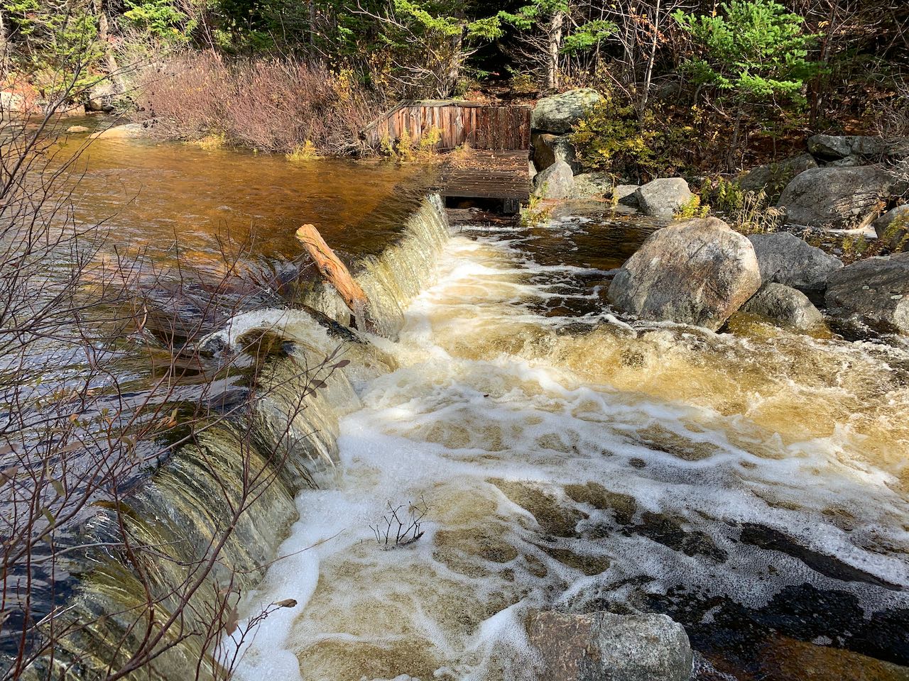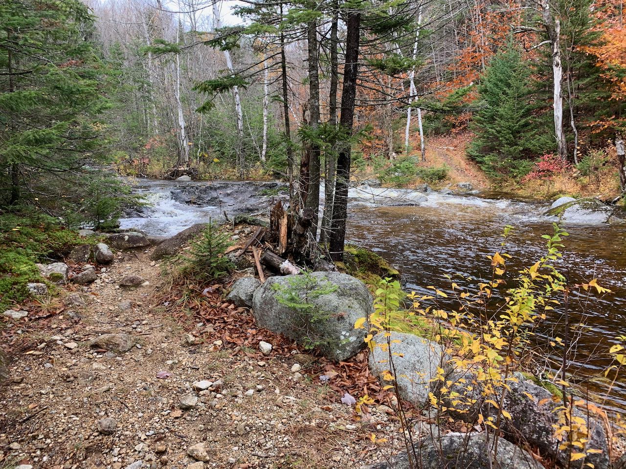 From the parking area, start walking up the gated woods road, which soon approaches Pond Brook, a wide and voluminous waterway. After 0.2 miles, pass a bridge on a privately owned road crossing the river on the right. Several places along the way are close enough to walk out to the brook and see a number of cascades, which are powerful in heavy water flow. In another 0.3 miles, make a right fork onto Bennett Street Trail. This narrower forest path dips down to cross a little brook, then runs mostly level through open woods for 0.35 miles to cross a slightly larger brook. Wandering into darker spruce woods, reach an intersection with Gleason Trail after 0.2 miles more. Bear right and stay on Bennett Street Trail, which soon approaches and runs along the top of the rounded bank above Pond Brook. In just over 0.1 miles, it passes a low cascade and pool and crosses another brook just above where it empties into Pond Brook. The trail continues to stay relatively close by the brook, and in another 0.15 miles, comes near a broad cascade into a sizeable, stone-rimmed pool. The trail then swings uphill away from the brook for a bit and descends to rejoin it, reaching the base of Great Falls after a quarter mile. Here you have a view upstream through the narrow channel in the angled rock walls which constrain the full force of the brook into Great Falls. Though lacking in height, the power of the falls is inspiring. Two large pools swirl below the falls, with a small cascade in between them. Just ahead on the trail, you can walk around to the top of the falls and look down into the miniature gorge.