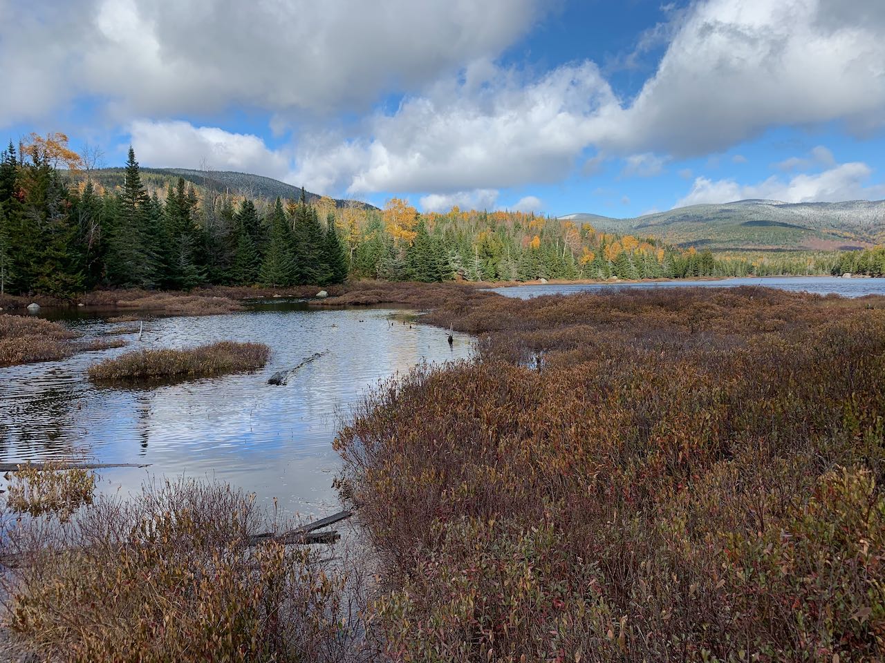 The trail continues right alongside the brook past the falls, and in 0.1 miles crosses a smaller brook just above its mouth in Pond Brook. It swings to the left and follows this brook uphill for 0.2 miles until crossing it back again. It then makes a jog away from the brook and turns to climb uphill more steeply, with one section of stone steps, for another 0.2 miles before reaching the junction with Flat Mountain Pond Trail. This is the trail you started on, although if you had stayed on it, it would have taken longer to get to this point. With the steepest part of the hike over, turn right onto this trail, which follows the track of an old logging railroad. In a very short distance, the trail crosses a nameless brook originating high up on Sandwich Dome, which the trail now traverses the lower slopes of. It swings out to the right and makes a wide turn around the lower end of an eastern ridge of Sandwich Dome, then heads straight along the hillside deeper and deeper into a remote valley around a branch of Pond Brook. The wide trail ascends at easy grades, crossing a couple more small brooks, with increasingly rocky footing. About 1.1 miles from the junction, it approaches and then crosses the branch of Pond Brook it has been following at a ledgy hummock in the brook bed. After crossing, it stays on the opposite side for less than 0.1 miles before crossing back. If the water level is too high to cross the brooks here, it can be easily circumvented by walking through the woods for a short distance to bypass this section. In a quarter mile, the trail comes into a boggy clearing at the headwaters of this brook, which can flood in wetter times. With views of the hillsides around, it crosses the brook and meadow and makes a 180-degree turn to start heading back out the valley on the other side. Again, avoid this trail with recent wet weather or else you may have to make a tricky detour through the woods around the bog.