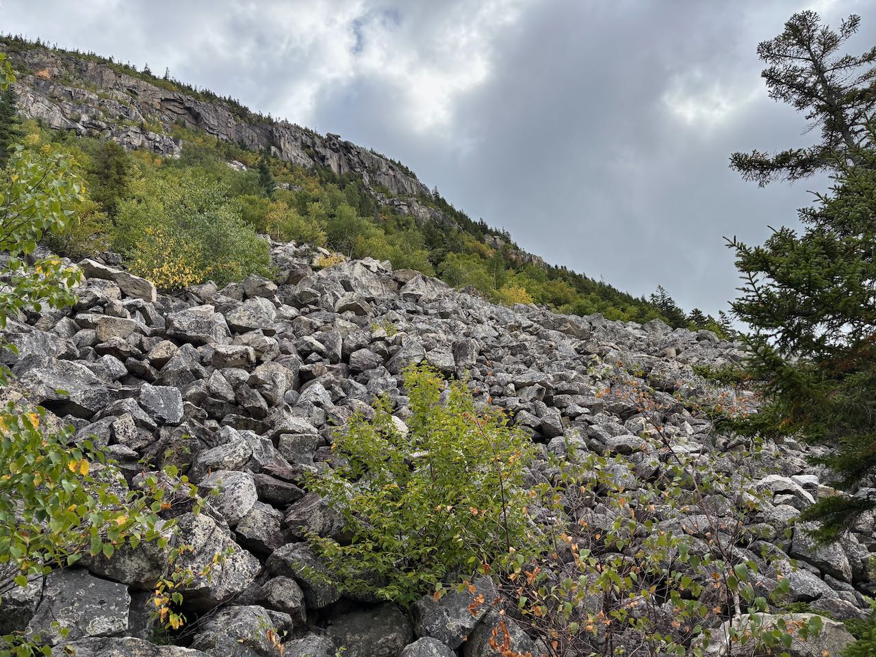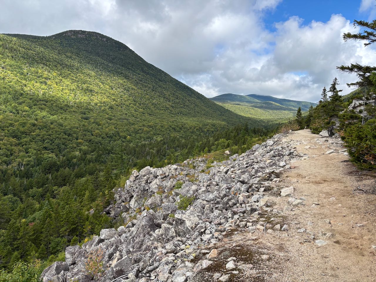 Finally, 1.2 miles from the trail junction, the trail passes some piled stones and breaks out of the forest into the majestic sub-alpine slopes of Whitewall Mountain. The gravel trail, still on the old railroad bed, cuts through a row of trees midslope. Above you to the left, the boulders cascade down from the towering cliffs of Whitewall, and below to the right, the enormous pile rolls down toward the bottom of the valley. Hardy trees scatter themselves amongst the rocks. As you walk, views open up and improve on both sides. Across the valley you look out to the ridge leading up to Zeacliff, the summit of which is now behind you to the right. As you get further along the trail, you can also see past it back to Zeale Ridge and Mt. Hale. After 0.1 miles in the open, the trail reaches the junction with Zeacliff Trail. By this point you can also see down the valley to the south toward Shoal Pond Ridge and Mt. Hancock in the distance. Continue straight on Ethan Pond Trail and in another 0.1 miles or so you'll come to a wide open gravel bank where you can enjoy the best unobstructed views of the notch. At this point you can see Mt. Carrigain rising above the trail straight ahead. Here you are directly below some of the highest cliffs near the summit of Whitewall, and you can also see clearly down to the bottom of the valley, getting the full sweep of the view. This is a good place to end your journey and head back after admiring the scenery. The trail returns into the forest another 0.1 miles beyond. If you have plenty of time and are still feeling adventurous, you can also extend your hike to visit Thoreau Falls. Take the Ethan Pond Trail 0.7 miles further to the junction with Thoreau Falls Trail, turn right, and continue 0.1 miles to the top of the falls. The falls are described in detail on the separate page, which details a route starting from Crawford Notch, but Zealand Notch is an excellent route to take to access them as well. This extra section would add 1.6 miles and 130 feet of climbing round trip.