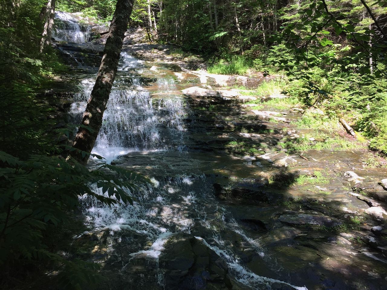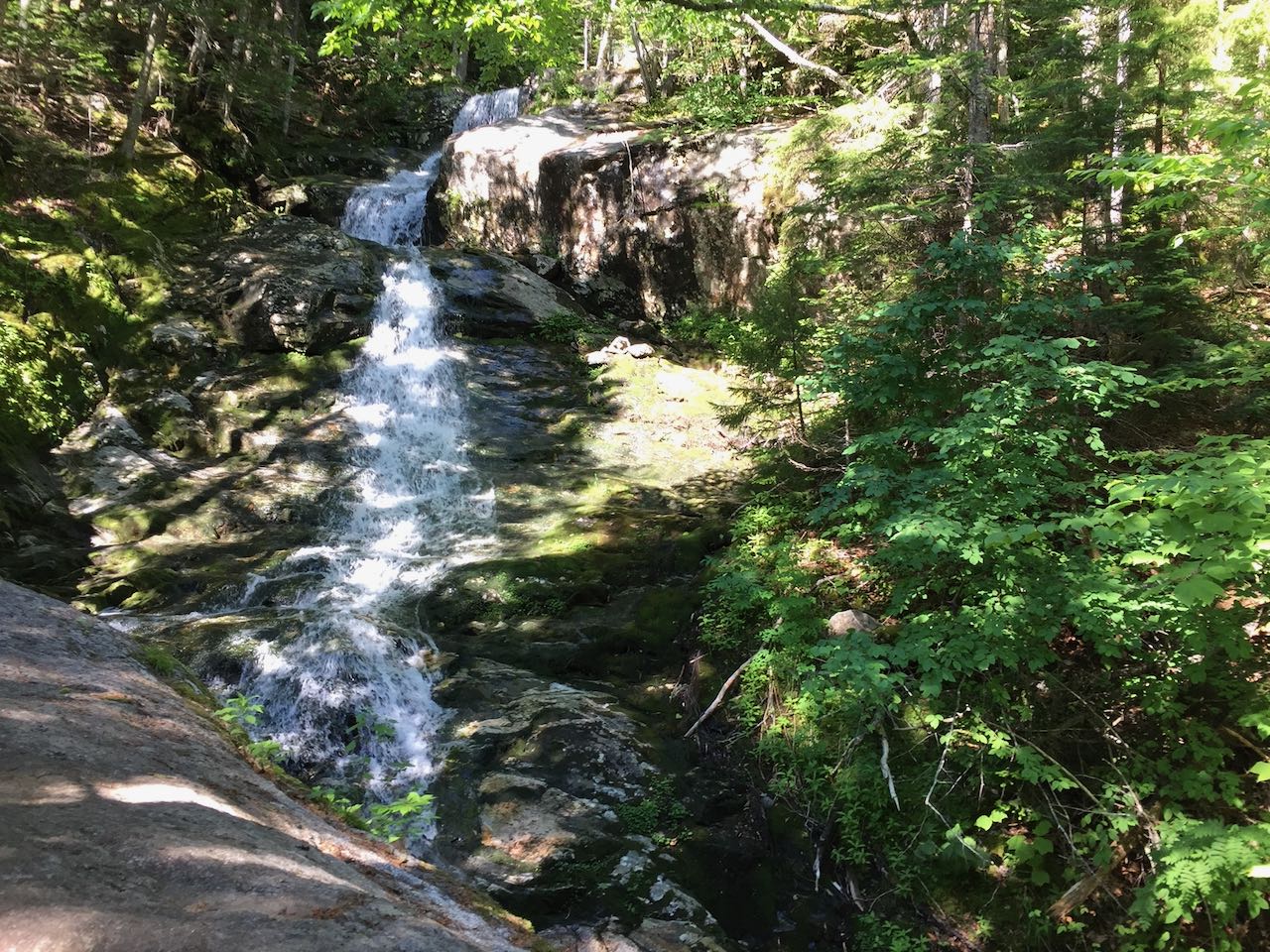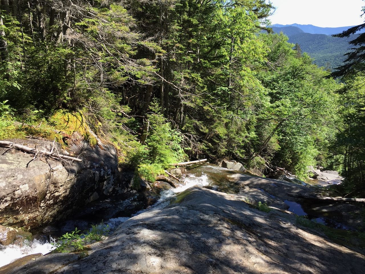 After about 0.3 miles of difficult climbing, the trail reaches an opening right beside the brook, where a plunge-type waterfall is right below you, and you have a clear view upstream a ways to a beautiful, fanning waterfall. Continuing further up the trail, you'll soon pass closer to this waterfall and be able to view it through the trees. More wooden steps follow, including one section that resembles a spiral staircase around a ledge wall, with a view to a cool water chute below. More of the same type of terrain continues for a good distance. Just after passing a lovely horsetail-style waterfall, the trail climbs an impressively built staircase over a long, slippery ledge. Above here, the trail comes out to some open areas in the brook where you can stand beside low-angle cascades and enjoy some views out to the Franconia Range in the distance. Not far beyond this point is where the trail begins to pull away from the brook, just after a long and broad water slide. This will be your turnaround point, 0.7 miles from the beginning of the cascades, and you can revist each stop one more time before leaving!