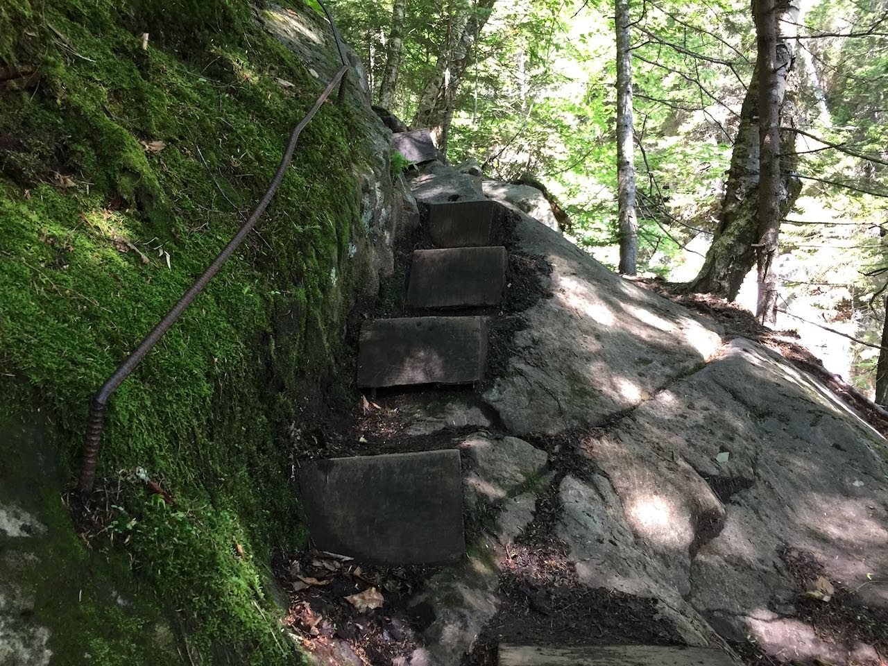 To start your hike, navigate to the kisok at the north side of the parking area (closer toward the pond), and follow the trail to the left. The trail approaches the south end of Beaver Pond, visible through the trees (a scenic wayside just up the road provides a better view), and after 0.1 miles crosses Beaver Brook in a gravelly area just as it flows into the pond. The trail remains relatively level for the next 0.2 miles. It crosses back over Beaver Brook and two other smaller streams on wooden bridges and passes a sign with trail distances and a warning about the rugged nature of the trail. In another 0.1 miles after it begins to incline uphill, the trail opens up to a good view of the very lowest cascade in the chain. The impressive waterfall extends above and below the viewpoint on the trail, flowing down into a little gorge. Just past this, the trail steepens swiftly and you'll encounter the first set of wooden steps. The trail remains close beside the brook as it ascends. The brookbed which forms the cascades is composed of continuous ledge, and the trail surface is a large portion of ledge as well. The trail follows up alongside a string of lower angle, fanning cascades visible through the trees and then comes out to a clear view of a particularly large and wide cascade over an interesting layered ledge. More steps and rungs assist your ascent as you climb through several rock outcrops which require grabbing onto handholds to pull yourself up. You won't have a moment to lose interest in the scenery as you climb, as the brook continues to introduce new scenic waterfalls. Low water-loving vegetation and algaes abound on the long ledge ramps which the brook tumbles down.