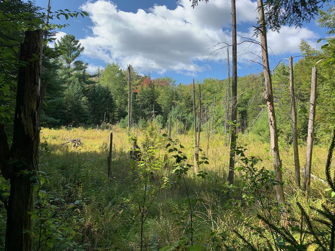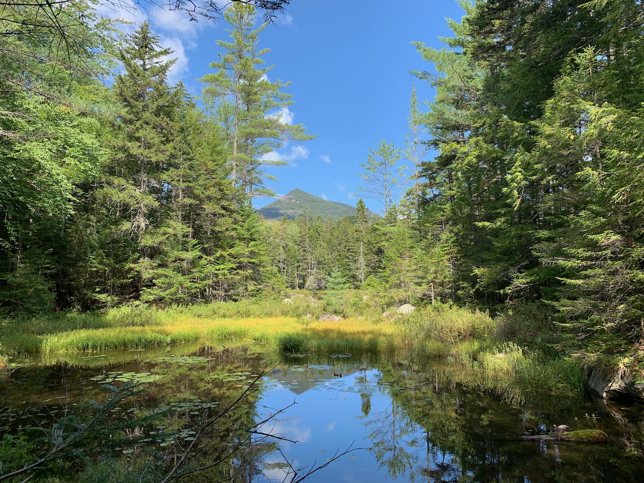 The path meanders around along the edge of the tiny Ice Pond, now only a snag-filled marsh, making many twists and turns. After 0.2 miles, the trail straightens out and heads up the valley around Birch Island Brook. Soon, the brook comes into view down a steep bank to the left. After another 0.3 miles, the trail passes a fork in the brook and crosses the smaller branch draining down from Black Pond. The trail follows this brook up to its source, crossing back over it less than 0.1 miles ahead, and then again 0.1 miles beyond that. After a final 0.1-mile stretch past the third crossing, the trail passes a stagnant pool at the outlet of the pond, hemmed in by reeds and lily pads, over which you can see the sharp peak on the south end of the Owl's Head Ridge. The path reaches the open water of Black Pond just a bit further and ends at a fine sitting rock on the shoreline, although an unofficial trail continues past this. The contemplative pond reflects the summit of Bondcliff, which rises majestically over the trees on clear days. A picturesque rocky point with a few tall trees extends into the water on the right side.