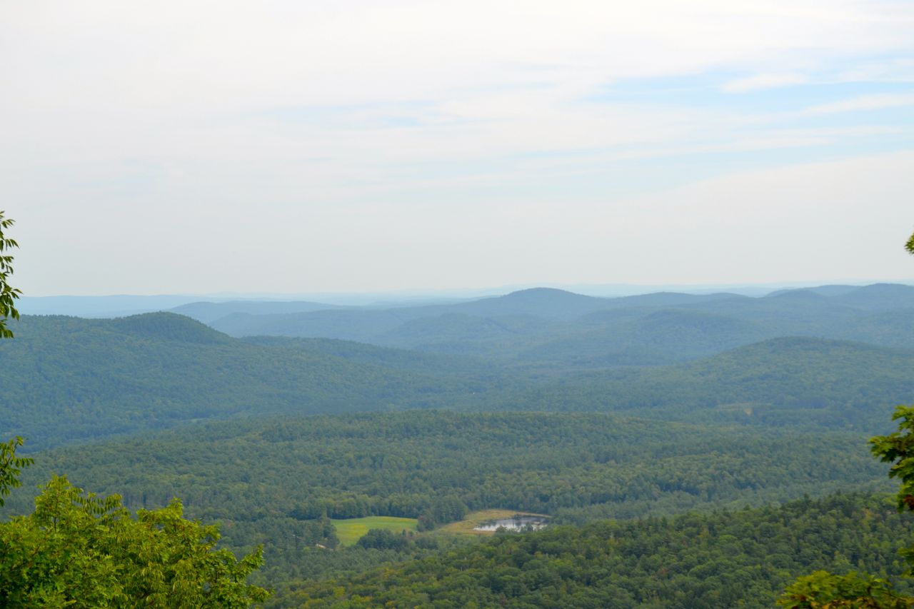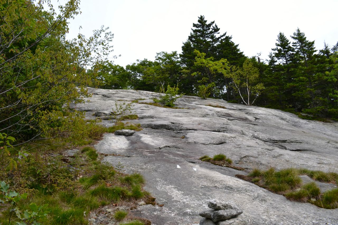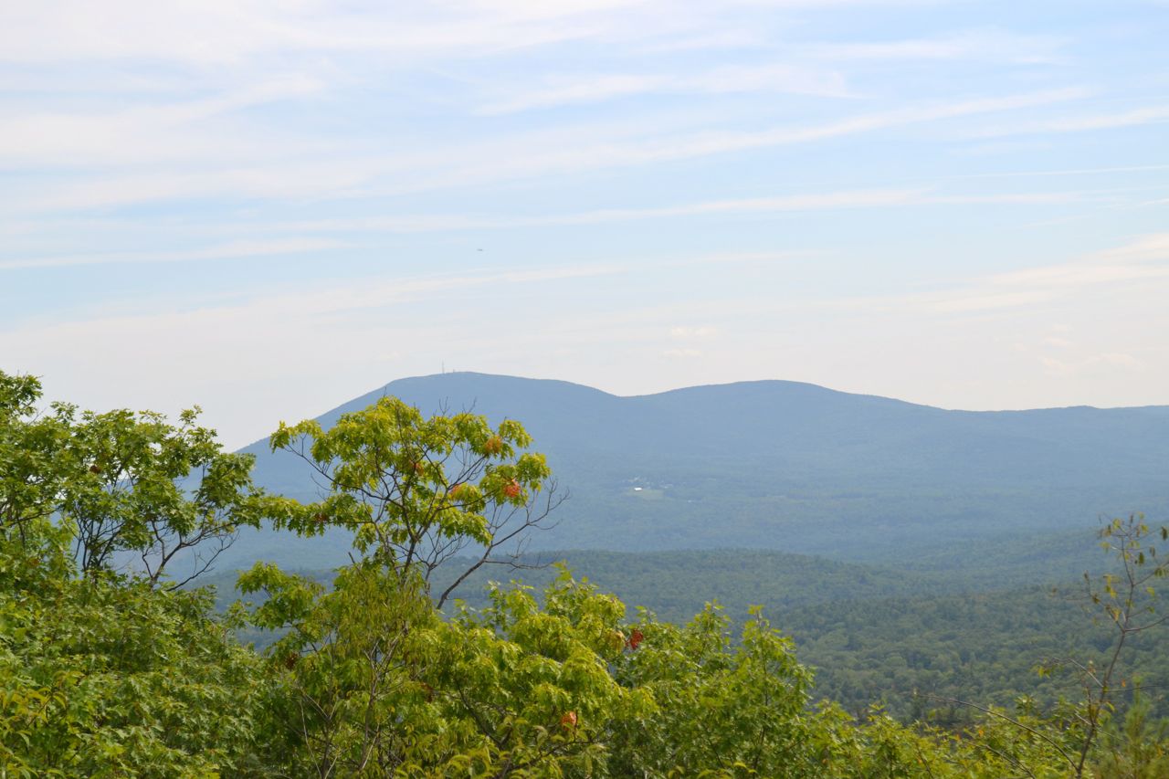 The are wide views over the treetops in two directions. Mt. Kearsarge and Mt. Sunapee are seen to the south, and Smarts Mountain is seen to the north. A spur path leads down to a second overlook facing southeast. At the back of the summit area is a granite bench.