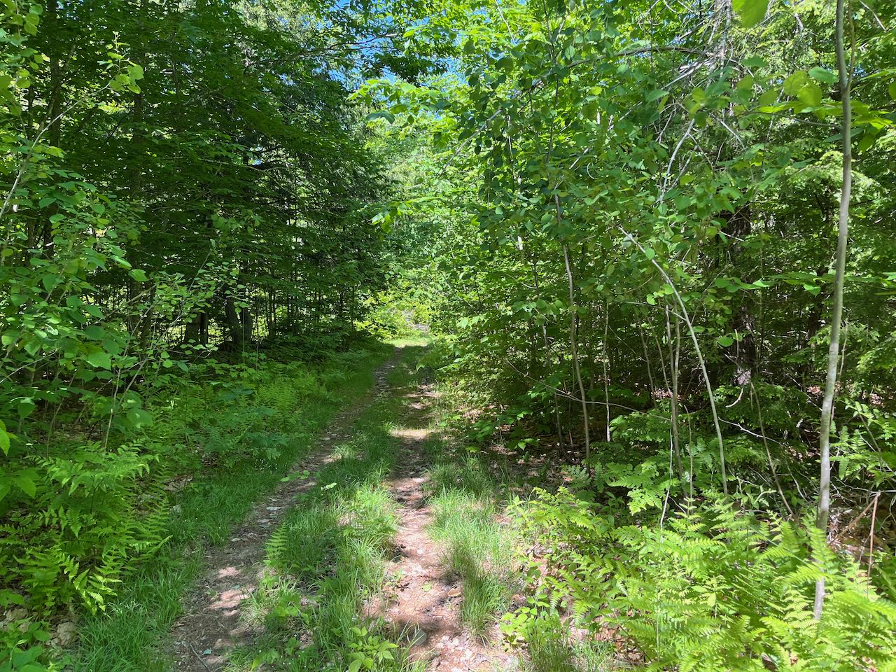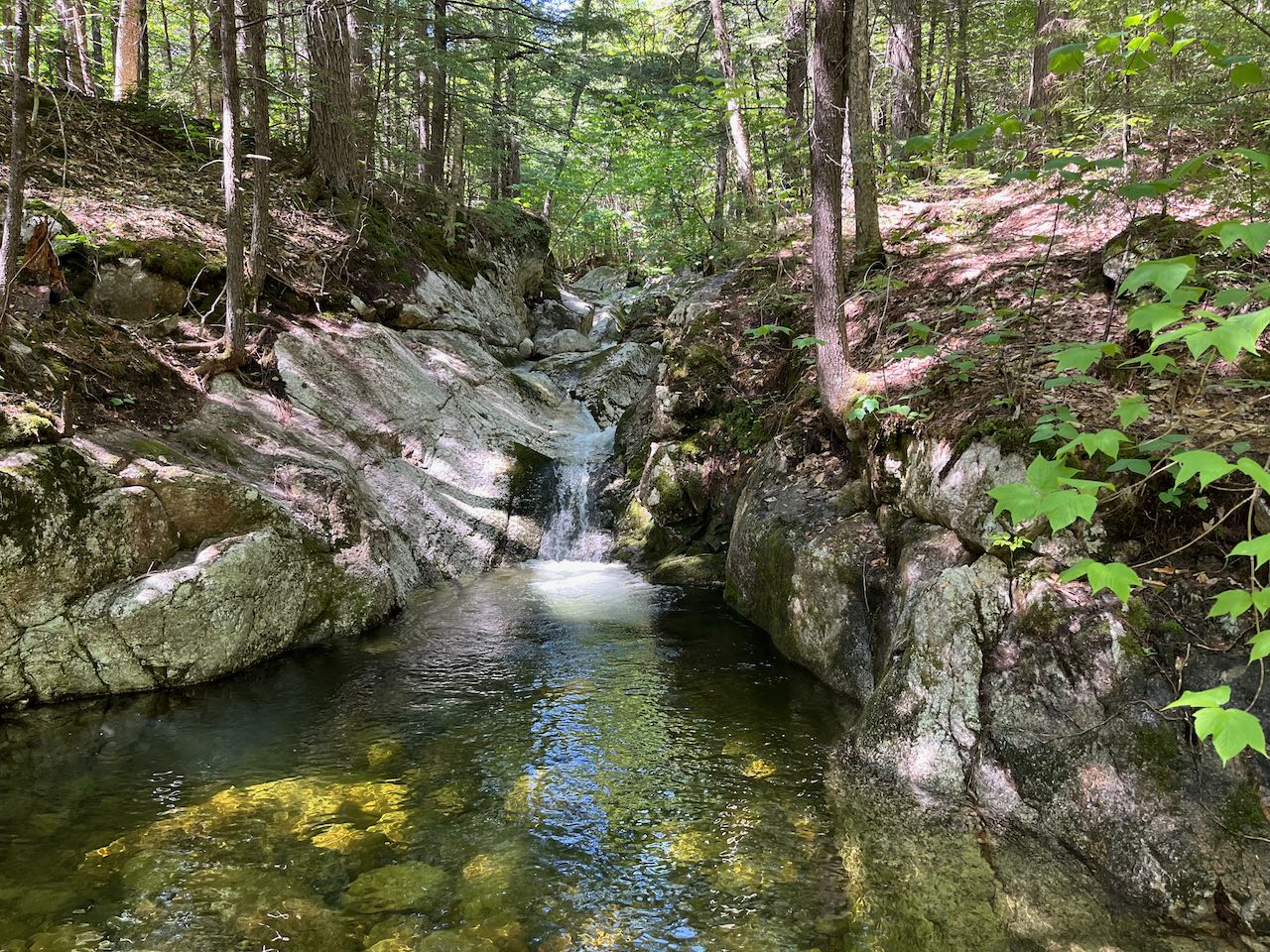 From the indistinct trailhead, follow the unmarked grassy road into the woods. This is the Mt. Meader Trail. The trail follows an old road and winds through a semi-cleared area before heading into the woods. After 0.4 miles, it joins up with Mill Brook and follows it upstream. The trail remains wide and gentle as it continues along the brook. It climbs easily for 0.45 miles before passing by some interesting cascades where the brook shoots through a narrow sluice carved into striated bedrock, just off the side of the trail. 0.15 miles further up the trail, bear left at a junction where a spur trail leads the final 0.1 miles to the main falls. They don't have one singular impressive drop, but the stream cascades sharply down a huge mass of ledge. It divides and twists as it flows down the open ledges, and you can explore upstream and down as the cascades trail off.