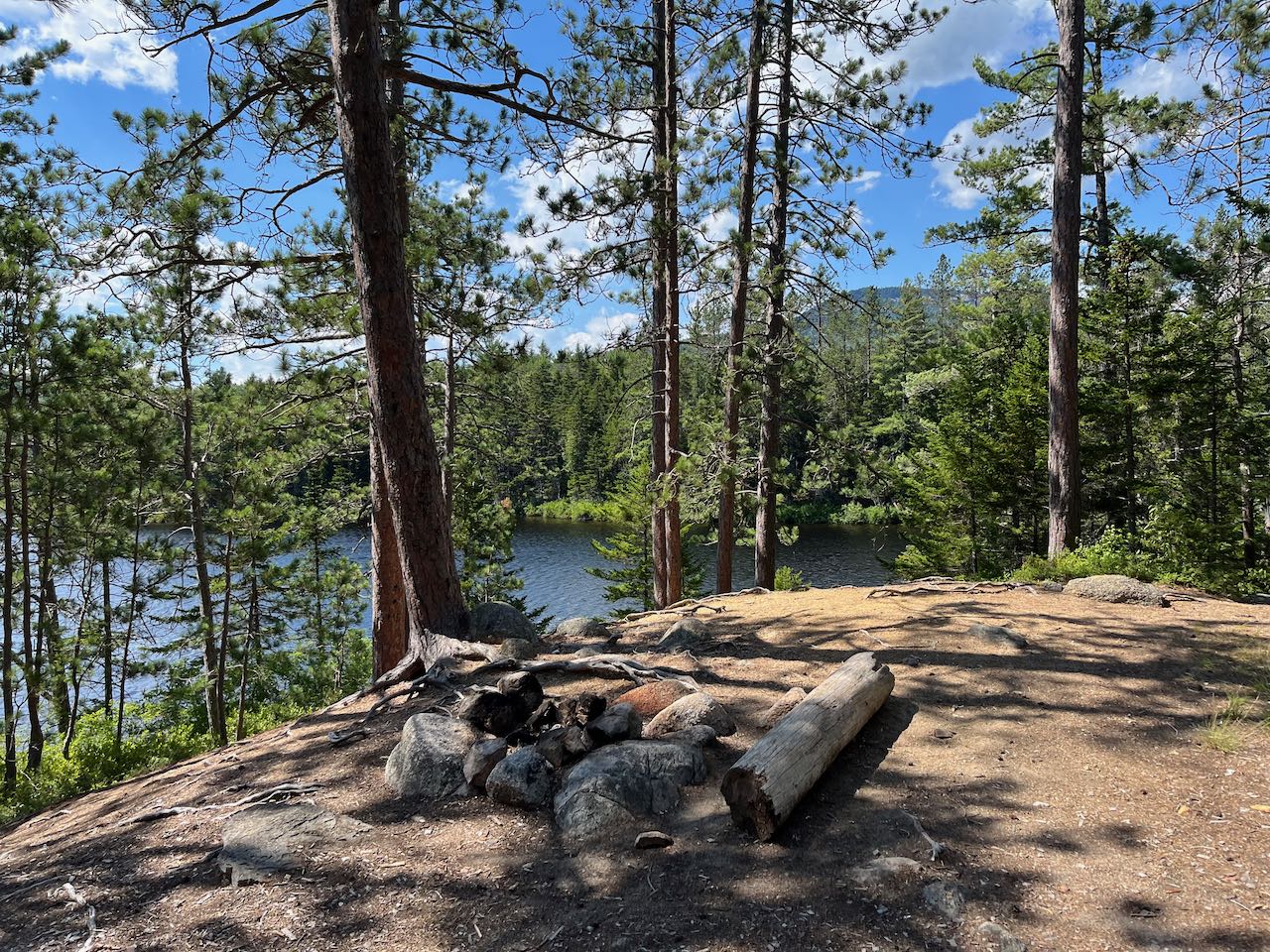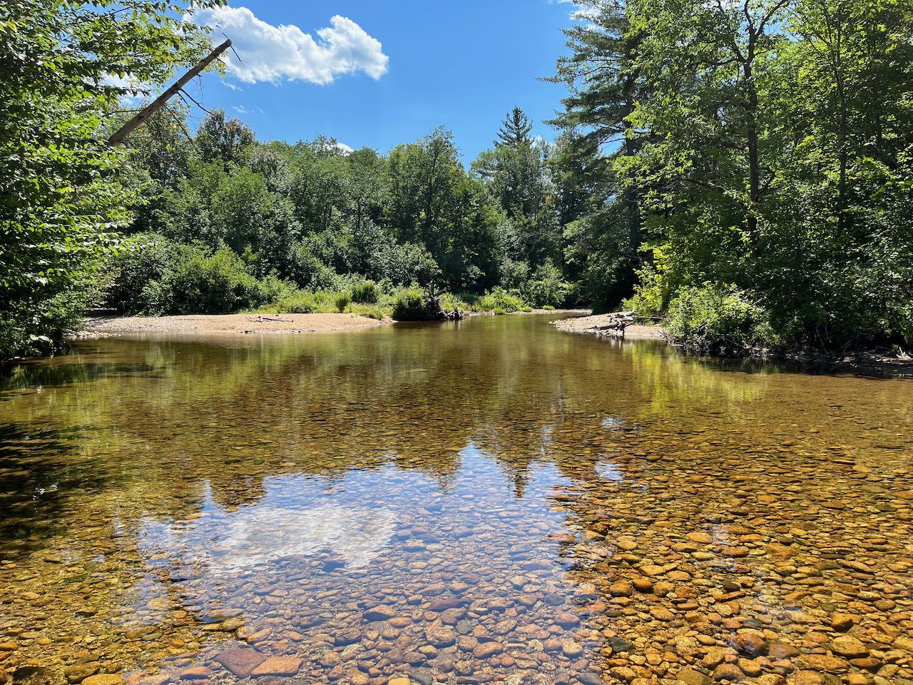 From the trailhead, walk past the row of boulders and drop down to the riverbank. When water is low, most of the river's channel will be dry, and there will only be a narrow and shallow section to wade across. Medium-sized smooth stones abound underfoot, so use caution. Look carefully for the trail on the other side as it enters the woods under overhanging boughs. It meanders through a sandy floodplain for 0.1 miles and then crosses another channel of the river where water is more sluggish and stagnant and which may also require getting your feet wet. Pick up the trail as it climbs up a brushy bank and heads back into the woods. It may be difficult to find in this section; it swings left and generally parallels the river. The pathway, carpeted with pine needles, leads over level ground for 0.15 miles to a trail junction, where a cross-country ski trail joins from the right. Now you can follow the blue diamonds for the next 0.4 miles as the trail remains perfectly level through mixed forest. Then, the ski trail splits off to the left, and the hiking trail mounts the first of the bog bridges through the huge wetland area.