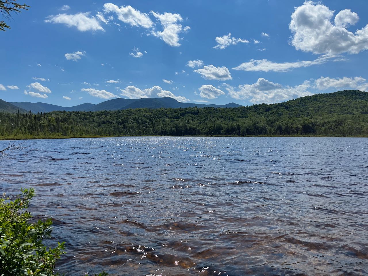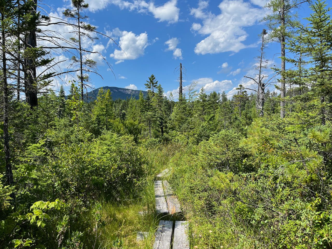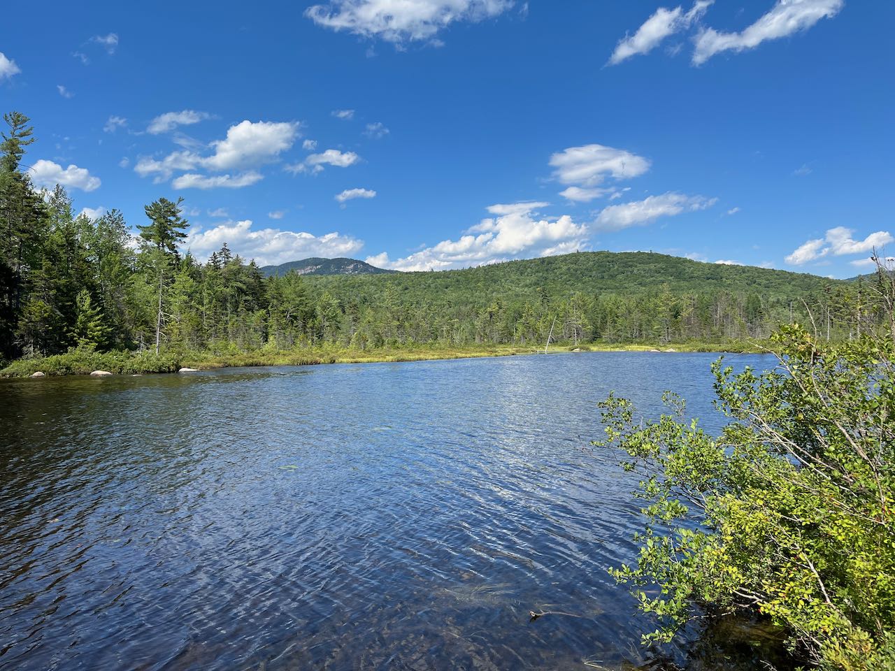 Enjoy the easy walk through this environment of unique vegetation and scattered views of the surrounding mountains. The trail is mostly closed in at first, but as you begin to approach the pond, the trees thin out and views appear, with Green's Cliff rising prominently in the distance. This scenic walk goes on for 0.35 miles before the boardwalk ends and the trail returns to firm ground. It climbs up to a prominent knoll near the northeast end of the pond, the only elevation change you'll notice for the entire walk from the river. From the clearing around the top of this hump, you can see through the trees over the water, but you can drop down to the water's edge to find the best views. Several paths lead down to different points on the shore of the pond, which are all worth exploring. The most open spots to the left offer a gorgeous view over the clear blue surface toward Mt. Tripyramid. It is presented from an unusual angle here in which you cannot see the three peaks. On the right side is Scaur Peak, and on the left side is the rolling Sleeper Ridge. In your immediate surroundings, you can look back over to the bog which the trail passed through to arrive here. Over the bog rise two pointy peaks, nearby Potash Mountain, and its much larger neighbor Mt. Passaconaway to the left. Points further to the right offer a view of the outlet end of the pond, where the rocky ledges of Owl's Cliff and Mt. Tremont rise behind.