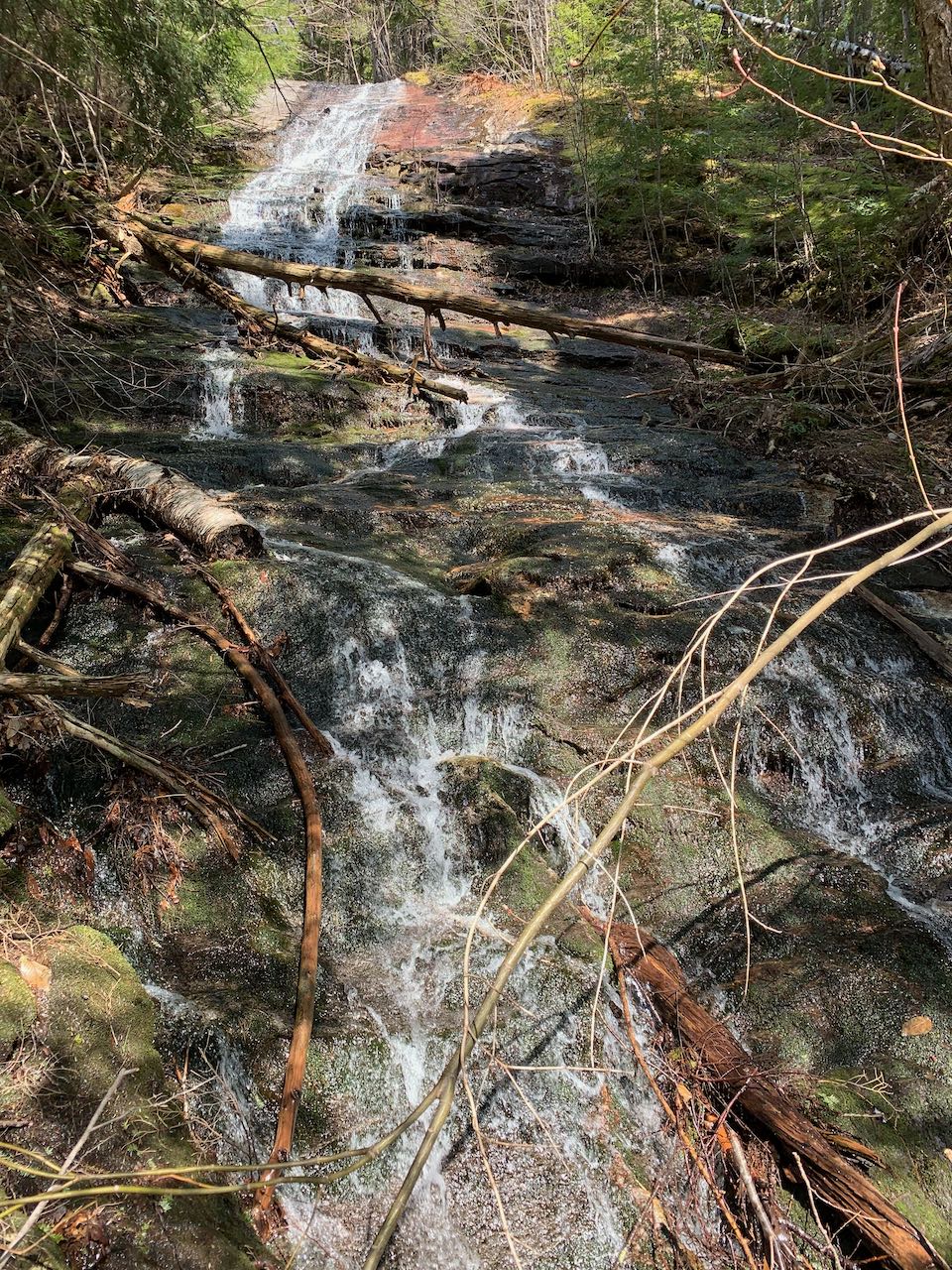 Begin your hike from the end of Mill Brook Road. Cross the planks over the brook (in place as of 2023) where a now dismantled bridge once provided further driving access down the road. Take the right fork of the logging road, which is now the Austin Brook Trail. The gravel road ascends lightly, following Austin Mill Brook in the ravine below. In 0.55 miles, the road passes through a clearing, where you can look ahead toward the rolling hills and see most of the height of Dryad Fall (though still the lower part is hidden in the trees!). Bring binoculars to get the most out of the experience. In another 0.3 miles, after crossing a couple small streams, you reach the original trailhead. The trail bears left onto an older logging road at a sign. It climbs uphill at a moderate grade in a strip of trees amidst recent logging activity. It soon crosses through the cleared areas, and after 0.4 miles, turn left onto Dryad Fall Trail, leaving the logging cuts behind. The trail crosses a brook where you can usually see nice cascades coming down the steep hillside. This trail takes a straight course, climbing 0.4 miles across the hillside, to the spur to Dryad Fall on the left. Follow the short spur downhill ot emerge near the top of the falls, at the base of the uppermost cascades. Standing in the middle of the waterfall, you can enjoy up close the stepped cascade at the top, and the smooth waterslide stretching out of sight below you as it steepens. In addition to the waterfall, there is a lovely mountain view out to the Evans Notch region and the foothills in the northern Carter Range.