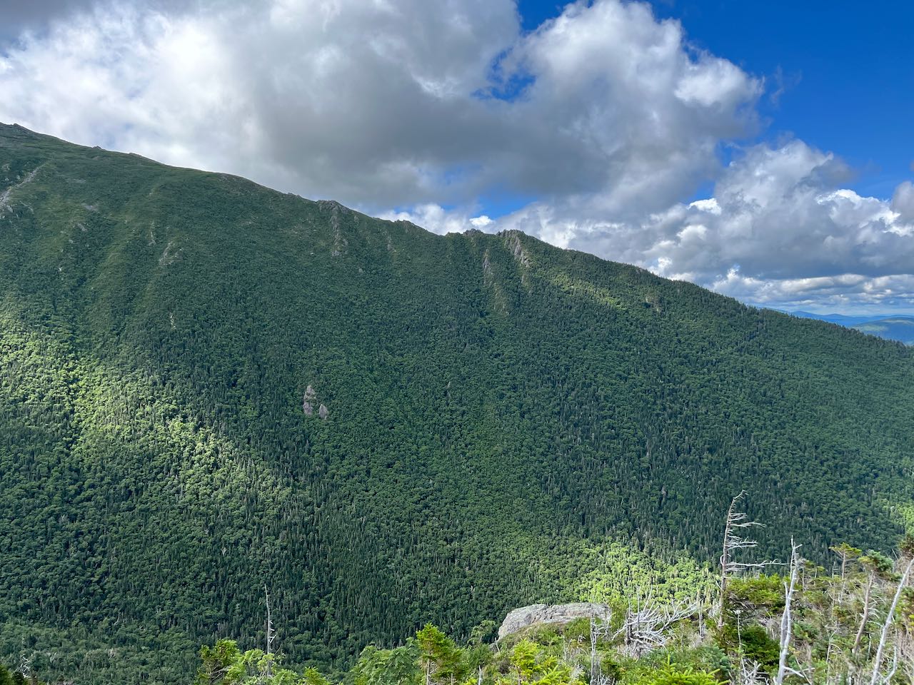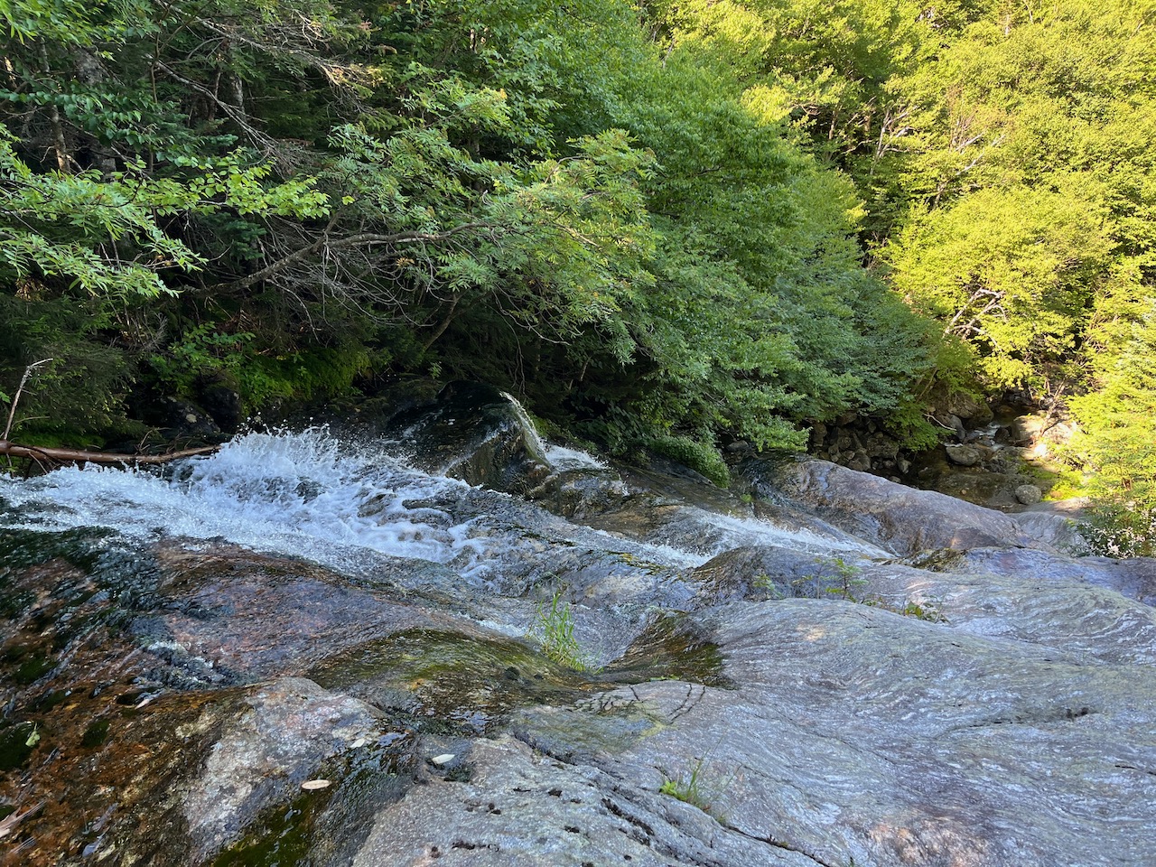 After 0.8 miles, you'll reach a junction with The Link. It merges from the left in the middle of a rock slab that can be slippery. Just a bit further, the trails split again. Bear right onto The Link as it descends toward Cascade Brook, a tributary of the Israel River. This will take you to where the trail crosses this brook, at the top of First Cascade. The brook flows down from the shelter of the tight spruce forest and tumbles down the wide, smooth ledges, ending with a final straight drop. It's quite an impressive waterfall, although it's difficult to access the base of the falls to see the whole drop clearly. Backtrack on The Link to the junction and turn right to continue on Israel Ridge Path. Pass the junction with Cabin-Cascades Trail on the left, and continue up through the rough terrain beside the cascading stream for 0.1 miles. After climbing up a couple small ladders, an opening appears on the right side of the trail, where you can walk out to the much more expansive open ledges of Second Cascade. The brook slides down the far side of the rock; it is a much lesser angle than First Cascade, but larger overall. The pitch is shallow enough that you can walk up and down the ledge alongside the cascades. From higher up on the ledges, there is a nice view out to the northwest. Nearby Mt. Bowman takes up most of the frame, but you can also see out toward Vermont, with Burke and Umpire Mountains appearing prominently.