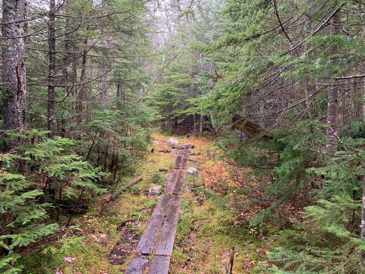 From the parking area, begin your hike on the Ethan Pond Trail. The trail nears Avalanche Brook, the source of Ripley Falls, then climbs to and crosses the tracks of the Conway Scenic Railroad, from which there is a slight view up to the looming summit of Mt. Willey. A moderate climb of 0.15 miles over rocky steps leads to the junction with Arethusa-Ripley Falls Trail. Ripley Falls is only a short 0.35 miles to the left and well worth visiting. Continue up the Ethan Pond Trail. It makes a steep, steady climb up a very long dirt-and-log staircase, then eventually moderates and traverses easier terrain for a while. A few seasonal streams are crossed. After a mile, pass Kedron Flume Trail on the right. Continue 0.3 miles, and arrive at the southern end of the Willey Range Trail. Take a left at this junction to stay on Ethan Pond Trail. The trail climbs moderately through spruce and birch forest for about a quarter mile before it starts to level off. It then spends 0.6 miles wandering across the broad plateau situated just below the sharp cone of Mt. Willey which divides the Saco River basin from the Pemigewasset River basin. With gnarly spruce thickets on each side, the trail crosses over extensive boggy terrain, where log bridges provide footing over the spongey moss. After crossing over the barely noticeable height of the plateau, the trail begins to descend into the eastern side of the vast Pemigewasset Wilderness. Chains of log bridges continue and alternate with some drier ground. After 0.15 miles, arrive at the junction with the spur to Ethan Pond. Take a right here and follow the path for little under 0.1 miles and cross the inlet stream to the pond on a bridge of stepping stones. This small brook, which flows down from a smaller pond up near the top of the plateau, is one of many streams in the eastern Pemi that, depending on which of them has the most volume, could be considered the infant Pemigewasset/Merrimack River. The trail leads out to a nice area of rocks on the east end of the oval-shaped pond, where there is plenty of room to take a seat and enjoy the scenery of the beautiful dark waters. In the background there is a view of Mt. Bond on the right and Mt. Hancock on the left. The craggy cliffs on the ridge rising up to Mt. Willey on the north side of the pond create a wild contrast with the gentle terrain around the plateau. The spur path continues a bit past the pond up the hill to a shelter. For a more intense wilderness experience, continue on the main trail to Thoreau Falls.