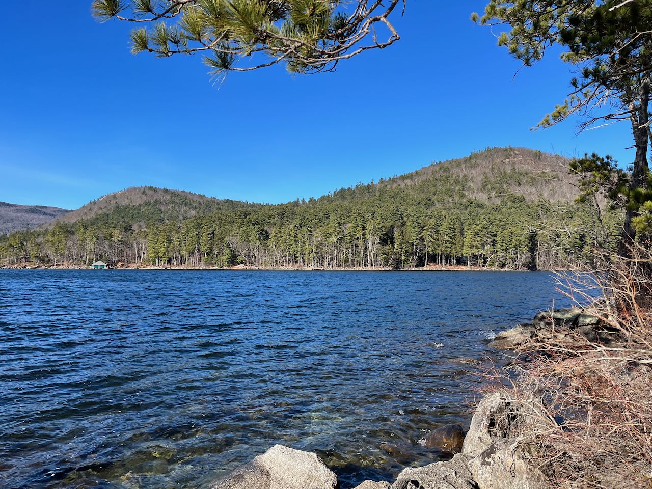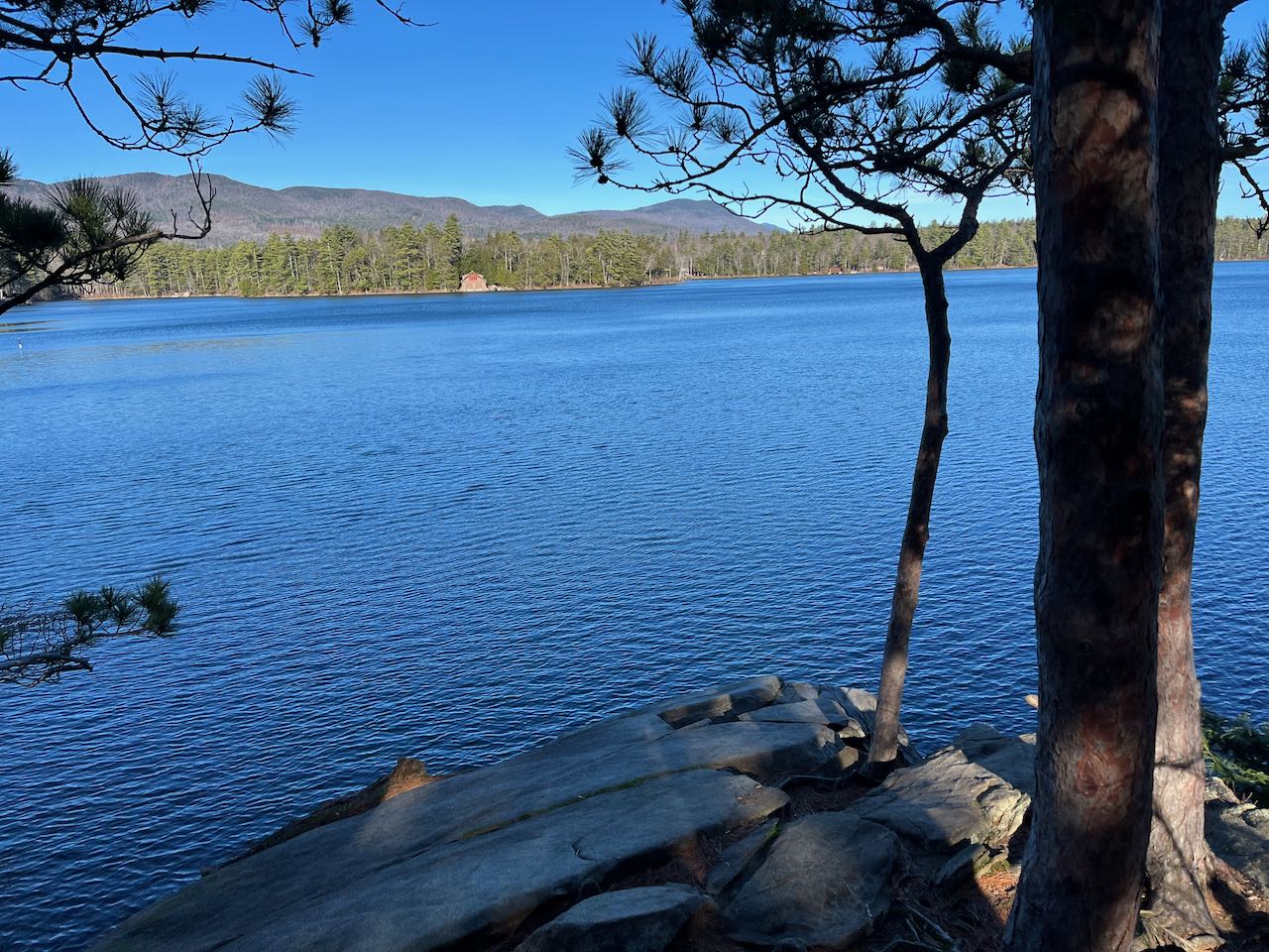 Taking the right fork first, you pass by an opening on the shoreline where you can look out the narrow True Cove. The path leads close to the water, through low bushes and sparse pine trees. After 0.1 miles, the trail passes a rocky outcrop where you can glance back over the cove at East Rattlesnake Mountain. Continuing on a very straight course along the west edge of the peninsula, look for a short side path on the right leading down to a rocky place on the water after 0.3 miles. Straight ahead, a narrow strip of land juts out from the end of the first "finger". Looking back over True Cove, you can now see both Rattlesnake Mountains. Just 0.05 miles, further, on the main trail, arrive at a T-junction. To the left, the loop continues around, while the path to the right leads 200 feet out to a sunny slab of bedrock dipping into the water at the very tip of the first finger. Around a large wooden sign directed toward boaters approaching the rocks, you have a beautiful view across the waters. Straight out is a cluster of islets called Otter Island. The second finger protrudes into your view to the left. After soaking in the scenery here, continue on the main trail as it wraps around the little bay for 0.1 miles to the far end, where you can look back out toward the lake from a tiny, secluded beach. The trail shortcuts the second finger, crossing through the woods and reaching a slightly larger beach on the other side after 0.2 miles. Continue through the interior of the point, and after another 0.1 miles, you will approach a boggy area on your right that is slowly filling in and attaching a sixth finger that once was an island. Having passed by the third finger and now passing by the fourth, the trail skirts the edge of the water again and reaches a junction with a side path on the right after 0.1 miles. This short path takes you 200 feet to a tall ledge at the end of the smallest fifth point. The smooth rock careening into the water and the red pines clinging to it create an evocative atmosphere as you gaze across Rattlesnake Cove, the east side of Five Finger Point. Over some of the lakehouses, you can see the eastern end of the Squam Range, along with Mt. Israel. Across a narrow strait in front of you is the small side of Hoag Island. To the right you can look out to the main lake. Back on the main trail, leave the lakeside for the final time. The path takes you through some boulders and ferns, then arrives back at the loop junction after 0.3 miles. You can now return the way you came.