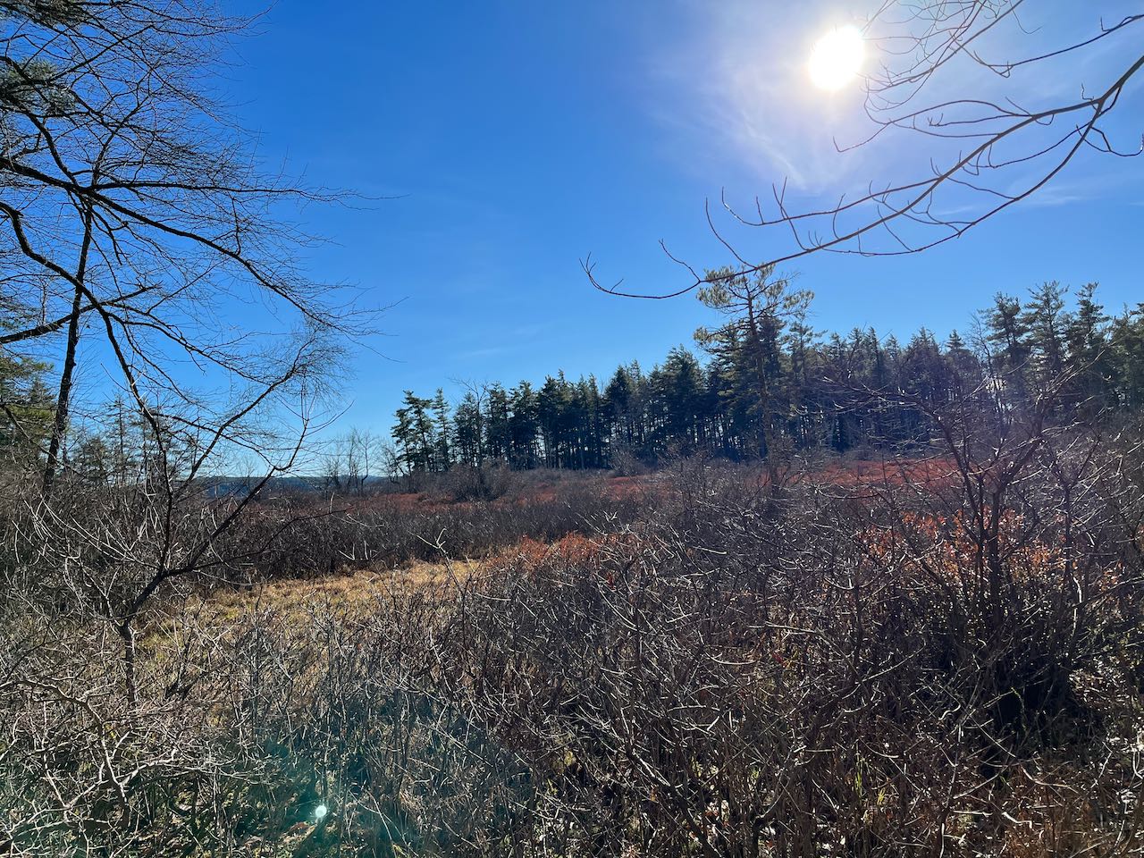 The trail begins around a lakeside camp. Cross the road you drove in on and follow the path signed to "all trails" underneath power lines for a short distance. Then, cross a dirt drive and walk around either side of a barn to cross into the woods onto Pasture Trail. Walk gently uphill to a trail junction after 0.2 miles, where trails diverge left to head up to the Rattlesnake Mountains. Bear right at both signs (60 feet apart) onto Five Finger Point Trail. The path heads out across the rocky hillside, undulating as it goes. After half a mile, the trail swings to the right and begins to descend. It leads along a stone wall, passing beneath the power lines again and around the end of the private extension to Pinehurst Road. After 0.2 miles, you cross the peninsula's narrow neck and arrive at a sign where the loop splits.