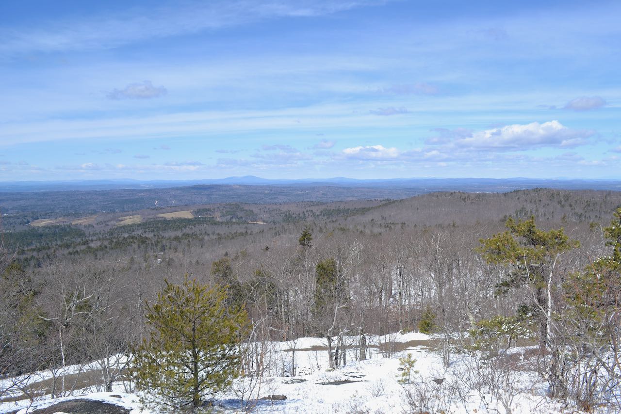 Driving Directions: Trailhead and parking area are on Mountain Road in Epsom, NH. To get there, start from Rt. 28, 2.8 miles south of Rt. 202 at the Epsom Traffic Circle. Turn east onto Short Falls Road and proceed 1 mile to a four-way. Drive straight across onto New Rye Road and continue 1.1 miles, then take a left onto Swamp Road. After 1.5 miles, turn left onto Mountain View Road. Go 0.2 miles, bear right, and drive another 0.2 miles to a fork where the access road continues ahead and driveway and snowmobile trail are to the left. Find a place to park around the base of the driveway or on the roadside. Click here for a Google map.