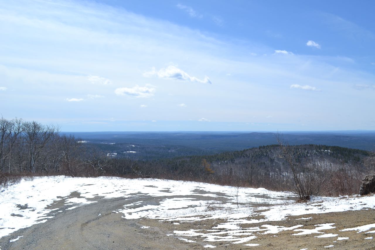It is a straightforward walk of just over a mile up the gravel access road. It begins with a mostly flat stroll through the forest. Past the bar gate, the foliage opens up and you can see the cell tower at several points. As the slopes get steeper, the road curls into switchbacks to alleviate the incline. Approaching the summit is a hairpin turn, at the top of which wide views open up. The road makes a final jog up to the tower. Walk around to the opposite side of the tower to the uplifted ledge which forms the highest ground for the best single vista. The view is open in most directions over the treetops. North looks out to the profile of the White Mountains; the Belknap Range is seen in front. Off to the northeast the view takes in some of the Blue Hills in the southeastern region. Northwest is the area around Mt. Kearsarge. This view is enhanced with a good clear day, when many distant peaks reveal themselves. Additional views to the southeast, looking over to nearby Rockingham County highpoint Nottingham Mountain, can be found by following a faint path which drops into the woods at that last jog in the access road. This area of open ledges can be seen ahead through the trees. It opens up wider views toward southern peaks including Monadnock, Crotched, and out to Wachusset Mountain in Massachusetts.