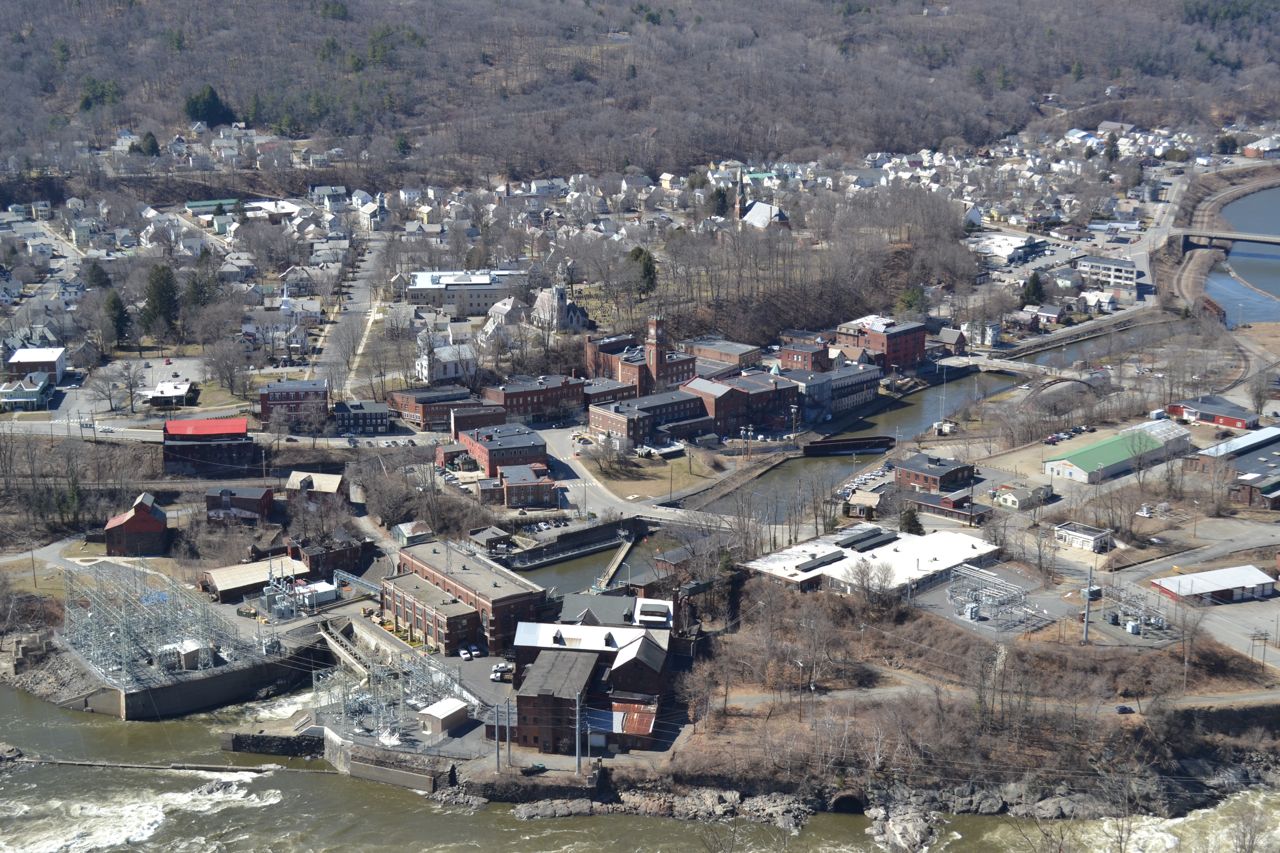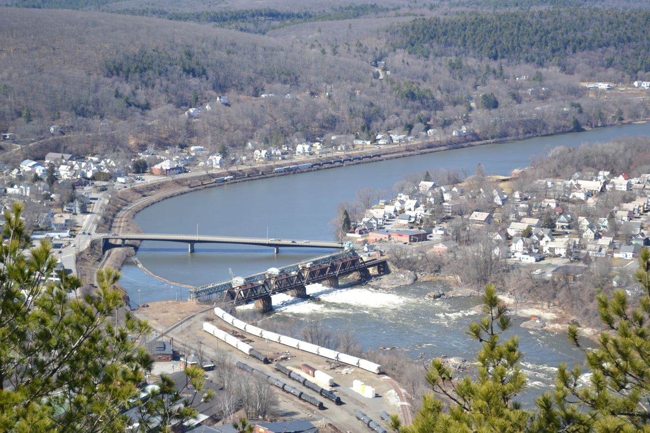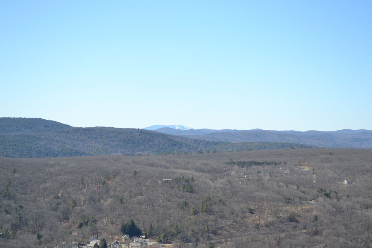 About the Hike: An obscure, locally known place, the cliffs on the side of Mt. Kilburn provide a wide vista of Bellows Falls, Vermont. The hike is primarily on an access road for the communications towers at the summit. From the parking area at the end of a neighborhood, follow the access road up a hill. It crosses a power line clearing, then leads into the woods. Shortly after this, you will come to a fork. Turn right, pass a small pond, and begin to climb. The road surface becomes large gravel as it switchbacks up the steep slope. After a moderate, winding ascent, the access road heads for the summit, while you must follow a dirt path that bears right and descends to the cliff outlook known as Table Rock. This dirt path may be flooded in some places, but beaten paths bypass these sections. After about 0.2 miles, turn right onto a short spur path to the cliff. From this viewpoint, you have a close-up view of the towns below, Bellows Falls, VT, and North Walpole, NH. Between the two towns is the Connecticut River. There is a good view of a dam on the river, along with some rapids. On the horizon are several ski areas, including Stratton Mountain, Ludlow (Okemo) Mountain, and Killington Peak. By descending to a lower cliff, you can get a better view of the river and to the south.