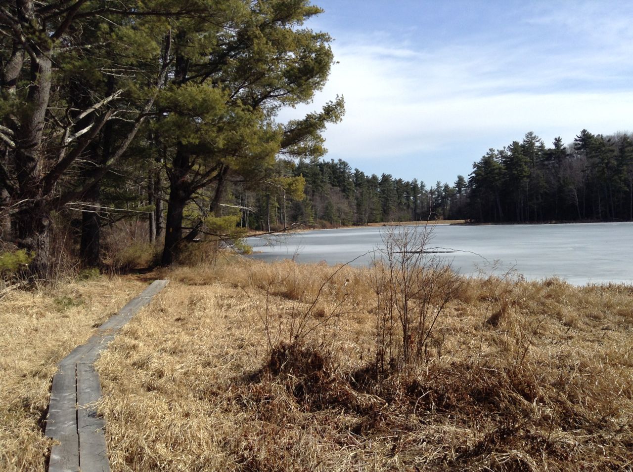 About the Hike: Peaceful Heald Pond is a great place for an afternoon walk. Located in the Forest Society's Heald Tract, the pond is bordered on one side by a short walking trail that follows its shore past many scenic viewpoints over the water. Walk past the gate across from the pull-off and follow the Heald Pond Trail to the first view of the pond at a stone bench. The trail then wanders through the woods until it meets the pond again in a grassy meadow. A boardwalk leads across the grass, passing a wide path on the right. Soon the trail comes upon a shoreline rock, a good place to sit and enjoy the pond for a while. It continues along the shore, but soon turns into the woods on a relocation, soon passing Ledge Cutoff (signed for Fisk Hill Trail) on the right. At the end of this section through the forest, a spur leads back out to the water at a good viewpoint signed "Look See". Soon the main trail joins the pond again and turns to the right as the water bends. It continues to follow the shore until it reaches the north end of the pond, where it turns away from the water; turn right to stay on the trail where Fisk Hill Trail continues straight. Continue until you see Ledge Cutoff on the right. Turn onto this trail and enjoy a short forest walk back to Heald Pond Trail.