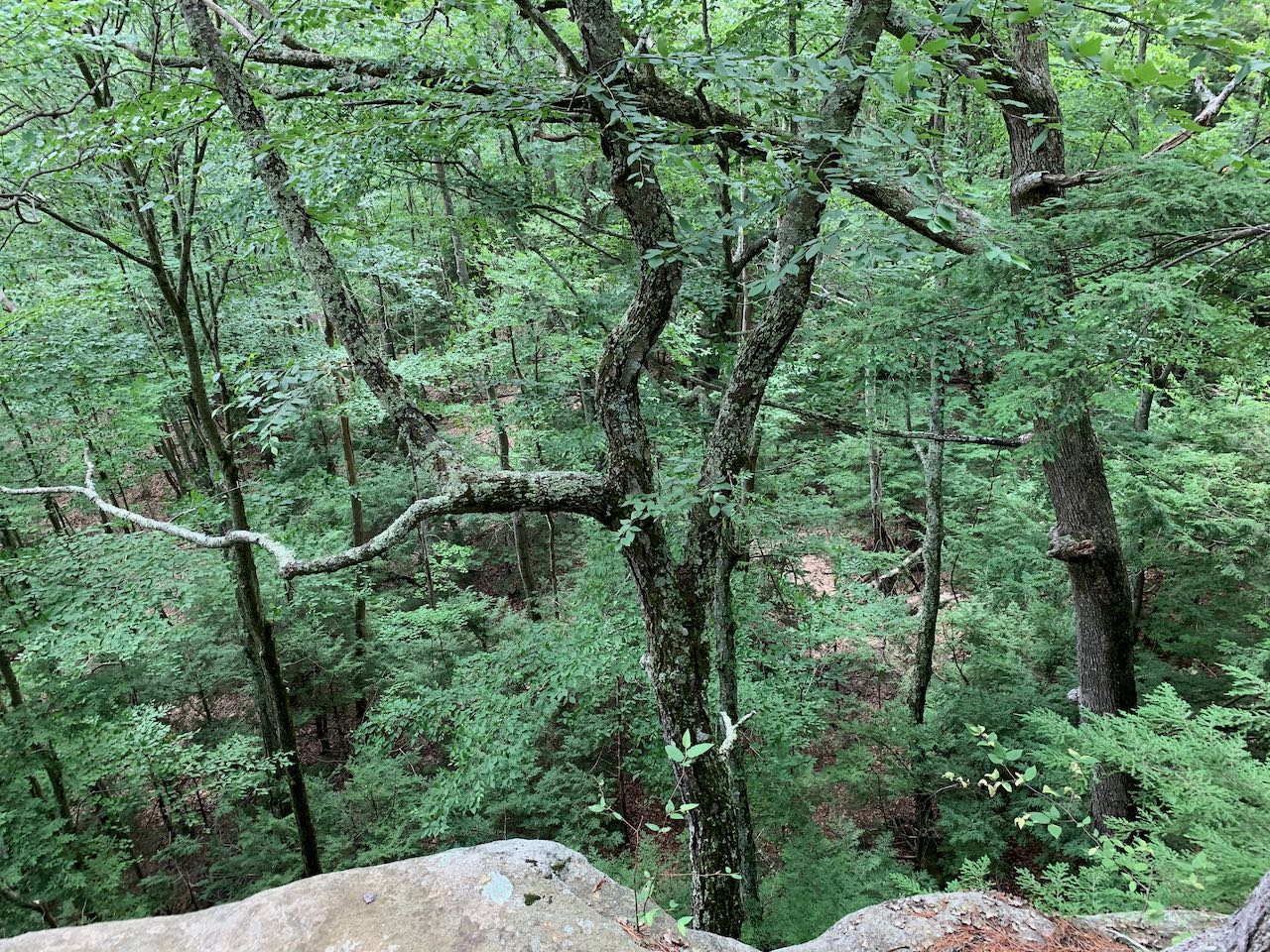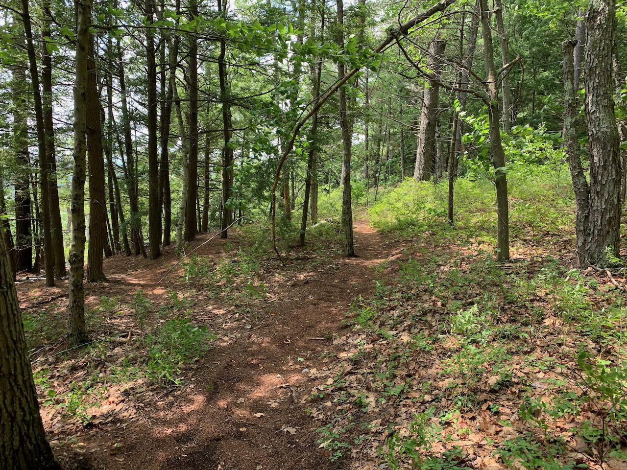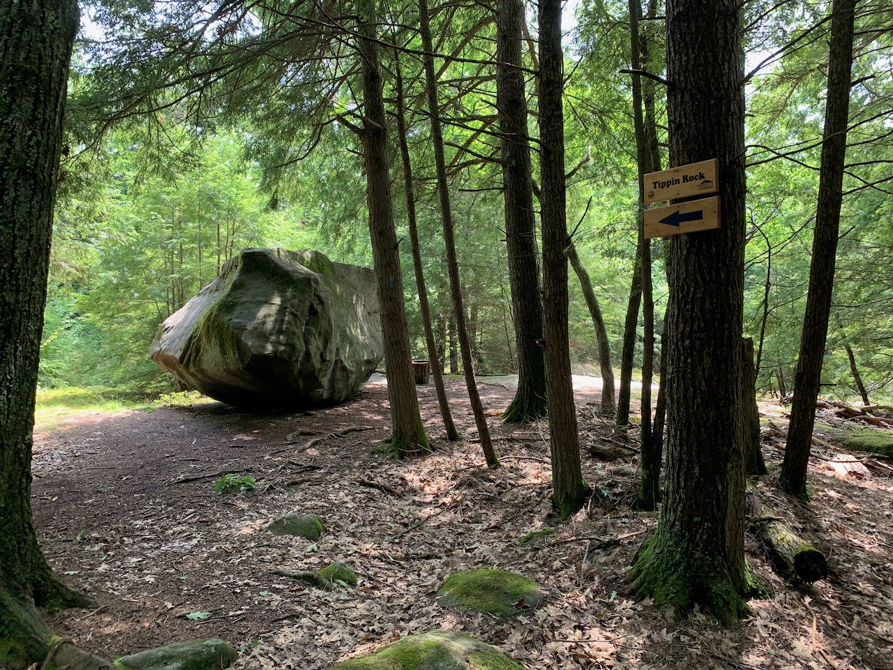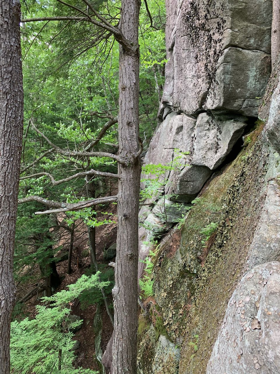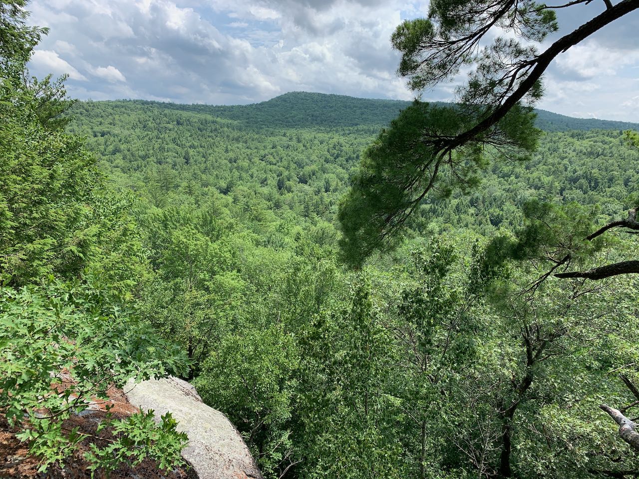 From the trailhead, follow the beaten path cutting diagonally across the field to the right. On the other side, you will find a sign for the Tippin' Rock Trail. The trail leads toward the hill and begins climbing easily. After a quarter mile, it turns left to join an old road through the woods. The trail climbs diagonally up toward the top of the hill, with sparse trees and rocks scattered through the forest. After another quarter mile, the trail rounds the top of the hill. The old road ends and the trail descends a bit over the crest of the hill to reach Tippin' Rock in another 0.15 miles. A sign marks the oblong boulder, set on a pad of ledge. It's up to each visitor to determine whether the "tipping" is just a legend or if the boulder can really be rocked back and forth. The trail takes a sharp turn to the right here and runs along the summit ridge for 0.2 miles. After meandering through low-bush blueberries, the trail reaches a point where a short side path on the left leads out to an open, table-like ledge with nice views of the nearby round hills. The drop off the cliffs is impressively sharp, and the tree canopy from below just barely reaches the ledge. The cliffs run for about a tenth of a mile on the south side of the summit ridge. Just a bit further up the trail, another side path branches off and leads down to a spot in the middle of the cliffs where you can experience the full magnitude of the rock faces. This portion of the cliffs is frequented by rock climbers, and beaten paths lead all around the area. The main trail leads up to the highest point on the cliffs, where there is another outlook. Just behind is the top of the hill.