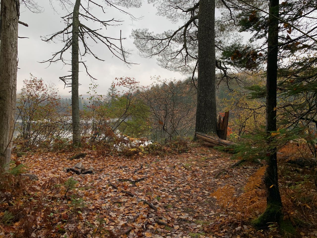 Head straight down the old road into the woods, descending slightly. Blowdowns impeding the pathway are the norm. After 0.2 miles, the trail approaches a scenic sandy spot on the brook, where you can look ahead as it converges with the marsh flowing out of the lower pond. The path swings away from the brook and leads up an often muddy section, then descends, coming near the east end of Lower Hall Pond in another 0.2 miles. At this section, where a spur path drops down to peep through the bushes at the waterside, you must pause and take care to find the correct path forward, which disappears into an overgrown patch and continues in the same direction along the pond, a distance above. In 0.2 miles, the trail comes out into a brushy section, where it crosses the small brook joining the Hall Ponds after 0.2 miles. The pathway journeys over a rolling knoll and drops into a hollow with a towering tree caonpy in another 0.1 miles. Here, the trail can be hidden by leaf litter as it turns left and exits the hollow toward the shore of the pond. In less than 0.1 miles, it comes out to a peaceful hideaway at the waterside on the west side of the pond. The water stretches out in both directions of the pond's oblong form from this point on the shore. The low hills around the notch between Mt. Weetamoo and Sandwich Dome rise over the water.