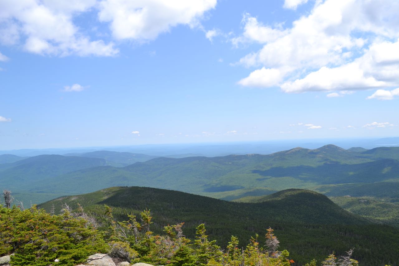 Mt. Hight's summit provides hikers with spectacular views in all directions, including a great look across the notch at the lofty Northern Presidentials, views north and south along the Carter-Moriah Range (which Mt. Hight is a part of), and an expansive vista over the Wild River Wilderness. To the southwest rises nearby Carter Dome. To the right, far in the distance, is Mt. Hancock, with Wildcat Mountain below and next to Carter Dome. To the west are the Presidentials: Boott Spur, Mt. Washington, Mt. Jefferson, Mt. Adams, and Mt. Madison. The Great Gulf opens up below Mt. Adams. To the northwest are the Pliny and Pilot Ranges, with the Crescent Range below. To the north along the range are South and Middle Carter Mountains, with many distant mountains in the Great North Woods, Maine, and Canada above. Off to the right of Middle Carter and far below are the ledge-spotted Mt. Moriah and Shelburne Moriah, with the Mahoosuc Range beyond. To the northeast are the distant high peaks of Maine, and just further over are the mountains around Evans Notch: Caribou Mountain, Royce Mountain, and Speckled Mountain. To the east is the Baldface Range, from low Mt. Meader up to the two rounded domes of the Baldfaces. Next over from South Baldface is Eastman Mountain, which peeks out from the col between South Baldface and Sable Mountain. Above is the long ridge of Maine's Pleasant Mountain. To the right of Sable Mountain is Chandler Mountain. To the southeast are the lower hills centered around the distinctive Kearsarge North. Doublehead Mountain is in front, with Black Mountain even closer. To the south is Moat Mountain, with the Ossipee Range behind and the eastern Sandwich Range, including Mts. Chocorua and Paugus. The rest of the Sandwich Range is hidden behind Carter Dome.