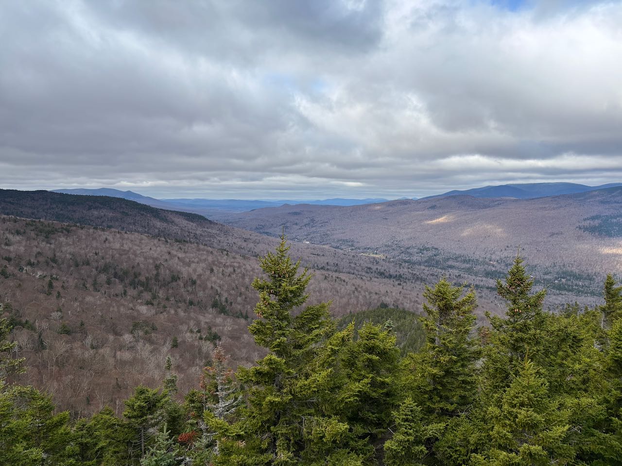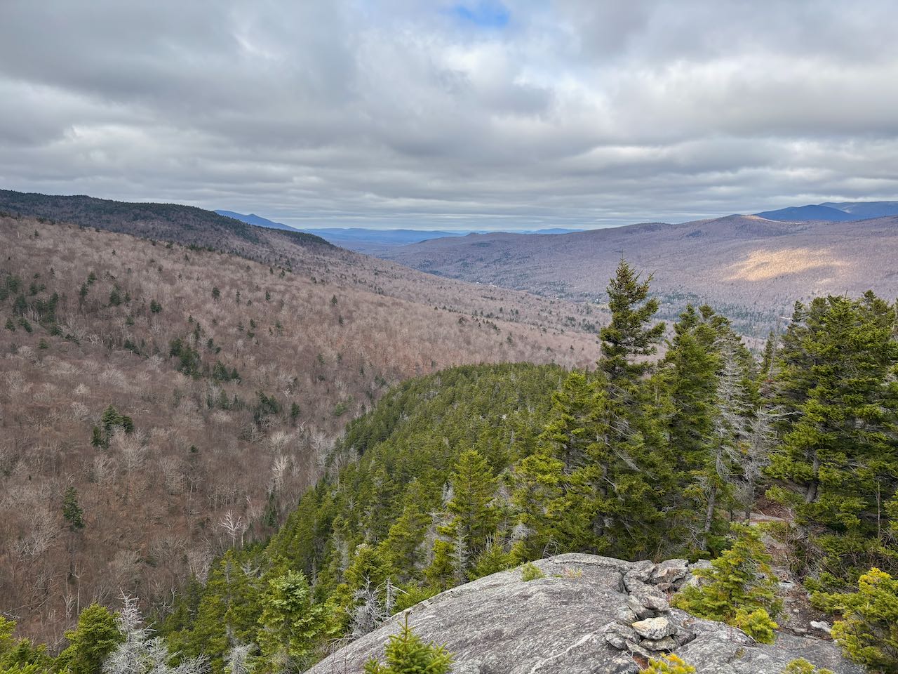 The trail ends at Kelton Trail just beyond the ledge. Turn left to begin descending Kelton Trail. In 0.1 miles, you'll pass a short side path to a viewpoint on the right. This opening has a clearer view to the northewest. Small, rocky Pine Mountain is fully visible as well as the northern slopes of Mt. Moriah to its right. The expansive Bear Mountain in Maine is just to the left of Pine, and the main ridgeline of the Mahoosucs stretches out to the left of that, with many of its major summits appearing in front of one another. Goose Eye Mountain is in the back, with Mt. Carlo in front, Bald Cap in front of that, and Mt. Hayes closest, with Cascade Mountain set off to its left. Mahoosuc Notch can be seen behind Cascade, with Old Speck Mountain all the way in the back. Distant New England Hundred Highest peak Elephant Mountain is visible way in the distance to the left of the Mahoosucs. Trees screen the view to the left of that, but some scattered mountains in the Great North Woods can be glimpsed. Continue on the trail past this last of the viewpoints, and it soon swings right and drops sharply off the ridge over more rocky terrain. It descends rapidly, almost at the same pace as the ascent. After 0.4 miles, it levels off on a plateau and reaches a side path to Kelton Crag on the left. This overgrown ledge now no longer offers any views. The trail turns right here and drops down a bit of a rock scramble before leaving the coniferous forest and moderating out a little. In another 0.4 miles, reach the end of the trail at Howker Ridge Trail, right across from a sign for Coosauk Fall. It can be difficult to see this often-dry cascade on a tributary emptying into Bumpbus Brook through the trees. If you want to extend your trip just a bit, turning right at this junction will take you to Hitchcock Falls in about 0.3 miles. Turn left to complete the loop. The trail follows high along the bank of Bumpus Brook, soon passing a twin cascade pouring into Devil's Kitchen, a mossy gorge with high rock walls. In 0.2 miles from Coosauk, the trail passes Stairs Falls, a short rocky plunge located where another tributary joins the brook. The trail remains beside the brook for another 0.1 miles, passing some ledgy rapids and cascades, before pulling away. Another 0.4 miles downhill, crossing some boardwalk near the end, will take you back to the trailhead.
