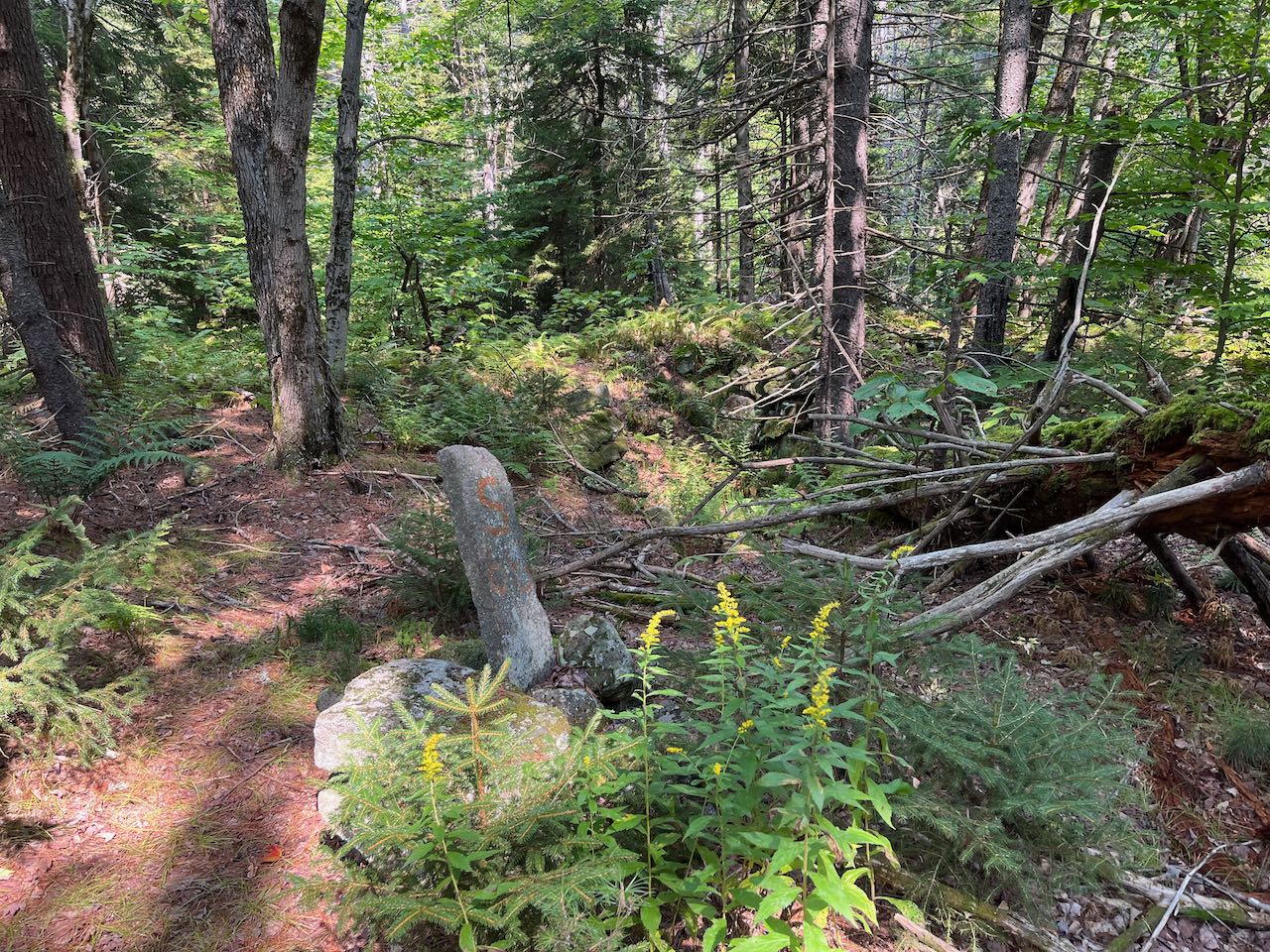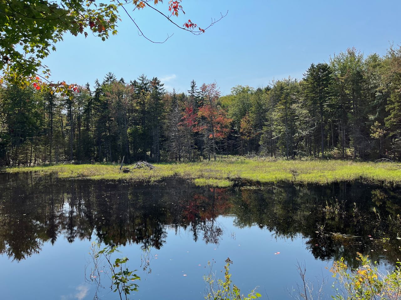 Continue on foot up King Street as it leads uphill past a few quaint cabins. At 0.2 miles, notice a few markers for the greenway and surrounding conservation land and turn right into the entrance to a grassy woods road, blocked off by a row of rocks. You are now on the Barney Brook Trail, formerly a detour off the greenway until it was rerouted to be the official track. Quickly bear right off the road onto a well-kept footpath. Despite the rather high elevation of your starting point, you will still face a fair amount of climbing to reach the summit because you now begin a nearly 300-foot descent in order to cross the valley of Barney Brook. The drop starts out gently on a fern-lined corridor, with a few log bridges conveniently placed. The down-grade becomes more aggressive, culminating in one steep pitch to reach the valley floor. Skirting by a grassy wetland, the trail crosses two branches of Barney Brook, which converge just below you into another swampy area, on wooden bridges 0.5 miles from the road. The trail follows the second branch briefly up to a little pond, and rounds the corner around the edge of the open water. In 0.15 miles, the ascent begins in earnest, passing by the face of a large boulder. After climbing steadily for 0.2 miles, the incline mellows, and the trail passes through a stand of conifers. You will soon see a colorful county line marker on a tree, step through an opening in a stone wall, and come upon a historical marker for a homestead site on the right side of the trail. After another 0.15 miles, the trail swings to the right to curl around a lower eastern summit of the hill, maintaining a steady elevation as it goes. After a quarter mile, the trail dips to cross a clear woods road. The trail to the summit continues straight ahead at a sign, but take a brief detour down the road to the right to visit a quiet pond. If you walk downhill for 0.15 miles, you will come to a point on the shore of the pond where the road was flooded. Here you can enjoy the scenery for a moment before continuing on.