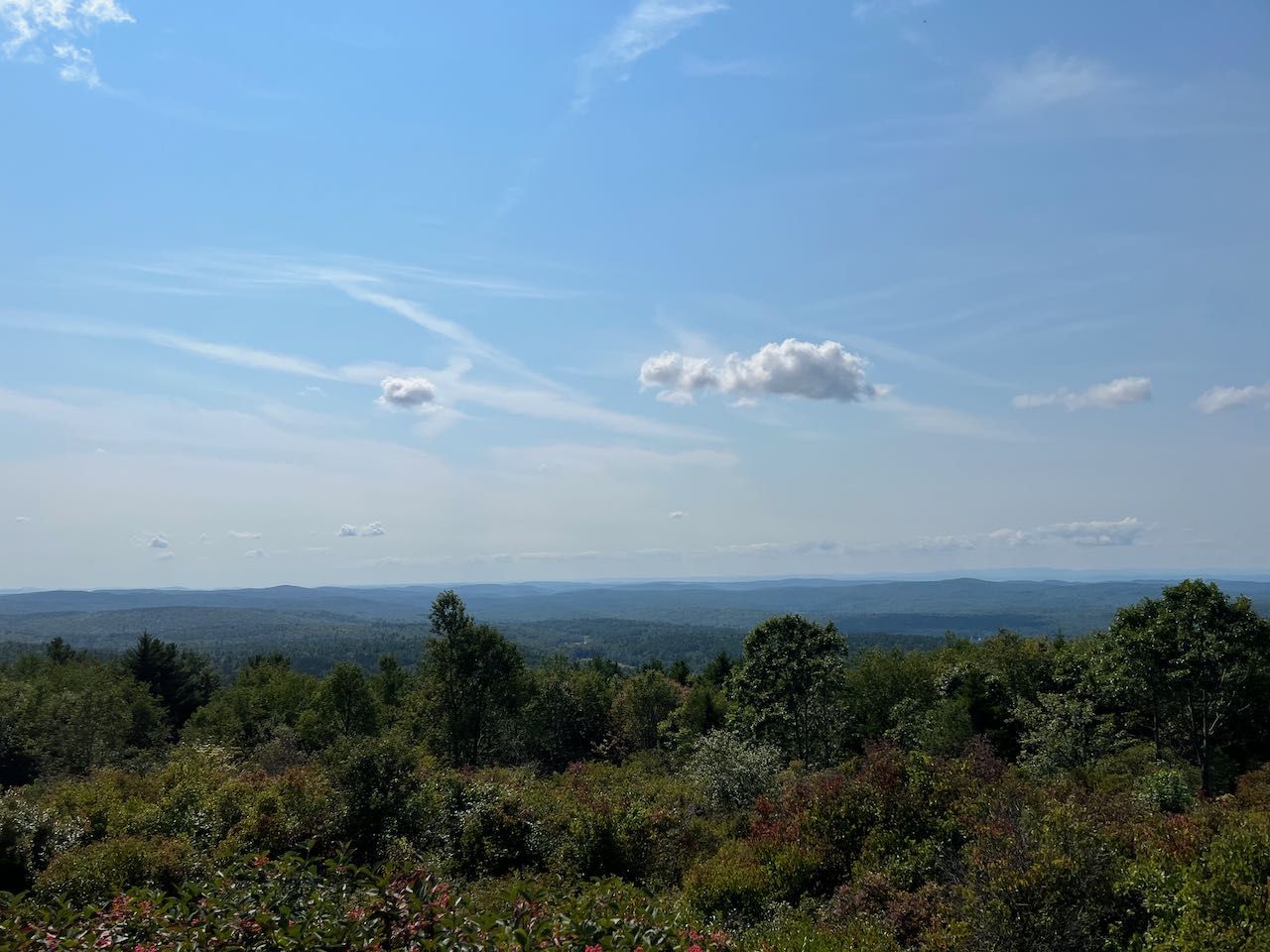 Back on the main trail, the path climbs a bank away from the road and parallels it for a moment through spruces, then swings away. The trail rises across the slope beneath the summit of the hill and climbs beyond it to the north, making a 180-degree bend back toward the clearing at a point 0.3 miles from the road, where the old now-closed route of the greenway continued north (remember to turn right at this point on the way back). Follow the trail for the last 0.15 miles across a few patches of exposed ledge into the expansive, brushy clearing. The summit is marked with a large cairn and sign. Off one side of the clearing, you can see to the northeast toward the Mt. Sunapee ridgeline, with the wind farm around Bean Mountain on its left and Lovewell Mountain on its right. In a gap between Lovewell and the extensive Rowes Hill, you can glimpse the Belknap Range. Over the trees to the southeast is nearby Pitcher Mountain. Look for the fire tower poking up from the clearing. Not far to the right is Mt. Monadnock and its small companion Gap Mountain. The most open view is off the west side, where you can gaze across the Vermont horizon and pick out many Green Mountain peaks in the distance, including famous ski area summits Mt. Snow and Stratton Mountain.