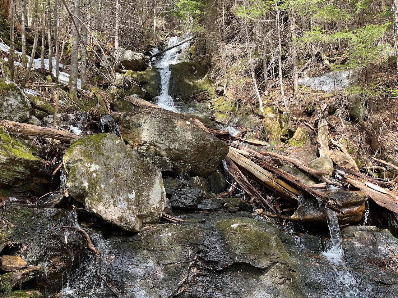 To find the trailhead, walk into the common area directly across from the main entrance to the parking area. Bear right and walk around to the back of the visitors center, and look for the kiosk. The Old Jackson Road begins here, splitting off to the right of Tuckerman Ravine Trail. Head up this wide forest path for 0.4 miles, passing by a few ski trails on each side. Right after crossing a wooden bridge over a stream, turn right at a signpost onto Crew Cut Trail. Quickly cross a wide, pebbly brook, one of the branches of the Peabody River. The trail heads through the bright, open forest for 0.2 miles, crosses another brook, and arrives at a junction. Turn left at this point onto George's Gorge Trail. This path heads uphill, following alongside the brook in its broad, boulder-filled valley. It climbs high up on the bank above the brook and soon enters into spruce woods. Swinging back to approach the stream again, it comes up to Chudacoff Falls after 0.15 miles, the tallest and most notable of many ledgy cascades on the brook. The climbing moderates past the falls as the trail stays close to the brook. After 0.2 miles, it crosses to the other side on a log bridge, climbs up a bit more, and crosses again where the stream is even smaller. At this crossing, you have a clear view upslope of another fine, muti-tiered cascade. The trail continues moderately uphill through the valley for about 0.15 miles to a trail junction with Liebeskind's Loop. Turn right at this point and descend slightly, crossing a wet area on a few bog bridges and rising over a moss-lined path to reach an opening at the top of a ledge after 0.2 miles, signed "Brad's Bluff". From this directional window in the trees, you have a nice view over Rt. 16 cutting its way through the notch. Straight down below, you can see the parking at the Joe Dodge Lodge and the headwaters of the Ellis River across the way. In the distance through the notch, you can see Mt. Chocorua and part of the Moat Range. To your left, you can peer around the branches to see the ski slopes on Wildcat Mountain. To the right of the notch is the long, trailing Rocky Branch Ridge, and closer up, Slide Peak. All the way to the right you can glimpse Tuckerman Ravine past Boott Spur.