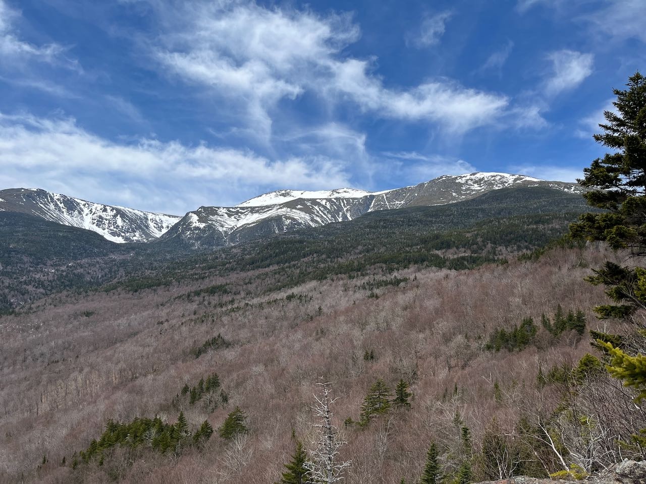 Leaving the bluff, the trail continues higher up, then makes a right turn down a precipitous pitch and arrives at the bottom of a series of impressive cliffs. It runs right alongside the rock face, then turns and shoots down another steep slope away from the cliffy terrain. After another 0.2 miles, it makes a long circle to the right around a small knoll, descends again, and reaches a trail junction in 0.1 miles. Turn left here onto the spur trail to Lila's Ledge, the main attraction of the hike. This 0.1-mile long path makes a long switchback up to the top of another knoll, then drops down to an airy perch atop another set of cliffs with a much more open view. You'll have to proceed down through a narrow and somewhat steep path to reach the best viewpoint. From here you have a much more extensive view of the notch. Off to the left you can now see all of Wildcat Mountain, including the base area. And off to the right, you have an unobstructed view of the two great ravines of Mt. Washington, Tuckerman and Huntington. In between the two you can see up to the summit. Also between the two, in the middle, look carefully for Raymond Cataract, a massive off-trail waterfall of which you have a clear view from this location. Look for it with binoculars if you can. Return to the main trail and continue downhill for 0.1 miles to a junction with Crew Cut Trail. Bear right at the junction and follow the trail downhill at a quick pace through rocky areas, coming into sparse woods. The trail levels off and crosses a brook on stepping stones. Continuing through the woods, it crosses another small brook and arrives back at the junction with George's Gorge Trail after 0.3 miles. Retrace your steps back to the parking area.
