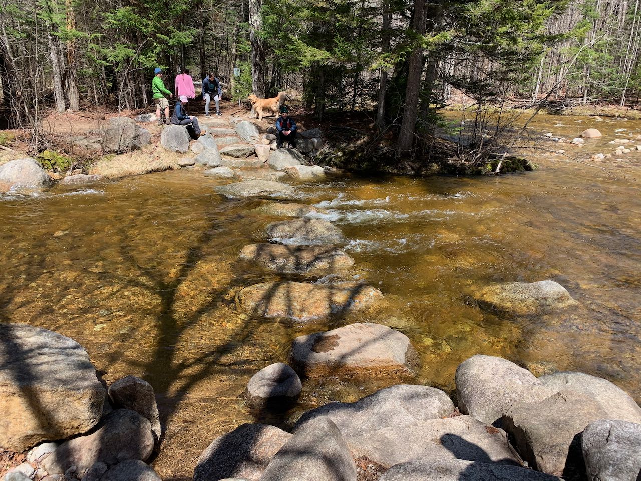 About the Hike: Even in the center of the resort mecca in Waterville Valley, there is an abundant presence of natural beauty. The relatively new Mad River Path offers a quiet ramble along the banks of (you guessed it) the Mad River, while it is still a shallow, stony, and rapid mountain waterway. The well-constructed trail tackles a severe hill beside the river with ease, making use of rock and wood staircases; and it utilizes a row of carefully placed boulders to cross a normally impassable branch of the river. A walk down a series of sidewalks is needed to complete the loop, but it doesn't detract from the experience at all, since there are plenty of mountain views all along the way and even a bit of town history.