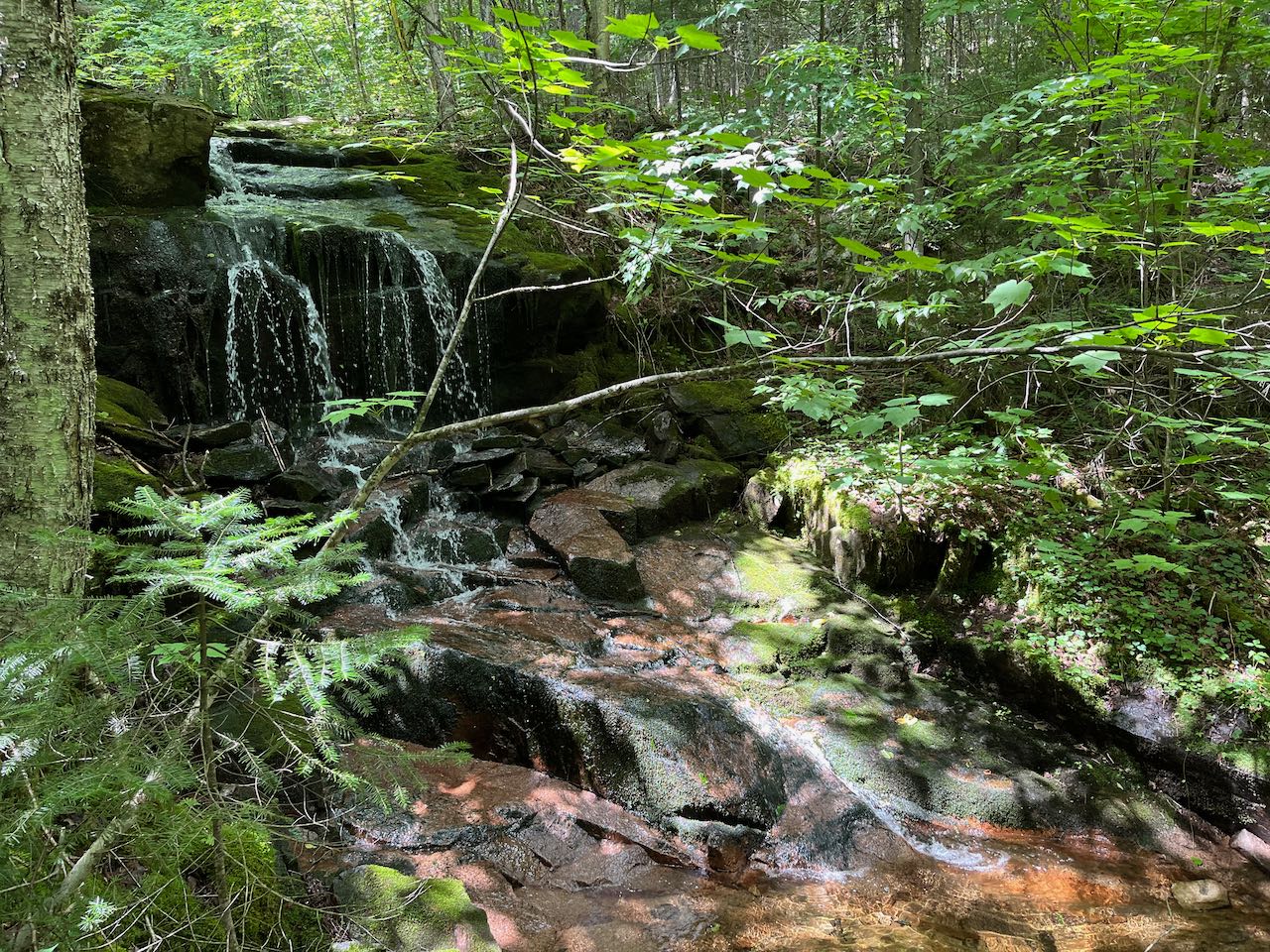 From the parking area, walk out to the main road and walk across the bridge. Turn left and walk past a small pull-off by the river (this is private property and parking here is not permitted). Look across the street to the white house (#6291 River Road). The house has a loop driveway with two entrances. Walk up to the left entrance and follow the edge of the trees between this house and the next one over. Keeping pets leashed in this area is mandatory. Staying as close to the trees as possible to respect the homeowners' privacy, walk along the edge of the lawn to the area behind the house, where you will see a clear road forking left into the woods. Follow this road as it crosses a wide and shallow brook and then transitions into a forest of tall pines. The trail, though unmarked, is a wide woods road with a clear foot track. 0.15 miles past the brook crossing, the road meanders up a grassy switchback and angles up the hillside at a gentle pace. In 0.3 miles, the trail swings left uphill and becomes steeper and rockier, soon passing where an older version of the trail came in from the right. A new arrow sign has been placed to divert away from this on the way back down. In another 0.15 miles, the trail approaches a pleasant brook and follows its bank for a distance. It edges along a little gorge, then passes by a small cascade. Some muddy ground spills over the road after this point and the route fades into just an average mountain footpath, now marked regularly with yellow wooden blazes. After 0.2 miles along the brook, the trail crosses over a mossy ledge in the bed on a long wooden bridge. The trail continues to follow it closely on the other side, climbing at an increasing grade through the open woods up the brook valley. Soon it pulls out of sight from the brook, but continues to parallel it. It climbs higher up, transitioning into darker evergreens while plodding over a stony surface. After a steady half mile ascent, the trail swings to the right, climbs 0.1 miles, then turns back to the left and weaves across more mellow terrain. It leads along a bit of a plateau for 0.35 miles in enchanting northern forest, then resumes climbing up the summit cone. The trail zig-zags upward through sparce conifers for 0.3 miles, leveling out and arriving at the summit.