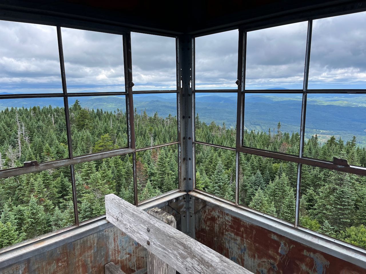 The tower looms high overhead the summit clearing. A sign designates the summit elevation, while beaten paths lead to a camp clearing and a stone chimney buried in dense brush. Nothing can be seen from the ground level, so you must climb the six flights of stairs into the enclosed tower cab, lifted 80 feet over the mountaintop. The windowpanes have been removed, so on breezy days, the draft pierces through the structure. Looking out the frame, to the north, the view gazes upslope over the infant Connecticut River Valley toward Canada, where another serious monadnock, Mont Megantic, is seen in the distance. Some of the Boundary Range is in view as well. Off to the northeast are some of the peaks in the vast logging wilderness, including Stub Hill, highpoint of the Connecticut Lakes Region, and Magalloway Mountain. Some peaks in Maine can be noticed in the distance. To the east, a long chain of rolling hills with obscure names leads to a prominent gash carved into the landscape; Dixville Notch. Route 26 can be seen pointing straight into it. In the distance lie Maine's Elephant and Old Blue Mountains. On the other side of the notch are the big mountains that house a huge wind farm - Dixville Peak and Mt. Kelsey. To the right of the turbines, you can see distant Mahoosuc 4000-footer Old Speck Mountain. The nearer peaks continue into the remote Nash Stream Forest, starting with Muise Mountain. Behind a warm and pastoral vista of open spaces and river lies the Stratford Range on the left, with Mt. Washington visible over the top, and disconnected Savage and Teapot Mountains on the right. On either side of these twin peaks, the view stretches south to the central White Mountains. The Southern Presidentials, the Willey Range, the Twin Range, and Mt. Carrigain are seen on the left side, while the Franconia Range, Kinsman Range, and Mt. Moosilauke are seen on the right. More to the southwest, the view crosses over into Vermont, where East Mountain is a prominent feature with its large crowning structure. Further over to the west, the spine of the Green Mountains stretches across the horizon from Camels Hump past Mt. Mansfield to the Jay Peaks. To the northwest are a multitude of unfamiliar summits in Quebec.