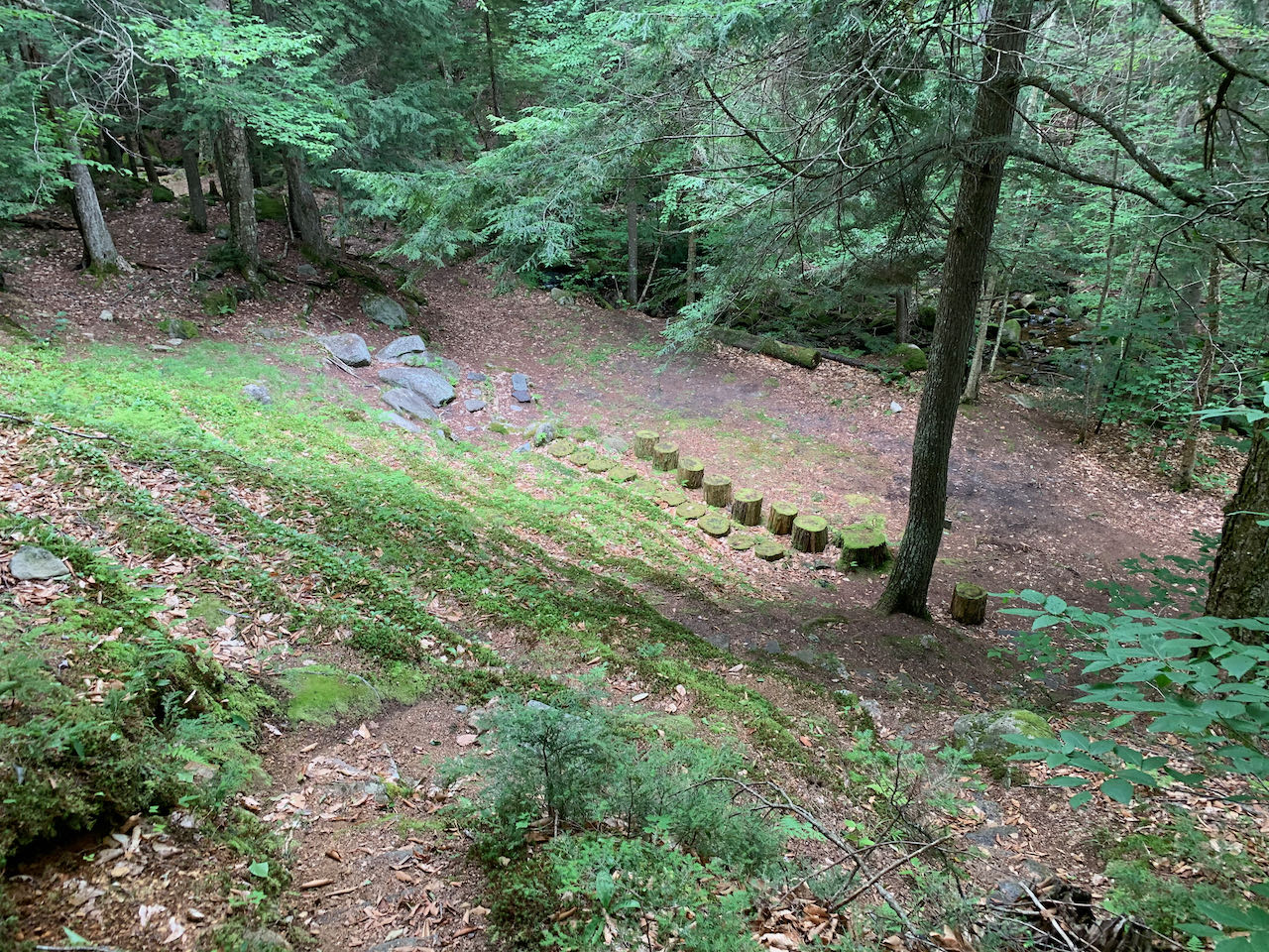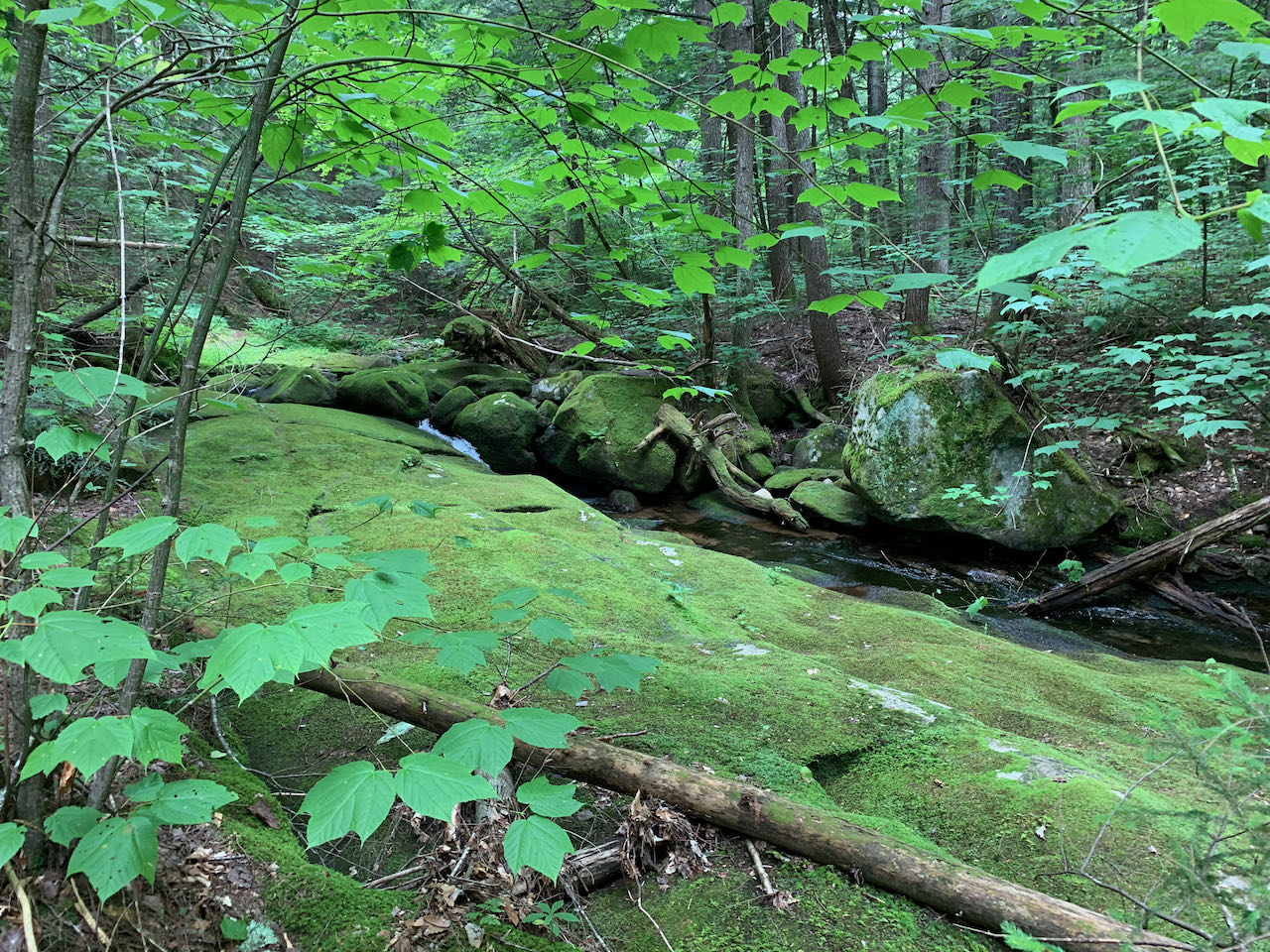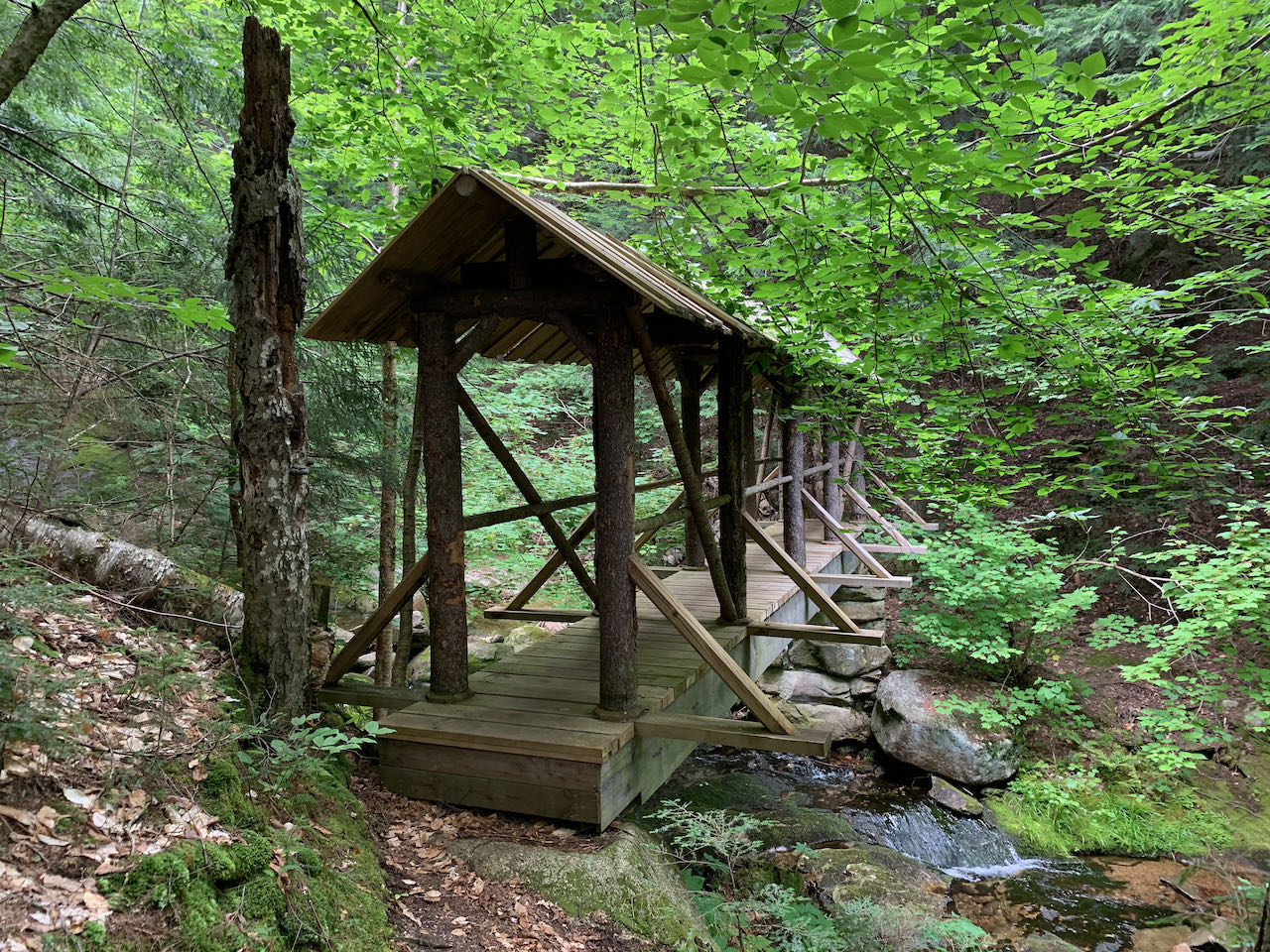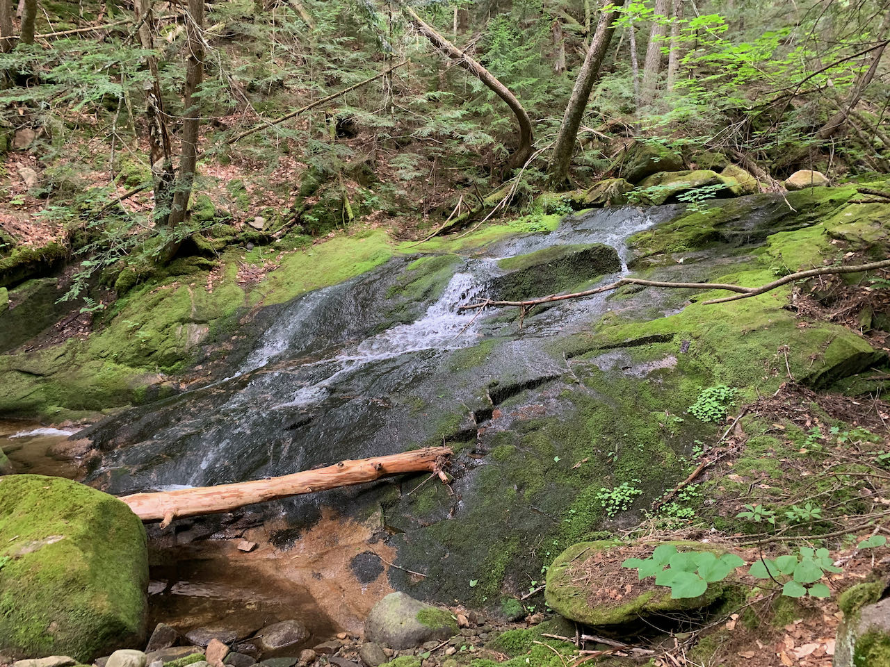 About the Hike: Take a short stroll into the quaint setting of Mossy Glen, where local treasures await. It will please both the waterfall enthusiast and those who seek a peaceful walk in the woods. Begin at the Randolph town hall on Durand Road, a parallel of Route 2 that accesses an overabundance of walking paths maintained by the Randolph Mountain Club. Walk east on the road for 500 feet, passing a war memorial honoring the town's servicemen, including many from the famous Lowe clan. Turn left and walk uphill on a gravel driveway (Mossy Glen Way) at a signpost marking the Groveway path. In another 500 feet, bear right away from a house on a footpath into the woods. The trail ascends gently, approaching Carlton Brook. Soon you pass over the top of an amphitheater cut into the hillside, where town functions are occastionally put on with the beautiful natural setting of the brook in the background. Just a little further, pass by the junction with Bluffway and arrive at the Nepalese Bridge. This evocative steel and wooden structure is a 1960's-era replica of a Himalayan footbridge. Standing on the bridge provides a nice place to view the brook below and the lowest cascade of the glen. Cross to the other side and turn left onto Glenside to follow the short string of cascades uphill. The water fans out in beautiful fashion over moss-draped ledge slabs beside the trail. In the center of one, observe a unique pothole scoured out of the streambed where the water circulates. In just a short distance, the path crosses to the other bank above the glen, with even more luxuriant greenery in the streambed above. You can cross here and turn left on Bluffway to return or just walk back the way you came.