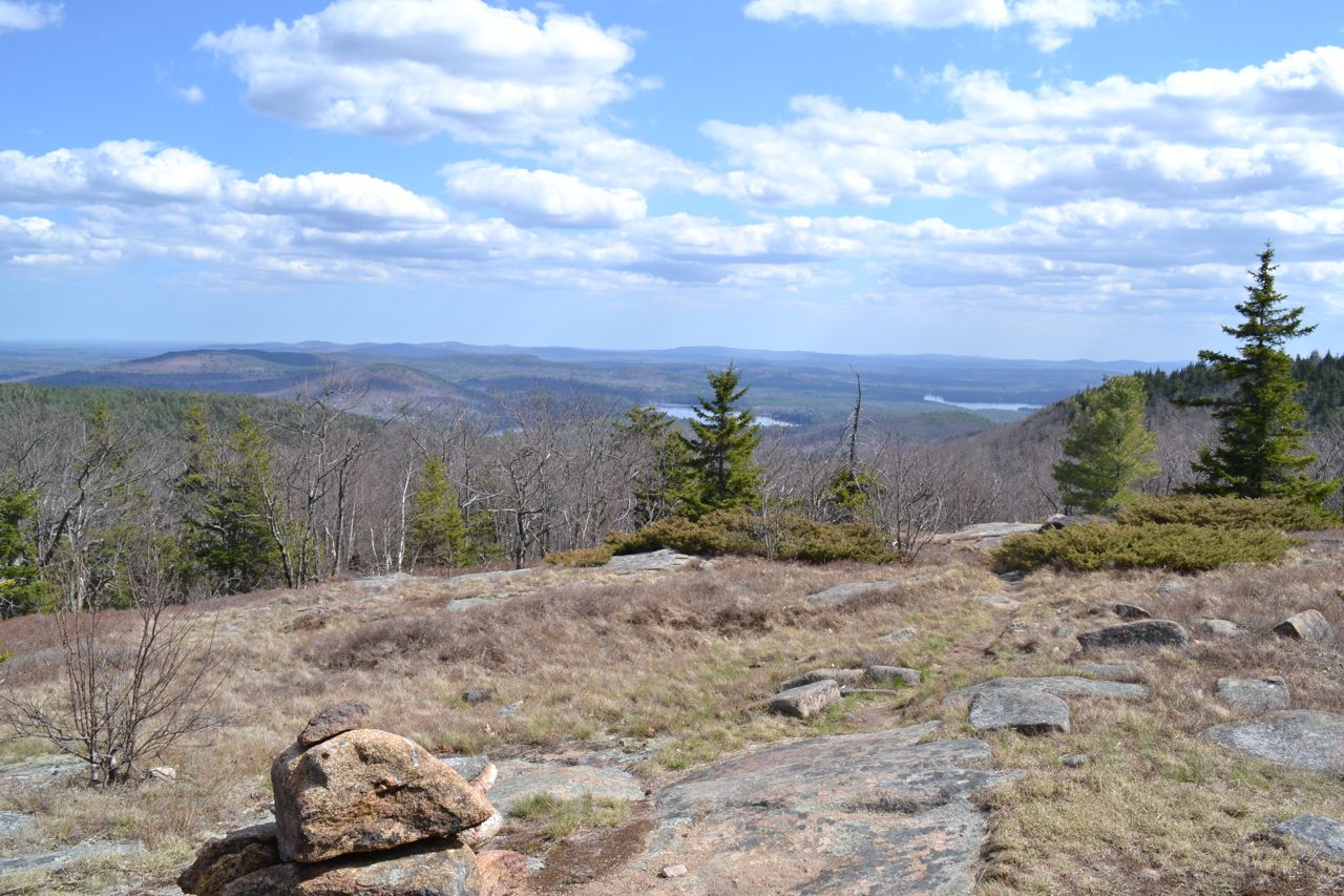 In 0.3 miles from the first viewpoint over the pond, reach a junction with Mount Klem-Mount Mack Loop on the left (this is where you will end the loop over the mountains). Continue straight onto Round Pond-Mount Mack Trail (blazes change to red) and go 0.1 miles to a camp clearing. Turn left onto Mack Ridge Trail (no sign, look for orange blazes). The path becomes narrower and less traveled. It passes a few wet areas, then climbs past two logging roads and landings. It then comes out onto Round Pond-Mount Mack Trail; turn left onto this trail. It climbs steeply 0.3 miles to a cleared viewpoint to the west. From here, you look out to the western Belknap Range: Whiteface, Piper, Belknap, and Gunstock Mountains. You can also see Mt. Kearsarge to the southwest and Mt. Moosilauke to the northwest. The trail then moderates and climbs to a ledge with a wide view to the south. The summit, topped with two communications towers, is reached shortly after that. Bear left onto Mount Klem-Mount Mack Loop. The trail descends easily for 0.4 miles, then begins to climb Mt. Klem. On the way, it crosses a grassy ledge with views toward the Eastern Belknap Range: Rand, Quarry, and Straightback Mountains and Mt. Major. The ascent ends in 0.3 miles at a trail junction near the summit. Here, a white spur trail leads 0.1 miles to the left to the viewless summit of Mt. Klem. If you are trying to earn the Belknap Range Hiker patch, you will need to turn left here and follow the white blazes 0.1 miles to the summit of Mt. Klem. You will probably also want to visit Rand Mountain, most easily accessed from here. Continue straight on the loop trail for 0.1 miles to a superb northern viewpoint over Lake Winnipesaukee. Mt. Moosilauke and the Kinsman Range are seen to the northwest, the Sandwich Range to the north, and the Ossipees to the northeast. Mt. Washington and the southern Presidentials can be seen over the Ossipees. Several other high mountains can be seen peering over ridges. To complete the loop, continue on the trail for 0.9 miles as it descends moderately over a few ledges back to the trail junction at Round Pond.