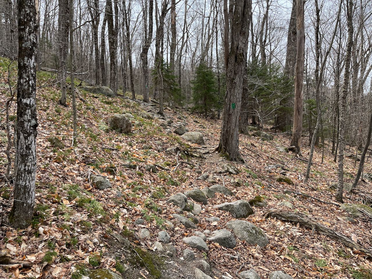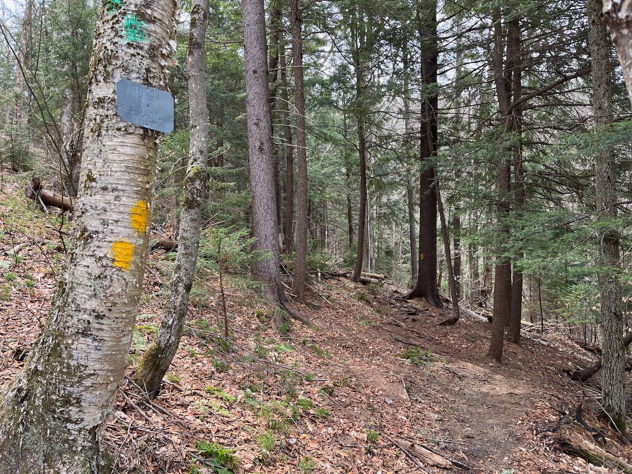 Driving Directions: Trailhead and parking area are on Alpen Hill Road in Franconia, NH. From exit 34C off I-93, drive west on Rt. 18, passing by the entrance to the base lot at Cannon Mountain Ski Area. After 0.8 miles, turn left onto Mittersill Road at a signpost for the Mittersill Alpine Resort. Drive 0.4 miles into the resort complex, and turn left after passing through the parking lot around the main building. Stay straight up the hill, avoiding the roads splitting off to the right. The road bends to the right, climbing the hill, and after about 0.3 miles from the main building, stop in a pull-off at the end of a hairpin turn to the left. The trail will take off at the back of this parking spot. Click here for a Google map.