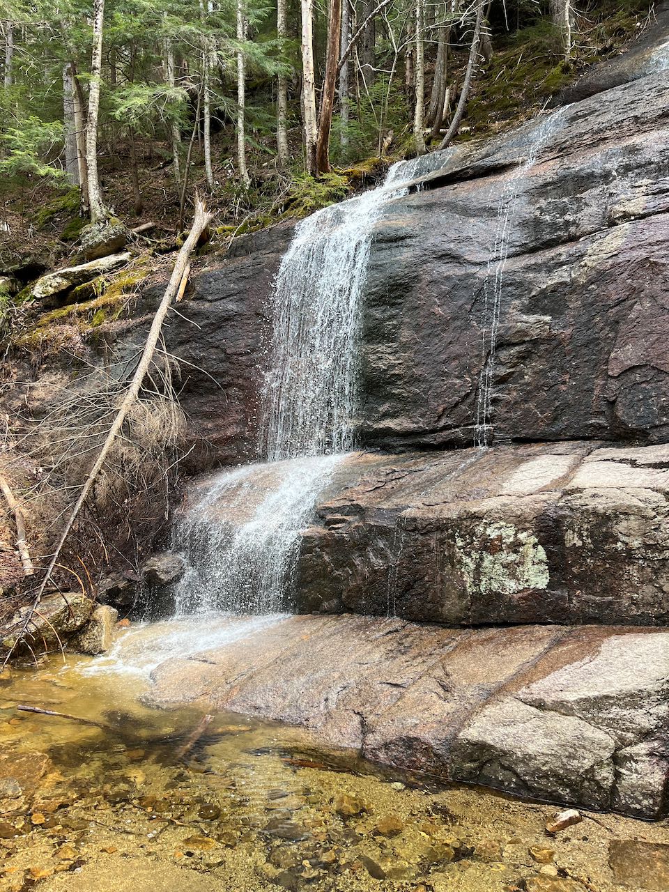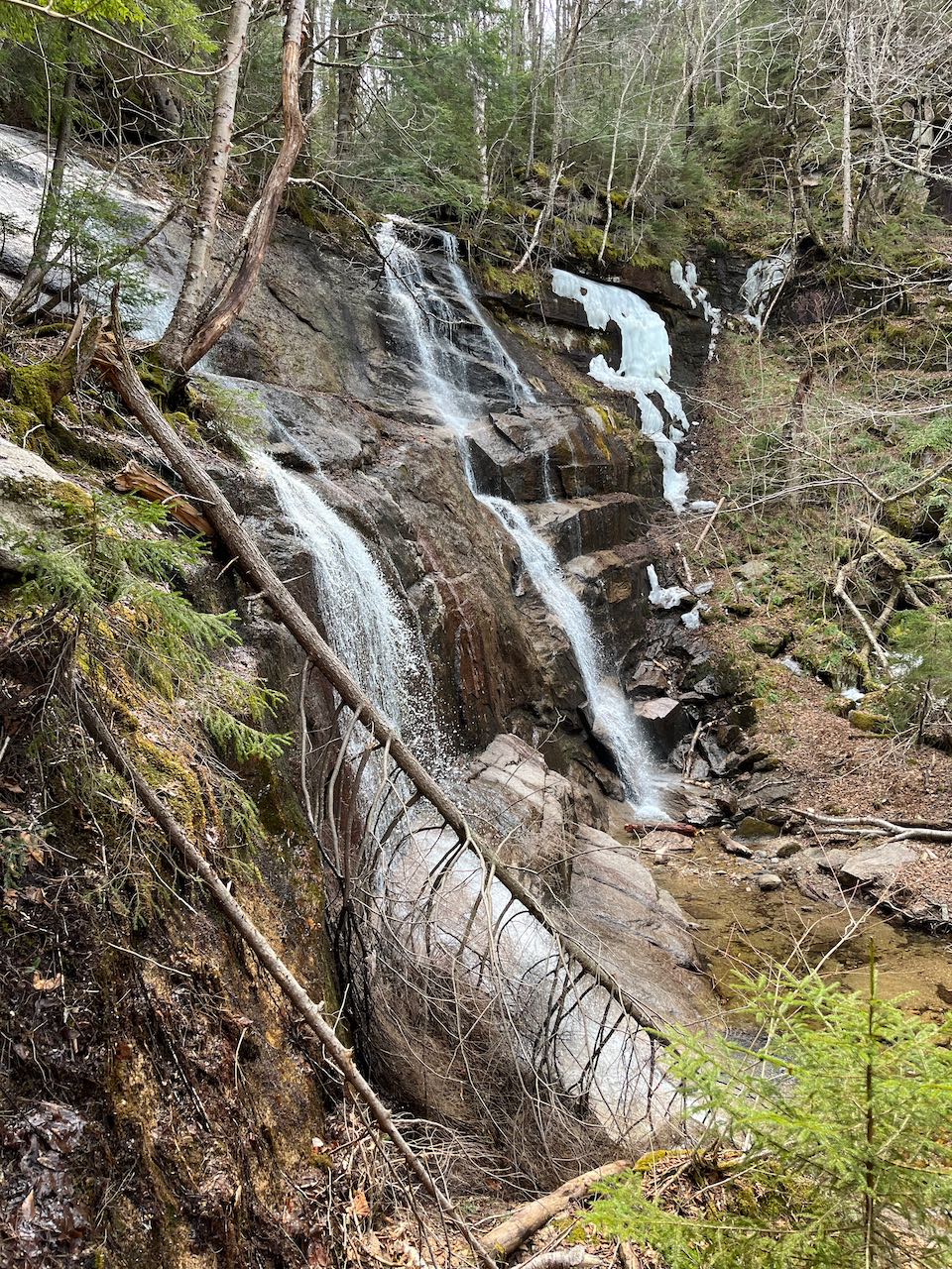 About the Hike: You will not find Noble Falls on any White Mountain tourist brochures, although it may have the scenic potential to qualify. Two factors hold it back from mainstream awareness. First is that to locate it, you must hike on an unofficial, locally maintained path that is not incorporated into the trail network of the national forest. Second is that Noble, also known colloquially as Bridesmaid Falls, due to its proximity to Bridal Veil Falls, is one of those waterfalls that has a narrow window of opportunity in the early spring in which to view it in its proper glory. Otherwise, the greater portion of the brook that generates it will be dried up. But if you have the chance to find it in April or May while the snow is still melting, the full height of Noble Falls is a stunning sight to rival many acclaimed White Mountain waterfalls.