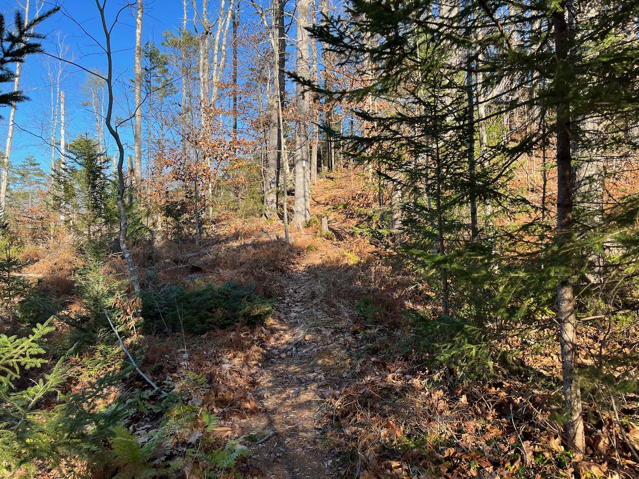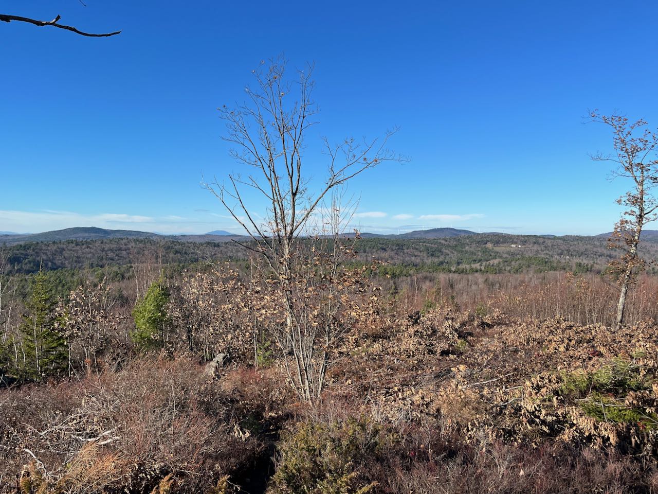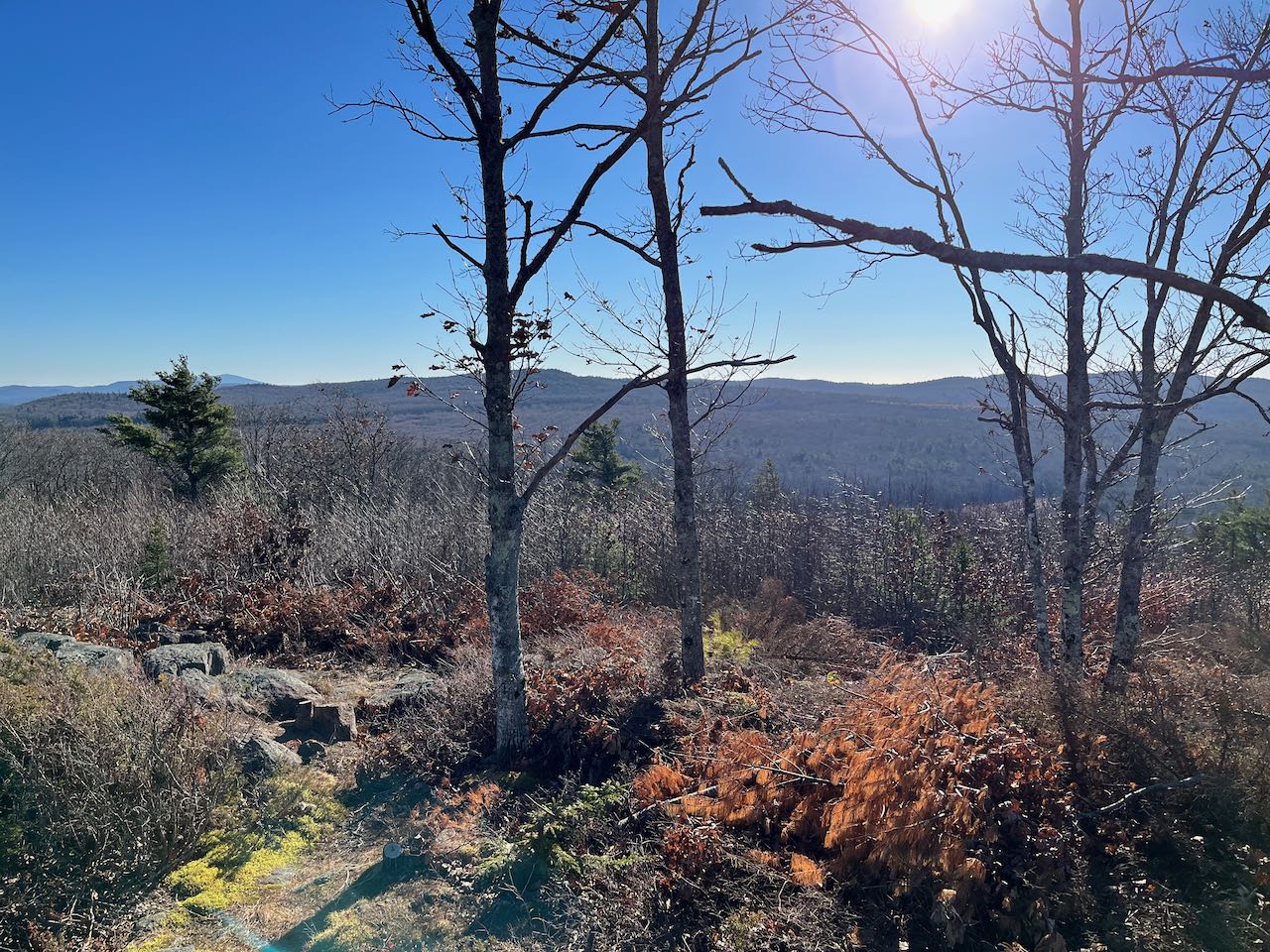 From your parking spot at the gate, head down the logging road, passing by a house and walking downhill for 0.15 miles into regrowing stands of trees. The summit of the hill is seen over the treetops. You will spend the entire hike in and around various stages of logging activity. Take a left off the road at an arrow sign and makeshift bridge and cross over a stone wall. Passing a conservation land marker, the pathway follows the stone wall for a bit, slides beside a boulder, and crosses a little stream after another 0.15 miles. Having reached the foot of the hill, the trail begins uphill gradually, soon crossing through open logging areas. Weaving through bands of trees in between the openings, the trail nears the base of the view clearing around the top in 0.3 miles. Steepening, it ascends on a straight course up the rocky hillside, soon breaking into the open and reaching the picturesque summit amidst a grove of oak trees in 0.15 miles.
