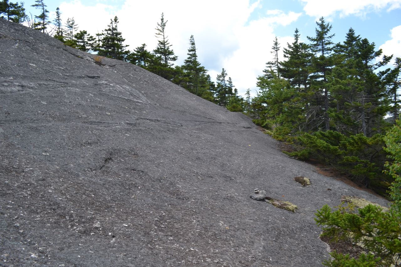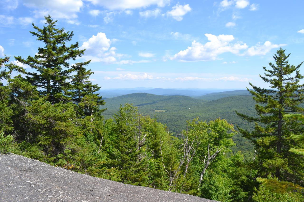 The trail ascends very gradually through the forest for 0.6 miles, crosses Clark Trail, then descends 150 feet to cross a brook. It now begins to climb more steeply, switchbacking rapidly up the mountainside. After a bit of climbing, the trail enters a mossy conifer forest and proceeds out onto the first ledges, where there is a good view to the south. The trail continues up through the forest, then continues back out onto exposed ledges. Soon after crossing a huge, sloping ledge, the trail reaches a junction with Skyland Trail, where there are wide views to the north and east. The rocky dome of Mt. Cardigan rises above you to the north, with its sub-peak Firescrew to the left. To the northeast is a good perspective of the White Mountains. To the east, in the distance, is the Ossipee Range, with Newfound Lake in front to the right. This spot offers the best place to sit down and enjoy the view, but there are more views at the summit. Bear right onto Skyland Trail and continue a short distance to the summit. Here, follow a herd path to the left and up onto another ledge with a view to the southwest at Ragged Mountain and Mt. Kearsarge.