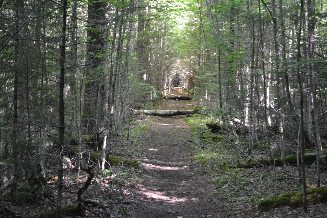 The lengthy trek begins at the Lincoln Woods parking area. Walk to the end of the parking area and onto the deck of the visitor center. Turn left at the trail signs and walk down the stairs onto a gravel connecting path. Turn left, then right and cross the iconic suspension bridge over the East Branch of the Pemigewasset River, a much larger and wilder waterway than the "main" branch of the Pemigewasset River. On the other side, turn right and follow the very wide and flat Lincoln Woods Trail as it follows the East Branch on the bed of an old logging railroad, last operated in 1948. The first mile is mostly over graded surface, but soon after, the pathway becomes studded with railroad ties. At 0.7 miles, the trail goes along a fence atop a washed-out bank, which provides a nice spot to look out over the river. Just beyond, the trail passes over Osseo Brook as it drains into the East Branch and proceeds to parallel it. The trail continues next to Osseo Brook for 0.6 miles before the brook diverges to the left, followed by the Osseo Trail. At this junction is an informative sign about logging artifacts which may be found in the forest. Just after this, the trail passes a clearing from a logging camp on the left. In another 0.2 miles, the trail reaches its second viewpoint over the river, next to a long piece of rail. Bondcliff's south spur rises prominently above the river, with the summit of Bondcliff to its left. The trail then crosses Birch Island Brook on a bridge and continues very straight for 0.9 miles. After this section, Black Pond Trail goes left. A short distance past this, two signs mark a 200-foot interval where hikers are given the opportunity to measure their stride. Franconia Falls Trail goes left soon after (0.3 miles since Black Pond Trail), and Lincoln Woods Trail crosses a bridge over Franconia Brook built around the remains of a railroad trestle, enters the Pemigewasset Wilderness, and dead-ends at a fork.