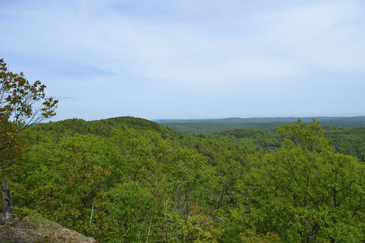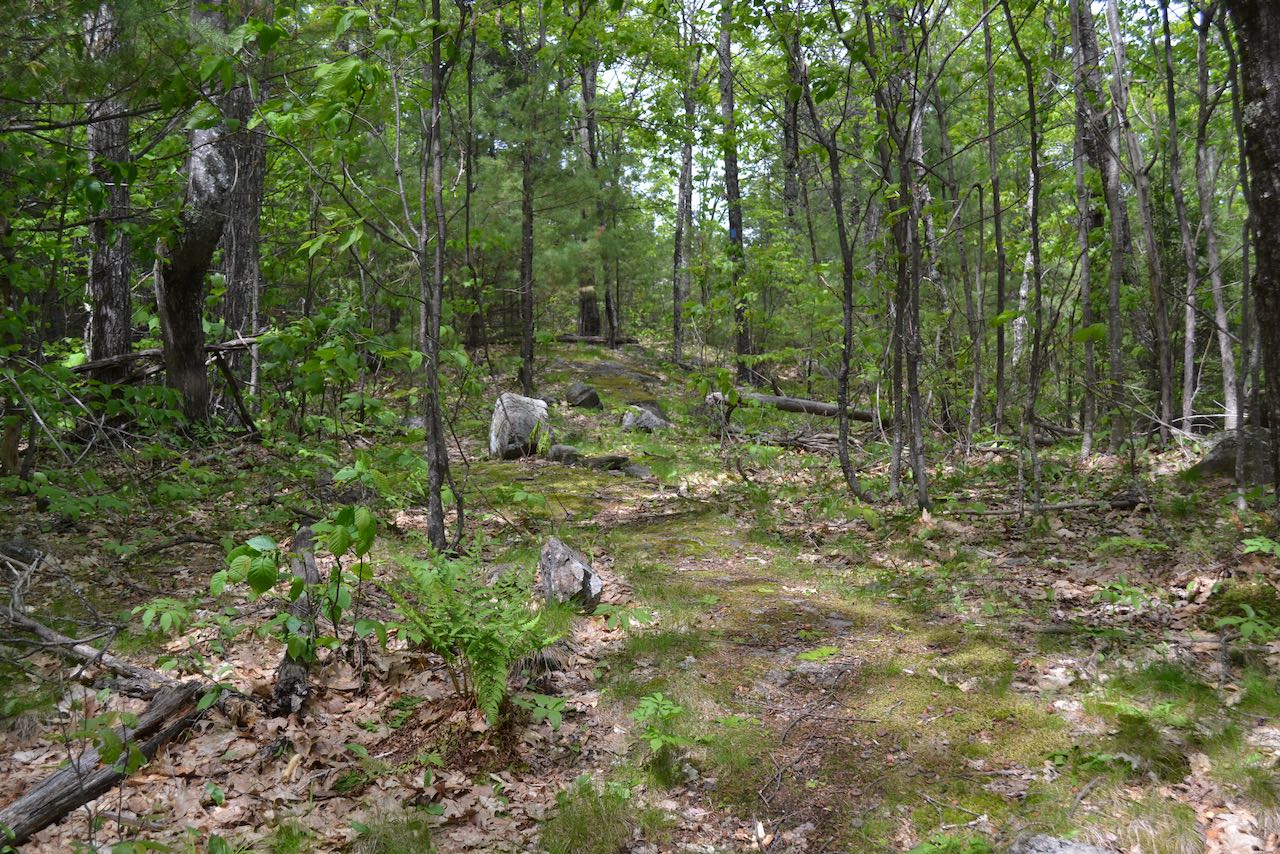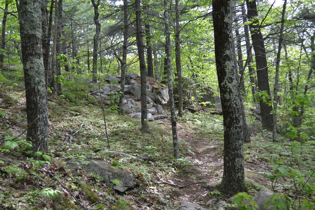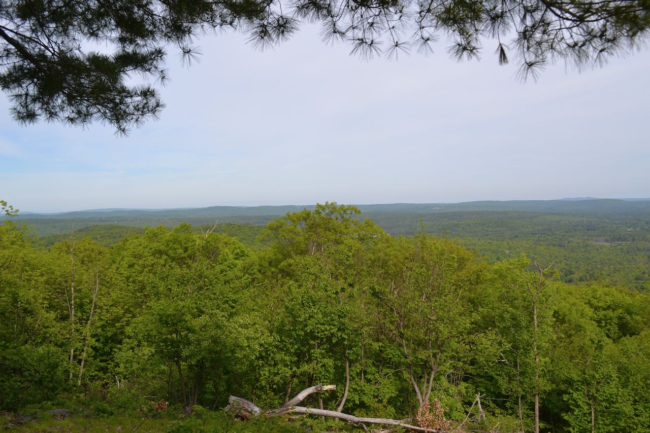 Return the way you came all the way back to the junction of Burrows Farm Trail and North Trail (this was where you turned right 0.35 miles from the parking lot). Turn right to continue on Burrows Farm Trail (left is the way you originally came), and follow the road up a slight incline, near the brook. After 0.3 miles, the road crosses a bridge over the brook and continues 0.2 miles further to a junction. Ahead, the road continues as Moose Mountains Trail. This more strenuous hike leads 0.8 miles up to the ridgetop of Moose Mountain, where there is an extensive ledgy area with a pitch pine community and limited views. Turn left to stay on Burrows Farm Trail and follow it just over 0.1 miles into a large open field, where the trail passes by a plaque marking the site of the Burrows Farm, along with the Burrows Cemetery. Looking ahead over the clearing, you can see the minor hill of Phoebes Nable Mountain, which will be your final destination. Continue on the old road across the field for another 0.1 miles, then fork left onto the Phoebes Nable Loop. This trail leads toward the edge of the field and enters the woods. It goes slightly uphill, then swings left and runs across the hillside before making two great, sweeping turns on gentle grades with well-constructed stone steps to attain the summit after 0.6 miles. At the top, you will arrive in a clearing with a nice view to the south, overlooking a similar scene to what you saw from Beauty Ledge. The trail continues past the summit and descends moderately straight downhill for a quarter mile, then swings right and angles downward across the hillside for 0.2 miles more before making a final switchback and bringing you back to the parking area in another 0.1 miles.