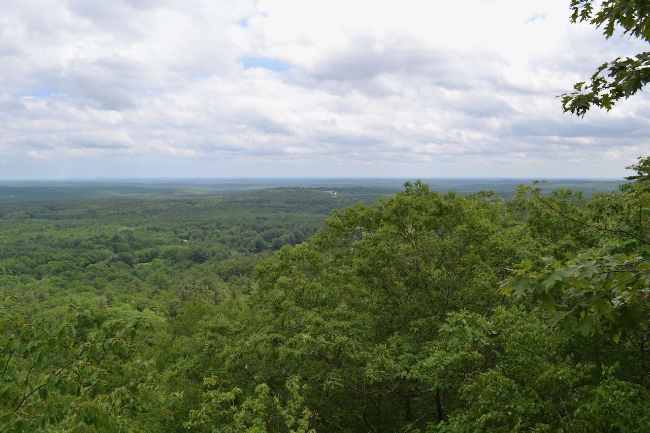 Continue beyond the summit and begin descending the other side of the mountain. In 0.1 miles, the trail passes through one large ledgy clearing followed soon after by another. A quarter mile down from the top, the trail swings to the left and runs across the ridge to another ledgy area. It then turns back to the right and takes gradual terrain down for the last 0.35 miles to the "South Ledges". Views begin to appear as you approach the steep edge of the ridge, and then the best views open when you arrive at the wide open viewpoint. A great view over Bow Lake is had here. The closest hill behind the lake is Saddleback Mountain, and behind that to the left are the three Pawtuckaway Mountains. If you look to the right of the lake in the distance, you can see Mt. Wachusett over in Massachusetts.