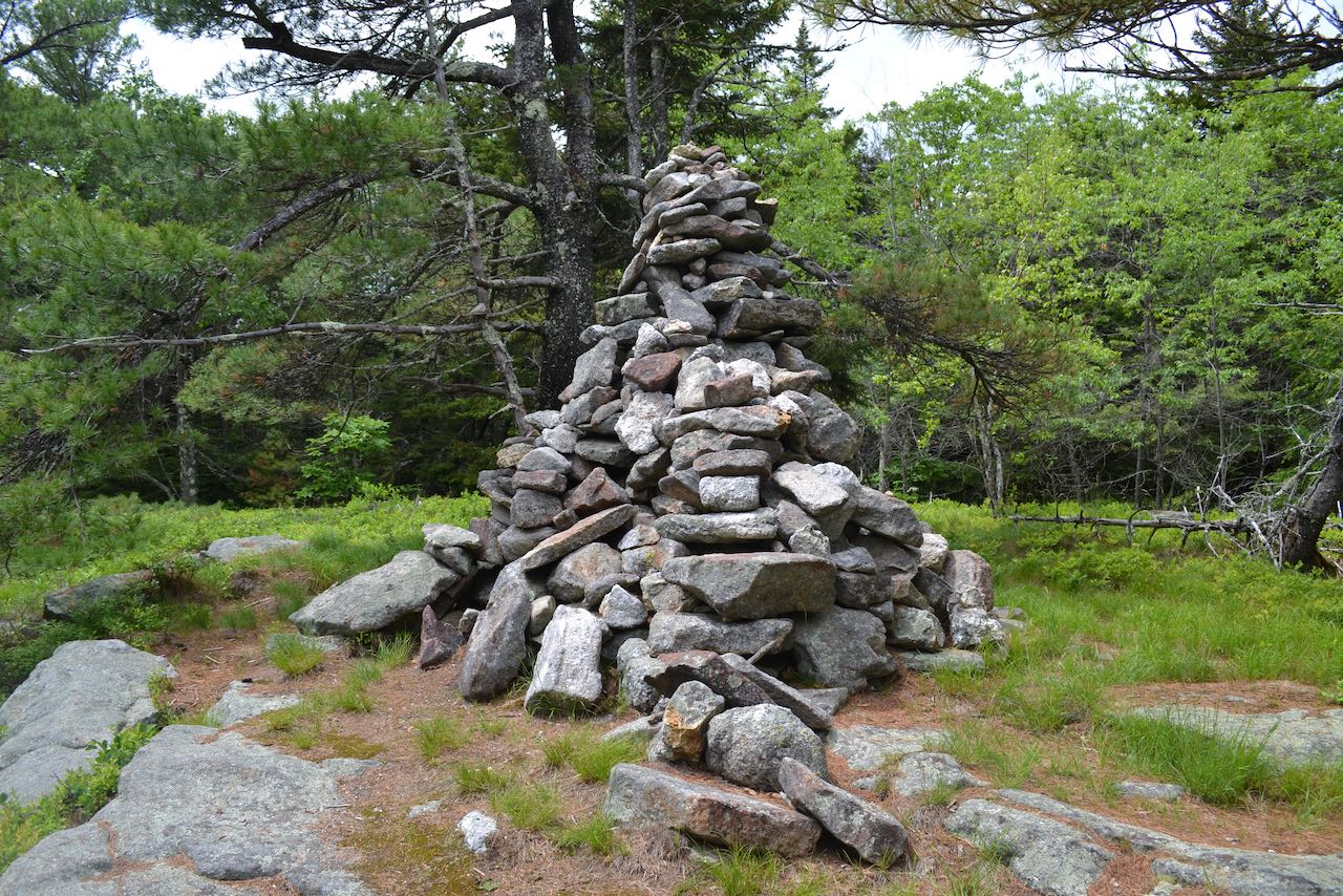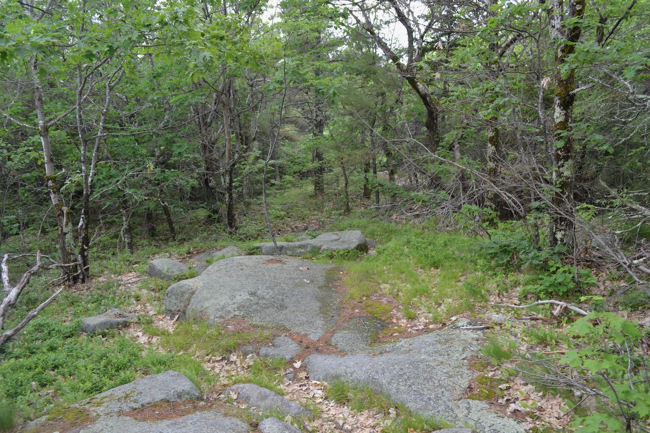 Starting at the sign, follow the Spencer Smith Trail into the woods past a gate. The wide track rises uphill mildly for 0.2 miles, then shoots up the hillside more aggressively. After another 0.1 miles, an opening appears on the left providing a modest view out to the east. Continuing to grind uphill, the trail becomes washed-out in several sections, where foot traffic has beaten out paths around the worst of it. After just another 0.1 miles, the rough climbing is already over and the trail levels off atop the lengthy plateau leading north from the summit. Enjoy the easy stroll along the crest, with intermingled forest and ledges. The trail soon passes through a sparse opening carpeted with blueberry bushes. Ragged red pines characterize the environment. You can see more limited views to the east and southeast once again. Continuing to be level, the trail goes through some more wooded areas, and then ledges dominate again as the trail comes up on an intersection in a clearing after 0.4 miles over the crest. You have a more open view from here. Link Trail joins from the left here; turn right and continue on Spencer Smith Trail. 0.35 miles through intermittent ledges, grassy areas, and hemlock stands follows to reach the summit, where you will see a large cairn.