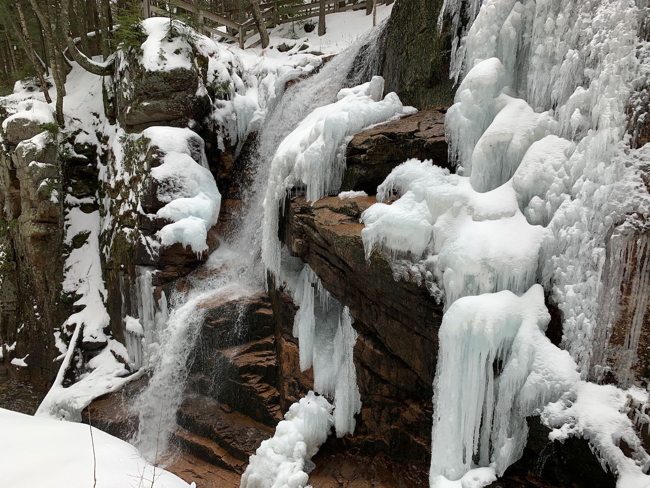 About the Hike: The Flume Gorge is one of the White Mountains' premiere tourist attractions. Each summer possibly millions of people experience the thrill of traversing the boardwalk between the vertiginous rock walls of the gorge. The park encompasses three notable waterfalls, each being among New Hampshire's most scenic. The Flume is famous for good reason, and its incredible natural beauty has cemented its iconic place in the minds of many. An entrance fee is collected at the visitor center during the in-season (see the State Parks page for details), but access is allowed when the park is not operating. This makes the winter season potentially the best time to visit the Flume. Those who visit in the cold season will gain a host of different scenic experiences, foremost being the awe-inspiring ice masses that form on the walls of the gorge. Depending on the weather conditions, some of the waterfalls may freeze over as well. One important note is that despite being graded tourist paths, the steeper parts of trail through the Flume can become slippery with snowpack, so you may want to be prepared with traction devices.