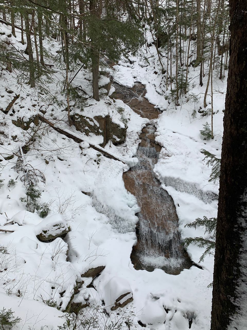 The winter scene is quite one-of-a-kind here. Toward the bottom, snow drapes over the precipitous hillsides, blanketing over the green mosses. The boardwalk switches sides of the gorge, then runs a little further before reaching the point where it is disassembled at the end of each season. From here, you can gaze up through the higher part of the gorge, where ice will dominate, forming countless giant icicles as it migrates from the top of the cliffs to the bottom. Summer visitors would continue up the boardwalk here at it switches sides again and climbs up alongside Avalanche Falls. Turn around here and return to the bridge. Cross the brook and follow path up through the woods, swinging away from the brook and then toward it again. It soon follows along a fence keeping it back from the edge of the gorge. Stay toward the fence, avoiding an abandoned trail cutting off to the left. In a quarter mile, you'll reach a junction where the main loop turns left. Stay straight toward the head of the gorge, now back on the main trail coming from the boardwalk. A path on the right leads down to a viewing area at the top of Avalanche Falls. You can feel up close and personal with the waterfall here as it plunges over the edge of the cliff, as well as peer down into the gorge. You can also get a nice side view of the falls. Head back up and cross the bridge over the brook. Descend the staircase into the top of the gorge (use caution, as the steps may be buried in snow) and follow the boardwalk down to where it will again be blocked off. You can get fairly close to the falls here and observe the whole of the drop - nearly vertical as it careens over blocky ledge. This is also the best place to observe the ice, which will be close up to the boardwalk here.