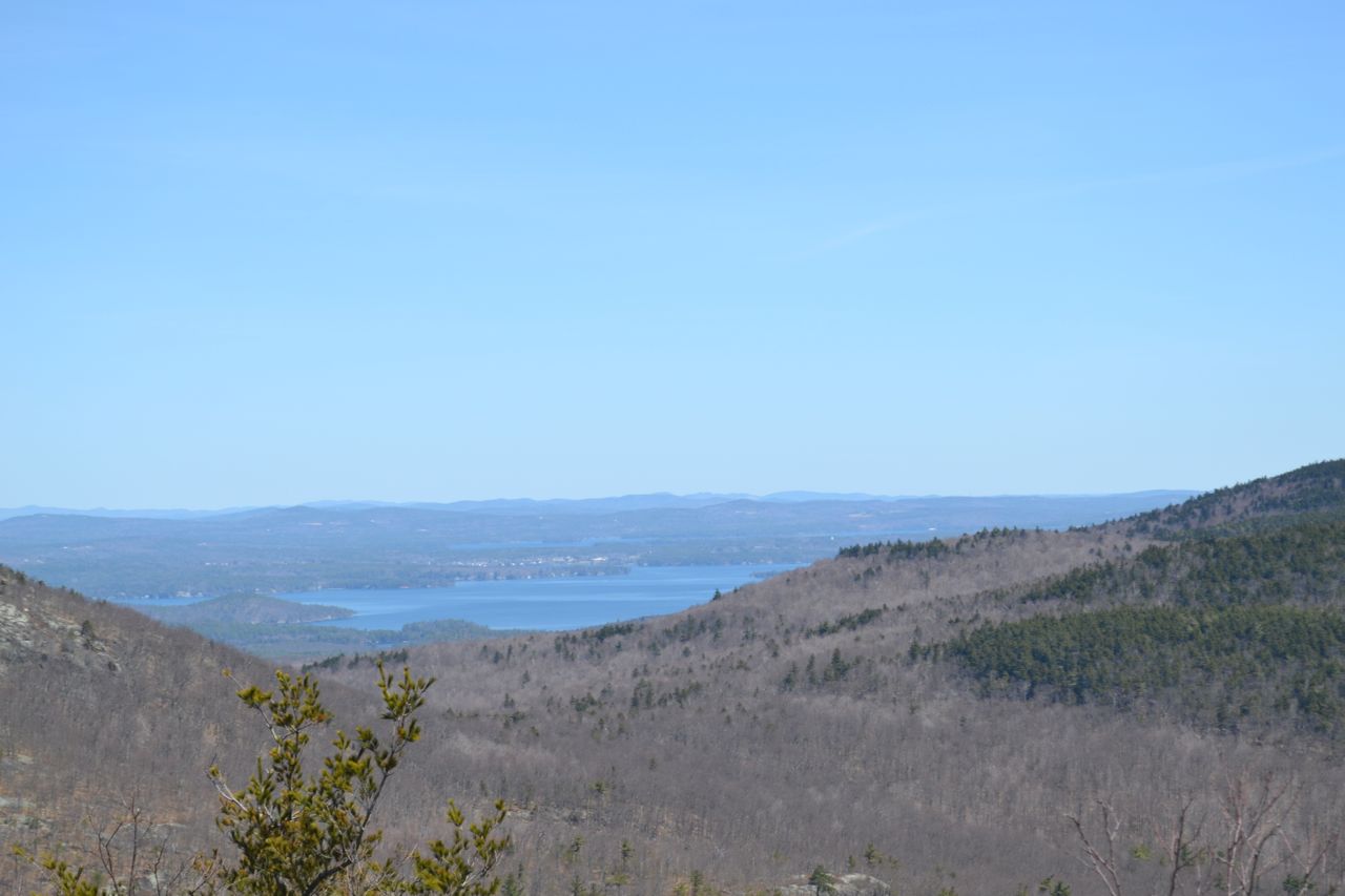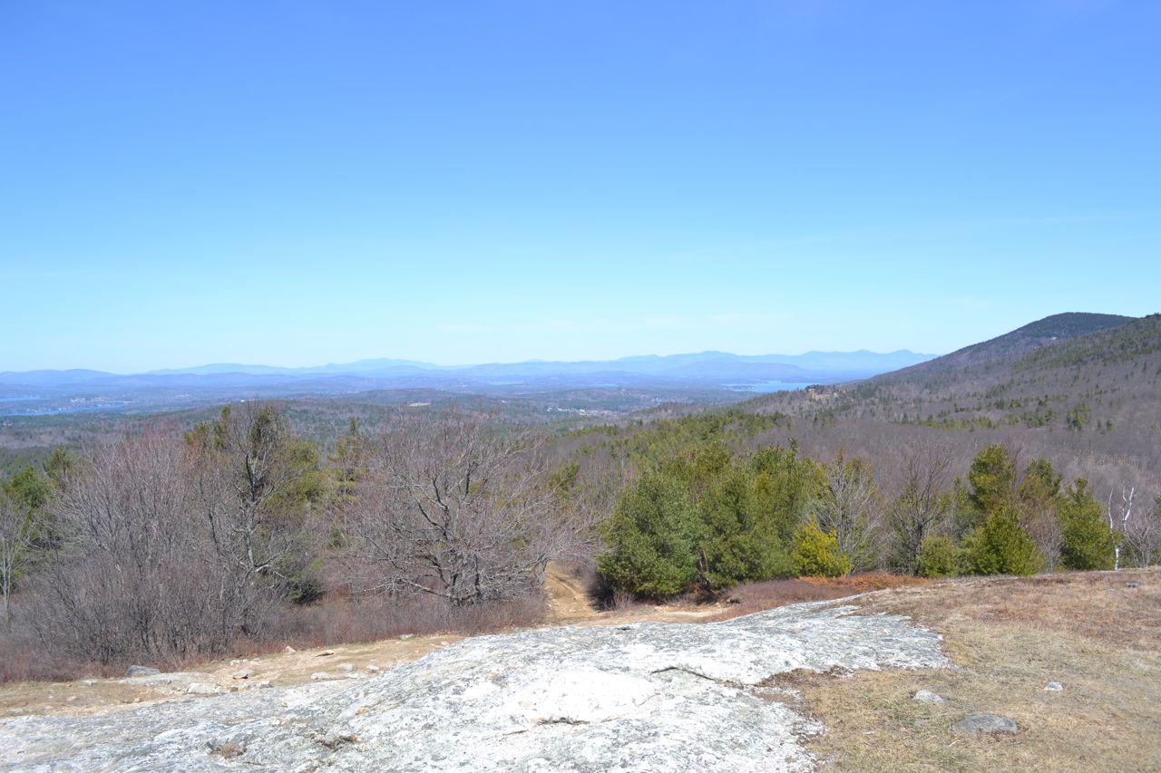 To continue to Piper Mountain, return to the junction and keep going onto Piper-Whiteface Link as it continues climbing gradually though the forest, following bright green blazes. Soon, the trail enters open ledges. As you climb, look back for views to the south and west. Just before the trail ends, it leaves the rock and heads back into the forest. In 0.6 miles from the trail junction, Vista Trail turns right. For now, bear left to continue along the trail to the summit for a short distance to reach a good viewpoint toward neighboring Belknap Mountain and part of Lake Winnipesaukee. The viewless summit is just a short walk further up the trail. Back at the junction, take the Vista Trail to get to the best viewpoint. This trail meanders 0.4 miles down over expansive ledges to an east-facing viewpoint, identified by a rock bench. Here, you look over the eastern Belknap Range and nearby lakes. Swett Mountain Trail continues straight to access Swett Mountain. Turn around and return the way you came.