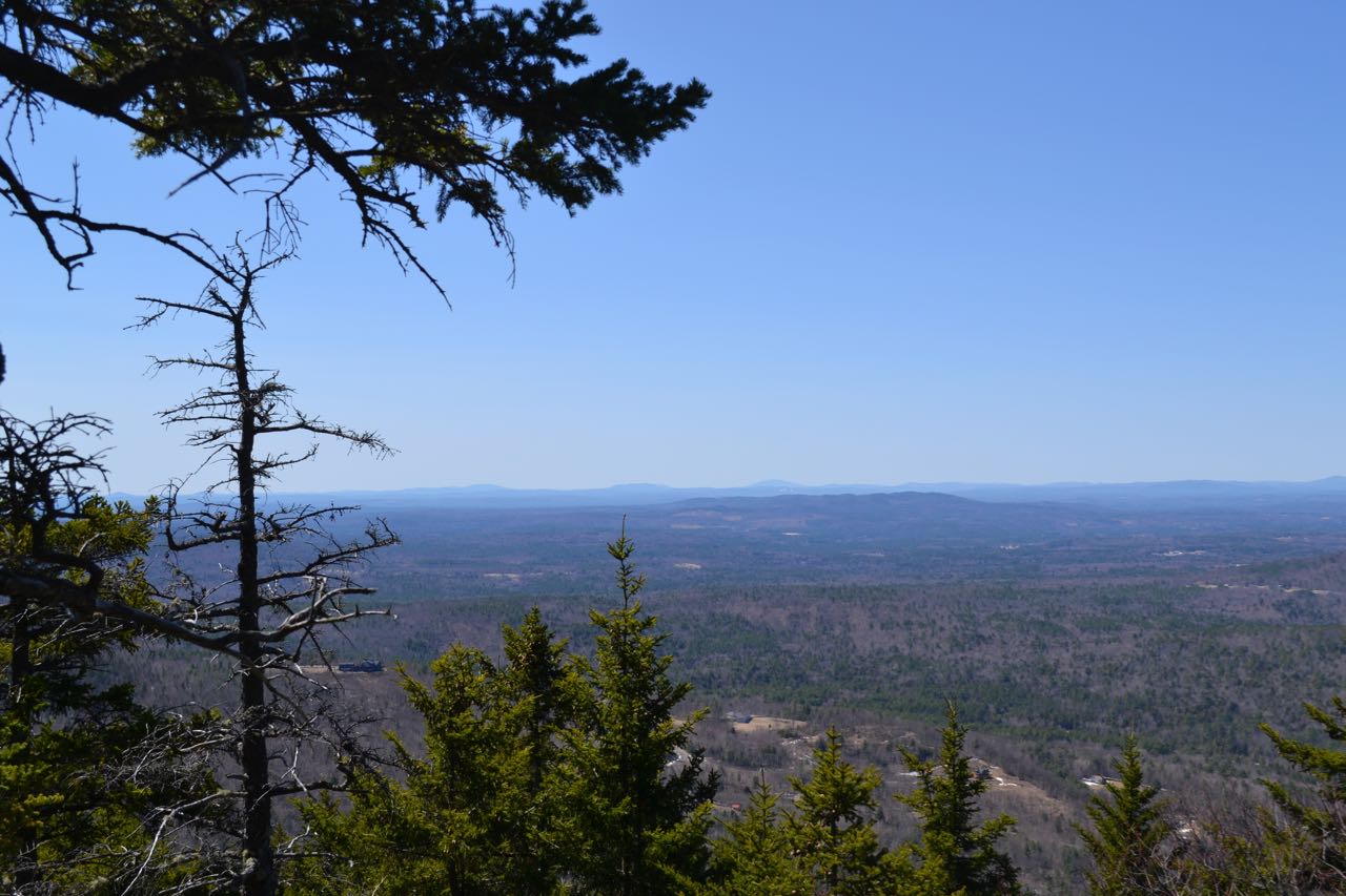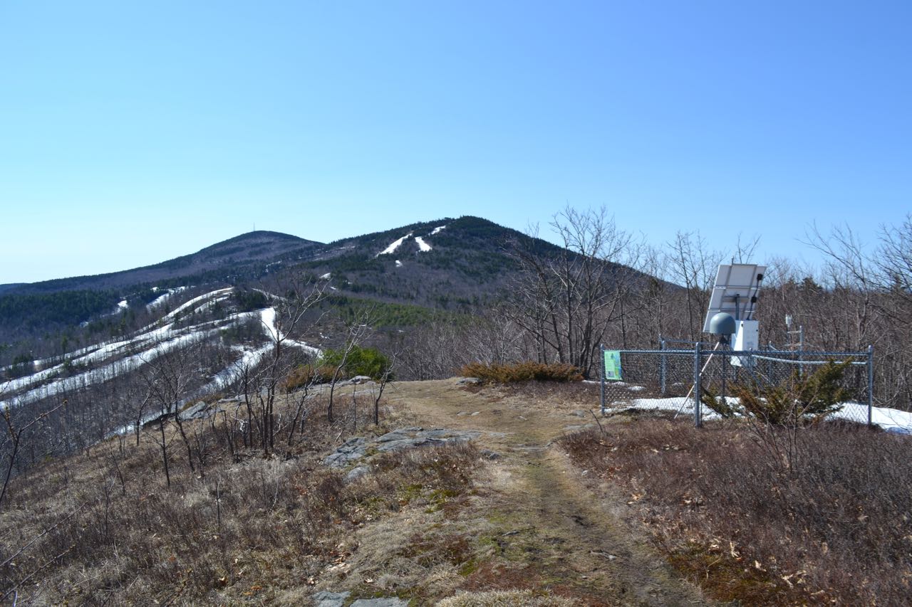 The trail continues a gradual descent past the clearing, and at 0.4 miles past the summit, bear left at a junction with Mt. Rowe Trail, continuing on Ridge Trail. The trail descends quickly to a col, then climbs again, soon reaching another semi-open area with views back to Mt. Rowe. Just past this viewpoint, the trail reaches a ski trail and climbs moderately in the woods alongside it. After passing Benjamin Weeks Trail on the right and going by the top of the Tiger Triple Chairlift, the trail begins to pull away from the ski trail. It soon begins switchbacks through the fairly steep, dark woods. After 0.7 miles of climbing, the trail turns further away from the ski area and begins to contour across the slope. It becomes rockier and traverses with minor undulations. In 0.2 miles more, you will be rewarded with a good viewpoint to the north and northwest. This viewpoint takes in the southwestern White Mountains, including Carr Mountain, Mt. Moosilauke, and the Kinsman Range, and the Sandwich Range, beyond Lake Winnipesaukee and Squam Lake. Continue 0.1 miles and the trail intersects Winter Shortcut. Turn left and head uphill just a few steps, where Gunstock Mountain Trail comes in from the right. Notice a rocky viewpoint next to this trail. This outlook offers a vista to the southwest and includes many distant peaks, including Killington Peak, Mt. Monadnock, Mt. Kearsarge, Mt. Cardigan, and several others. Both of these outlooks view different directions than the summit view. Continue another 0.2 miles on this trail to the summit. You will pass Brook Trail, your descent route, on the right, then emerge on a ski trail just below the summit.