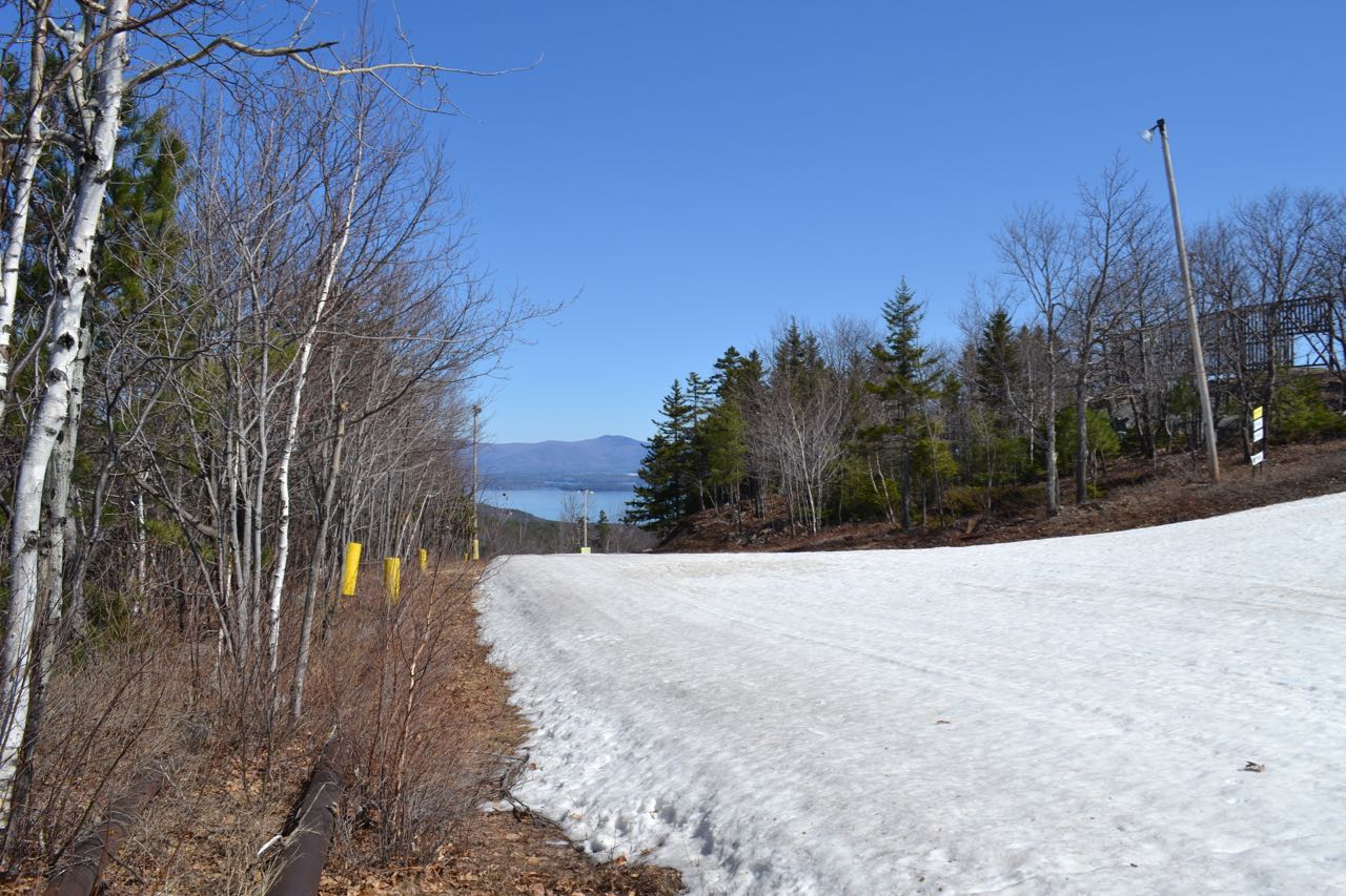 Head down to the observation deck for picnic tables and a good place to enjoy the view. Gunstock's summit panorama presents a sweeping perspective on Lake Winnipesaukee. The view is best to the northeast, toward Green Mountain. The Ossipee Range is in full view to the north across the lake. The Sandwich Range appears to the left, but is restricted by trees. By moving up to the Panorama Chairlift, you can see across to nearby Belknap Mountain and its towers. To descend, walk back down the ski trail and enter the woods the way you came up, then fork left onto Brook Trail. The trail descends moderately through the woods near the ski trail for 0.3 miles, then reaches a junction with Saddle Trail (this trail can be used to make a side trip to Belknap Mountain). The trail continues its descent at a distance from the ski trail for 0.3 miles more, then swings back toward it and emerges at the edge of it. Head directly across this ski trail and follow a short connecter ski trail to another one. Look for the trail entering the woods just to the left of a snowmaking gun and the entrance to a ski glade. The trail descends through the woods along seasonal streams before swinging to the right and following the east wall of a drainage between ski trails. Look through the trees when the water is high for glimpses of small cascades in the bubbling brook. The trail soon enters the ski glade from the left. Stay on this side of the glade and follow it to its end at a ski trail. Just before emerging onto the ski trail, the path bears left and stays in the narrowing patch of woods between two ski trails. Brook Trail finally crosses the ski trail 0.7 miles from the last one. Head straight across and follow the trail back into the woods. In 0.2 miles, it descends to cross another brook, but quickly crosses back, so both crossings can be avoided if desired. It then crosses another ski trail into a final patch of forest between ski trails. It descends through this one for 0.2 miles, crossing one brook, then emerges on a ski trail near the base area. Continue into the open, where you have a clear view back to the summits of both Gunstock and Rowe and you may contemplate the delightful trek which you have just completed.