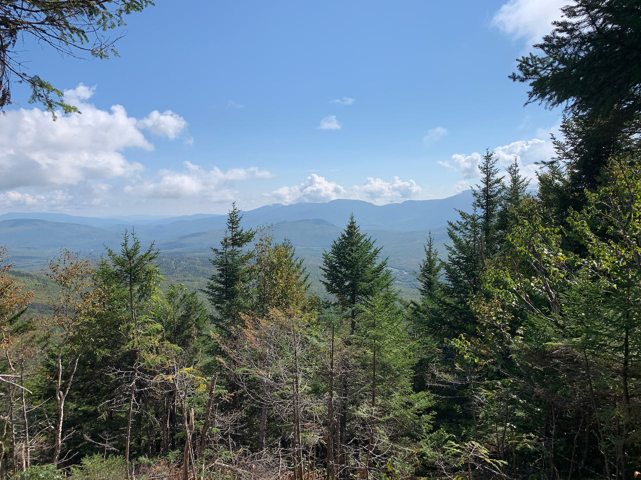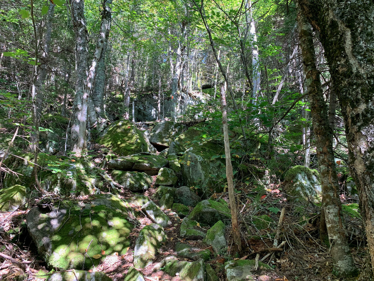 Head back up to the Crescent Ridge Trail and continue through a slot in between boulders onto a level forest path. In 0.15 miles, take a right to stay on the Crescent Ridge Trail as Sargent Path continues straight. The trail meanders gently through the bright, verdant forest, cutting a corridor through the ferns. In a quarter mile, Four Soldiers Path crosses perpendicular. Continue straight. The grade soon steepens, and the trail negotiates a few sharp pitches through a salad of boulders. A brief interlude of more ferns and birch trees follows. One more brief scramble up a boulder chute leads to a ledge ramp with a view back toward Adams and Madison, a total of 0.4 miles from the last trail junction. The view is from a higher perspective, although it is much less open than what you saw from Lookout Ledge. Just a bit further back into the forest, a sign on a tree amidst a dark conifer grove marks the summit of Mt. Randolph, although there is a higher peak half a mile to the north on the ridge which could properly be called the summit. With nothing to see here, follow the trail about 200 feet beyond the high point down to where the trail crews have graciously cleared an opening facing east over the bowl forming by the curling Crescent Ridge. Over the treetops, you gaze across to the summit of Crescent, not far away, with the distant Mahoosuc Range beyond. A greater portion of it is visible now than was seen from Lookout Ledge, including the high peaks in Maine of Old Speck and Goose Eye. The view reaches a good distance across the Androscoggin River Valley into Maine. Over to the right, you can see back toward the Moriah group behind Pine Mountain.