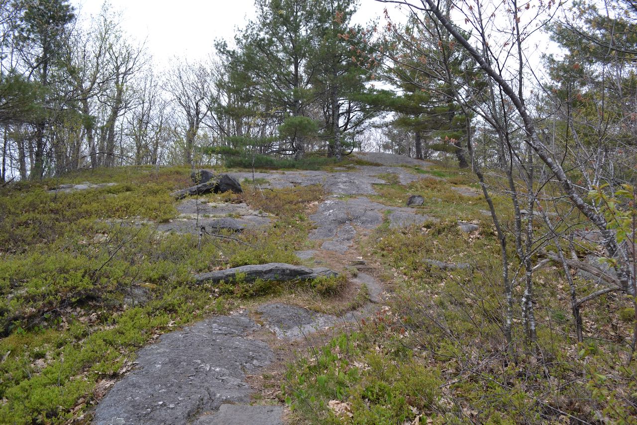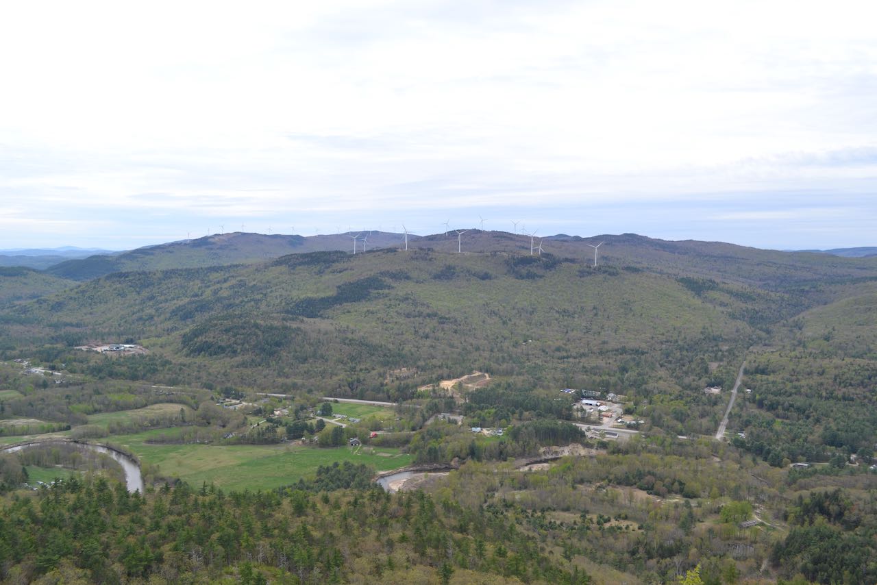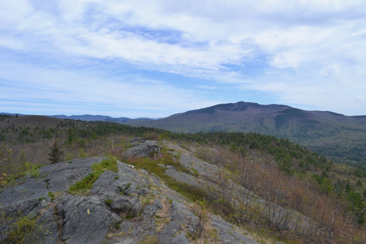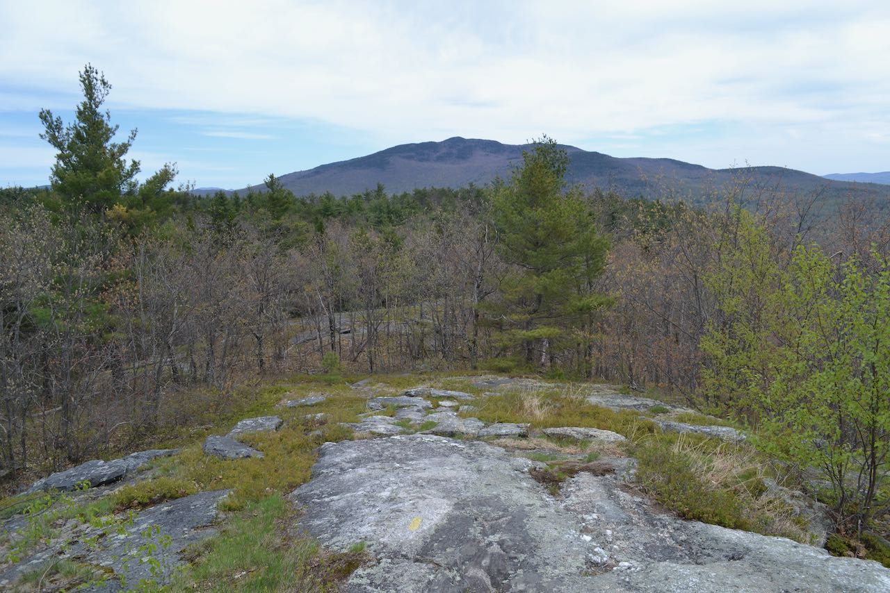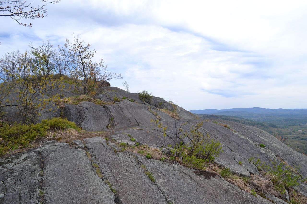 Across the way are the modest-sized mountains which house an extensive wind farm, the tallest being Tenney Mountain. A geometric four-way in the roads points into the Groton Hollow, a passage through the mountains. Further to the right, recognizeable Mt. Cardigan rises in the distance over the landscape around some of its spur mountains. Down below the wind towers, the graceful Baker River weaves through the fields and open spaces in Rumney Village. The streets and houses fade into the distance as the view extends out the valley, with a number of hills in the distance, including the Belknap Range furthest out on the right side. Bits and pieces of the Ossipee and Squam Ranges can be seen to the left, appearing as broad, rolling hills. As you continue around the corner toward the top, Stinson Mountain comes into view, just on the other side of town. To its left, looking right over the trail, a few distant summits can be seen which include Mt. Hancock and Scar Ridge. Multiple peaks of Mt. Kineo trail off to the left. Furthest over, of course, you can see the ridgeline continue up towards Carr Mountain. The best views are seen before you cross over the top; then the trail continues out in the open for a way, then dips down into the woods. It runs over more ledge ramps, then in 0.2 miles hops up over a knob with the last view of the trip. Descend 0.1 miles to the base of the summit cone and turn left, passing the loop junction, and return down the way you came.
